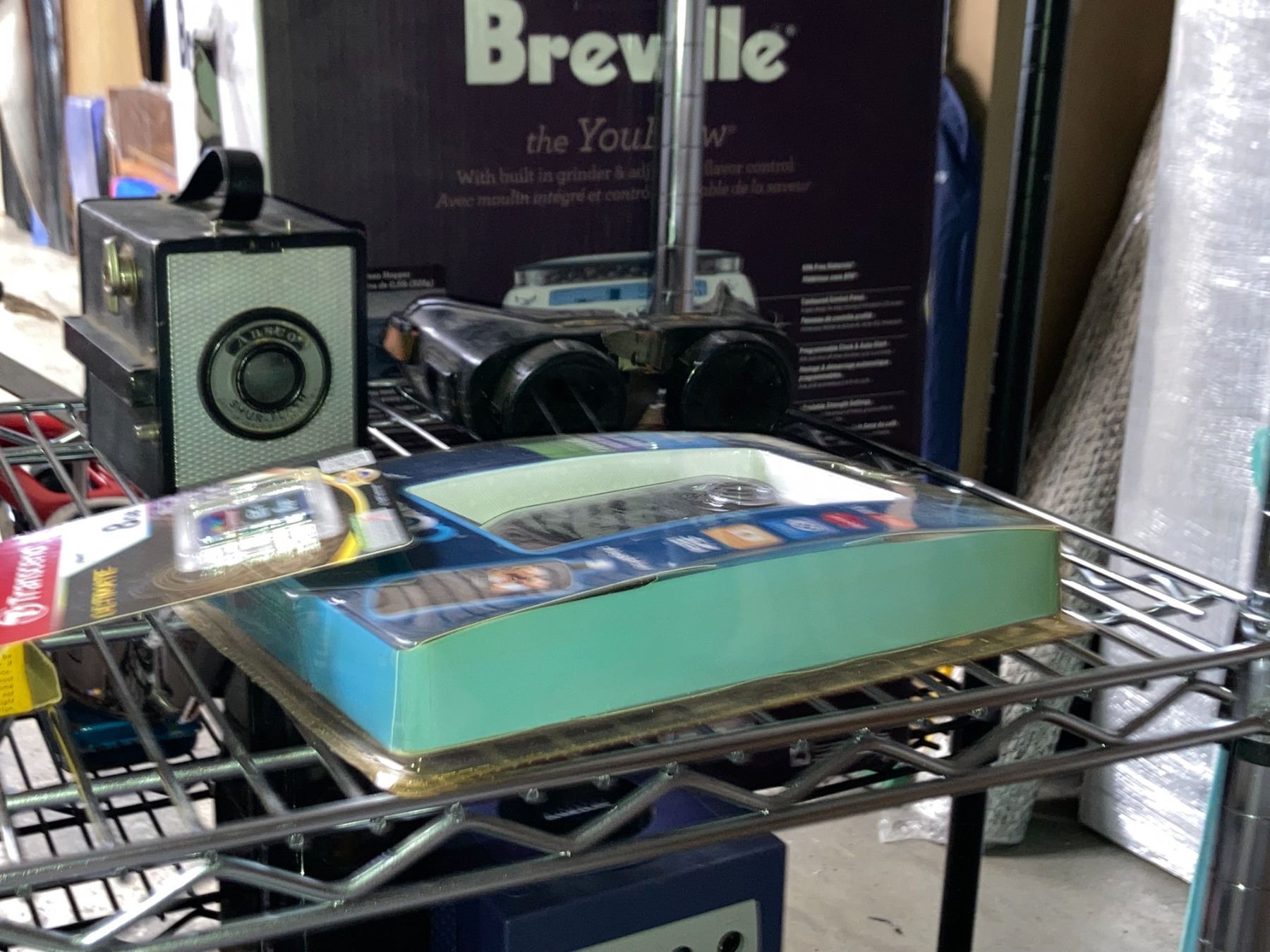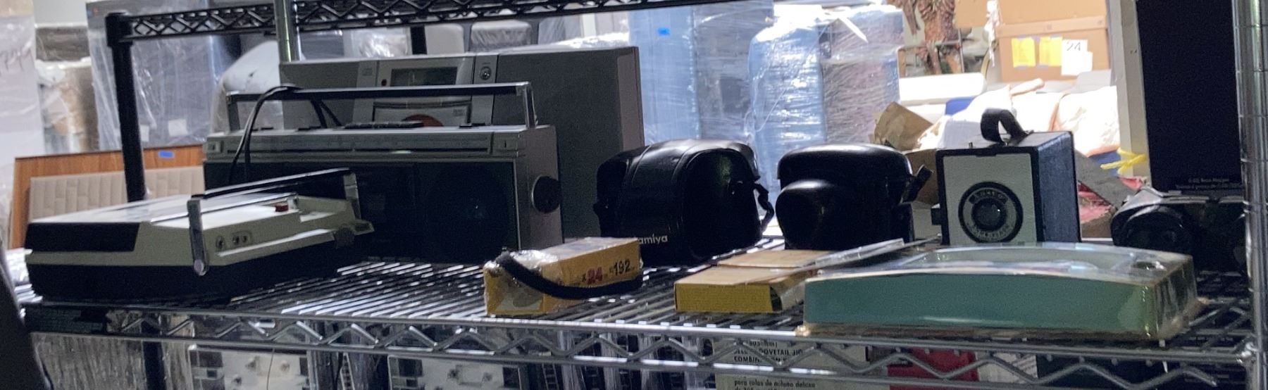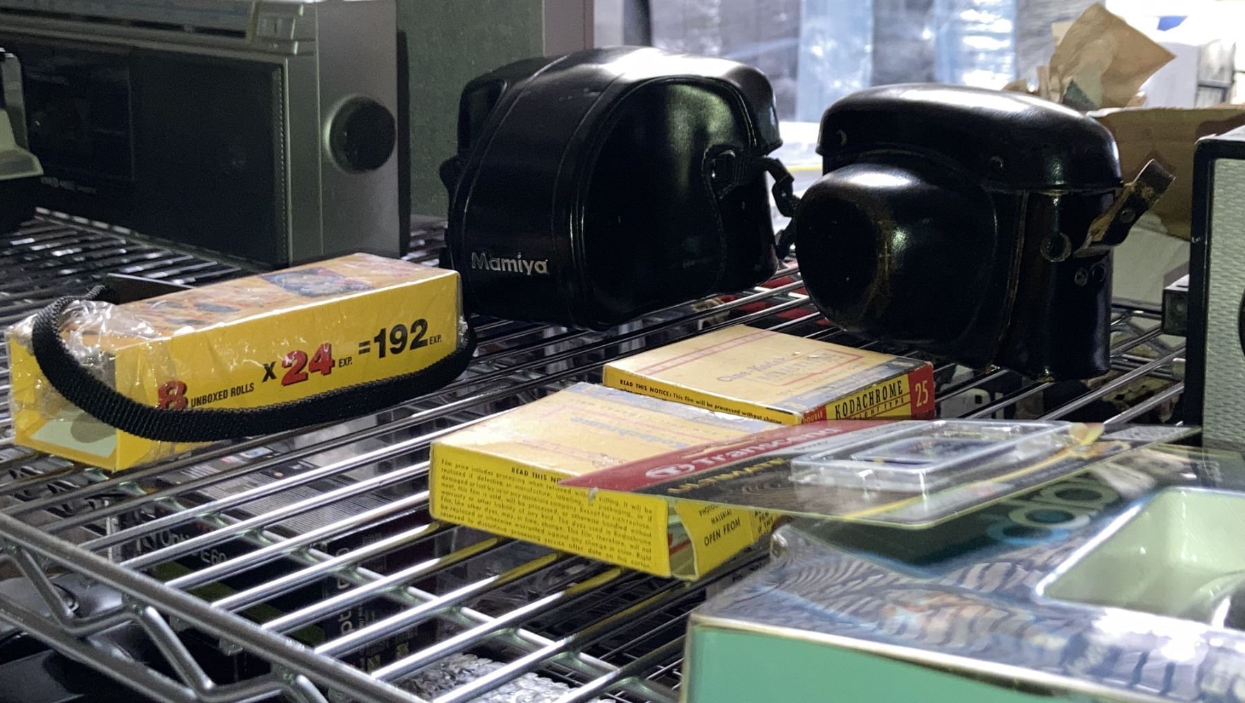 Large Shelf lot of Ansco Shur-Flash Camera, Taron Auto 40mm Japan FC 1:28, Mamiya ZE 1:2 Sekor E, Camera Films, Vintage Radios, Digital Camcorder, Etc.