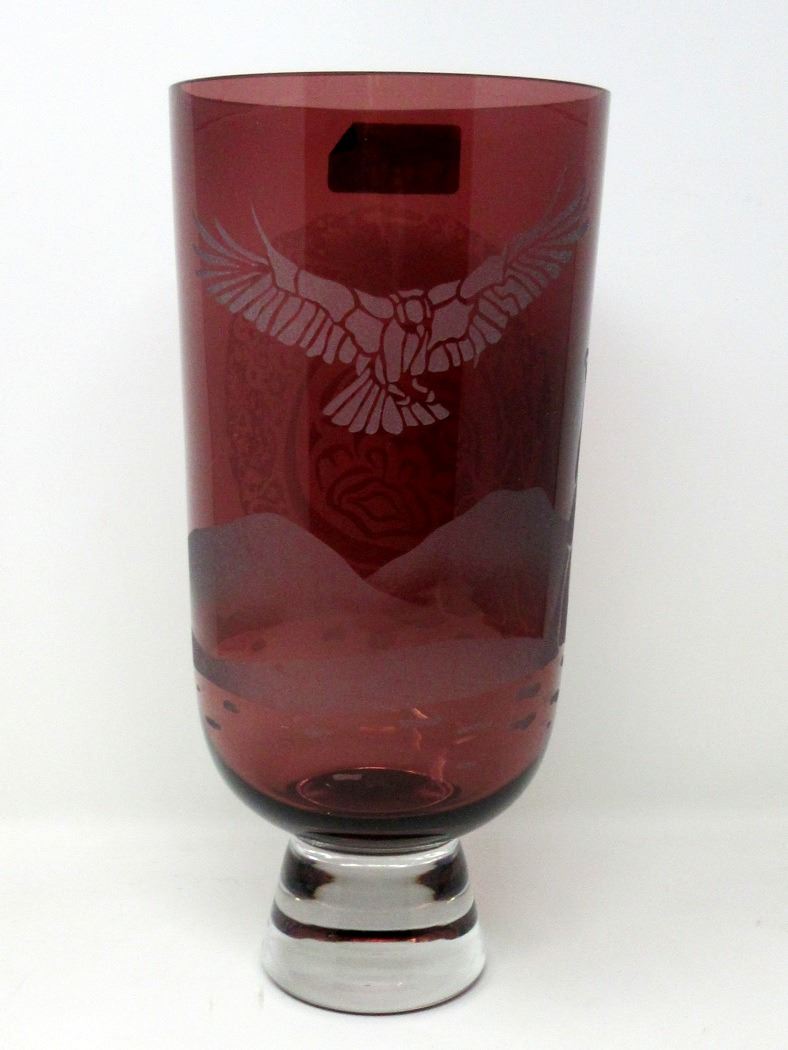Amethyst glass with clear base. 12" tall x 5.5" diameter.