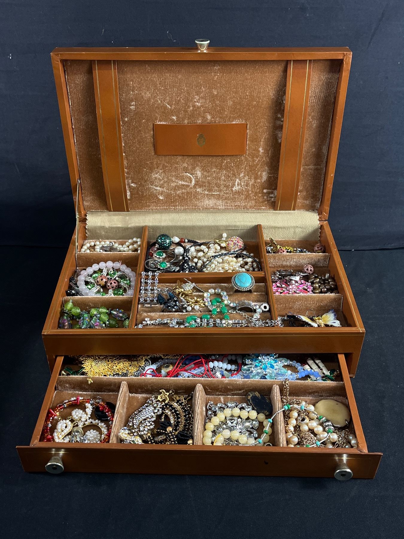 Large Vintage Leather Jewelry Box with Lot of Jewelry Contents