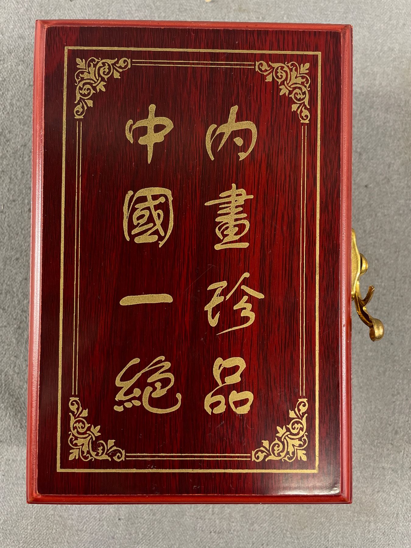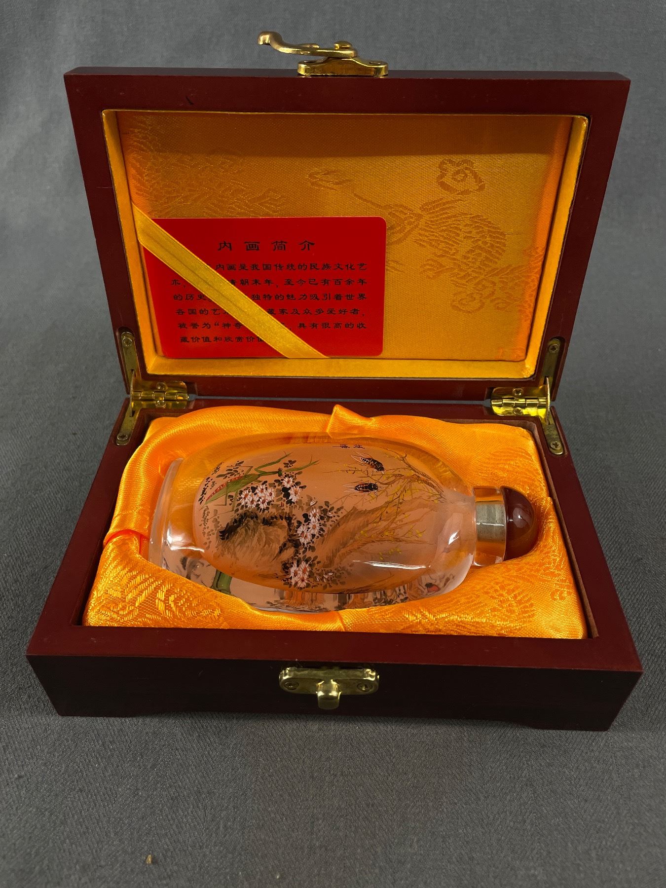 Large Vintage Reverse Painted 5" H Asian Snuff Bottle In Wood Presentation 6.5" x 4.5" Case.