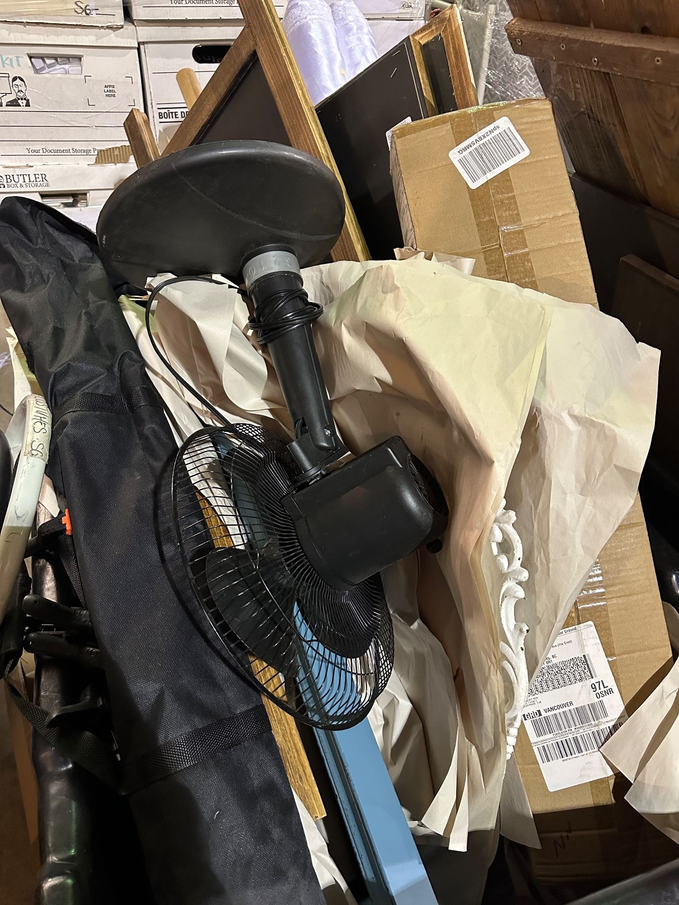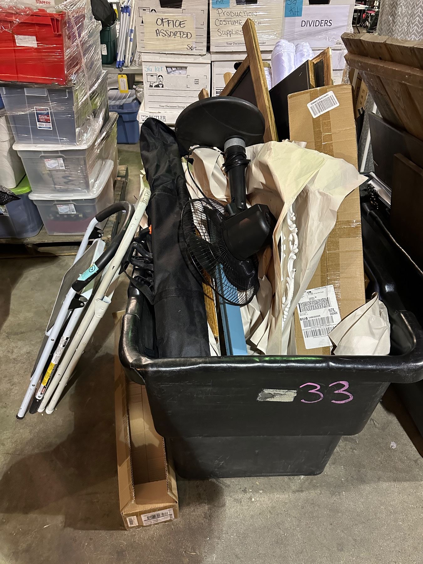Large bin of fan, frames, signs, mountdog lighting, rolls of fabric, etc...