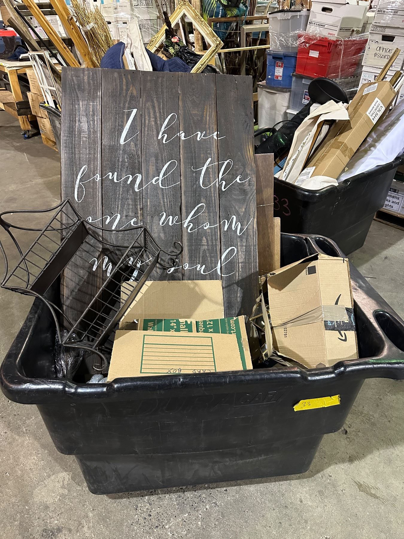 Large bin of signs, 2 tier serving tray, flameless candle holders, etc...