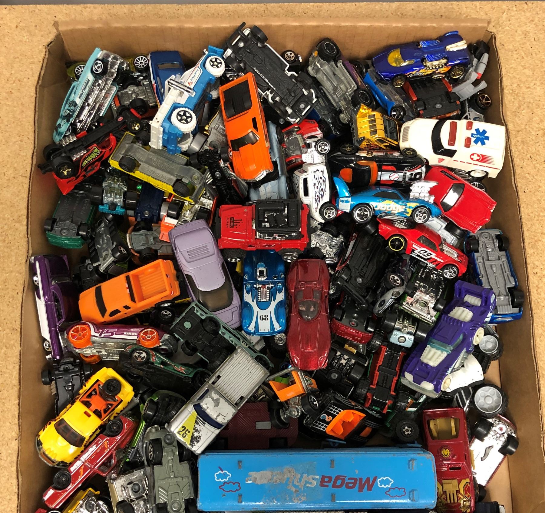 Large box filled w/ die-cast toy cars