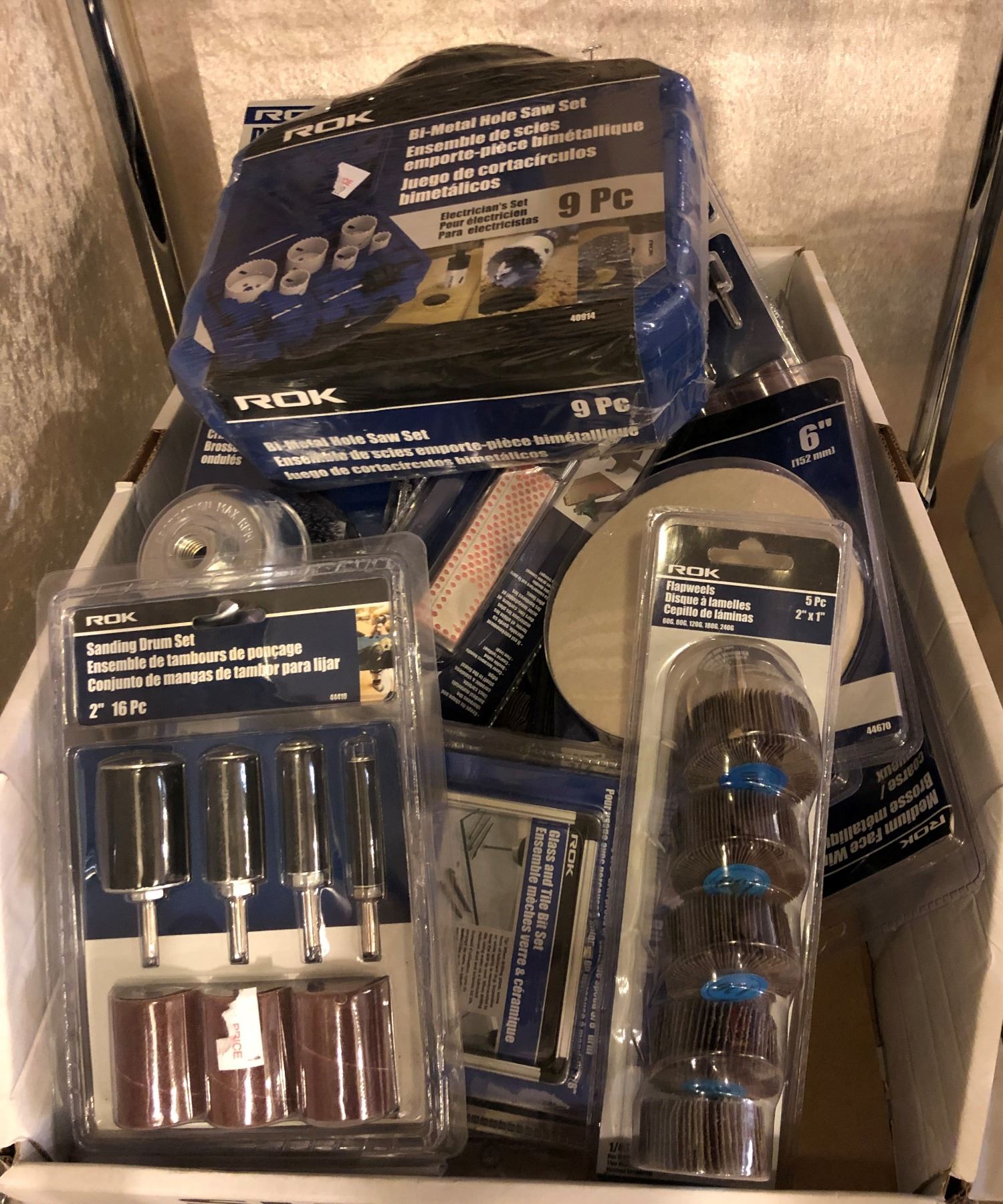Large box full of assorted ROK tools - hole saw set/ wire brush sets/ polishing wheels/ sanding/ dri