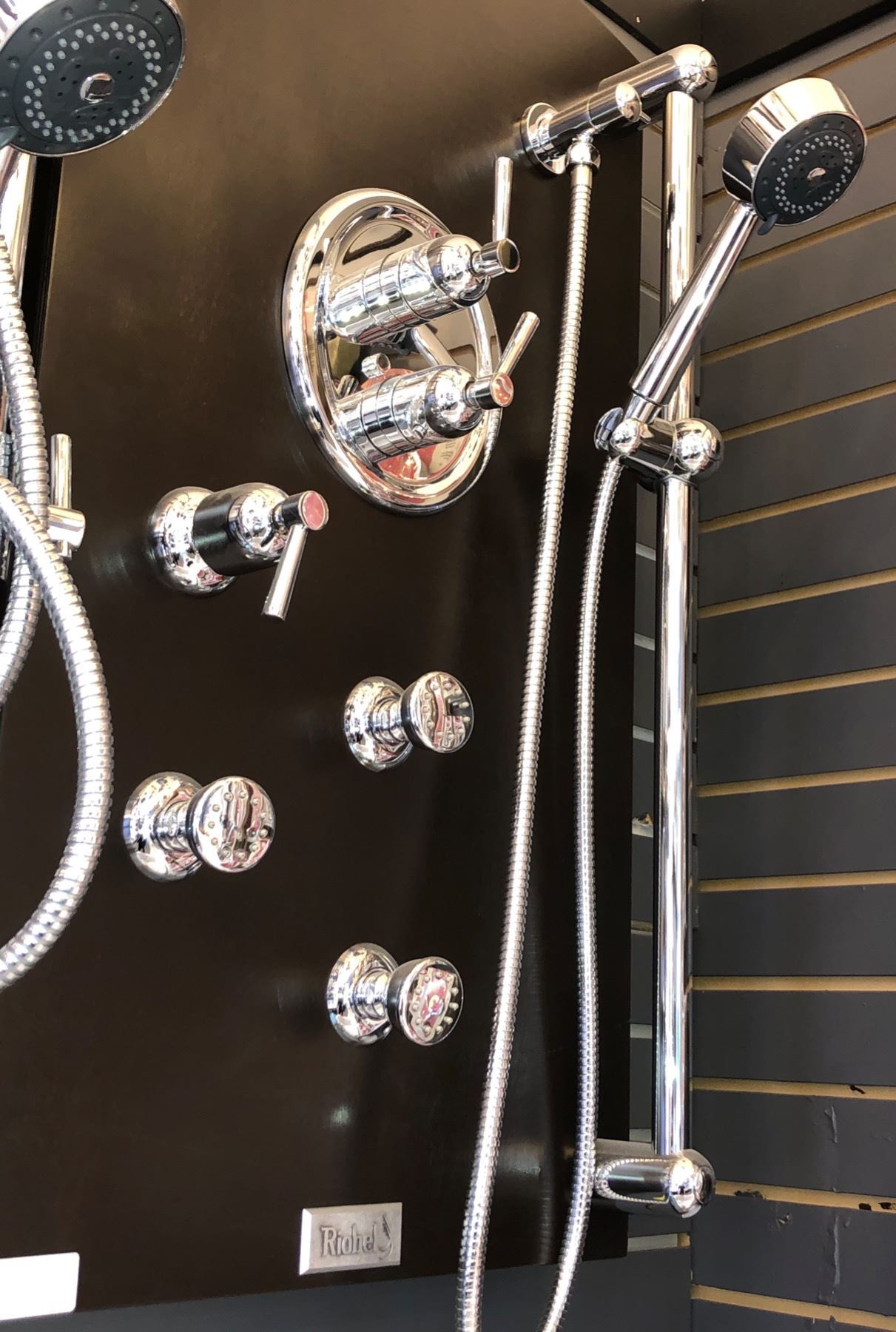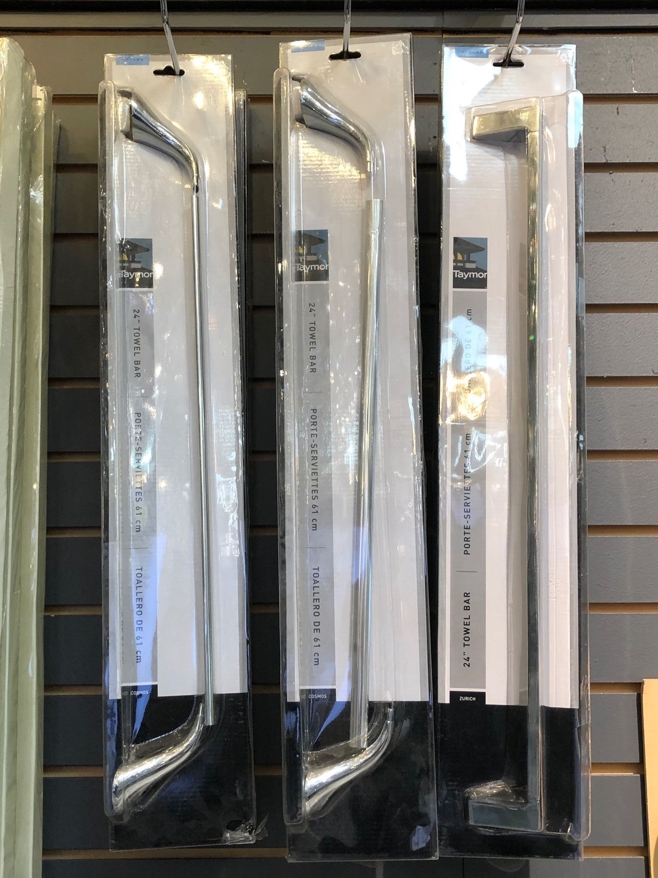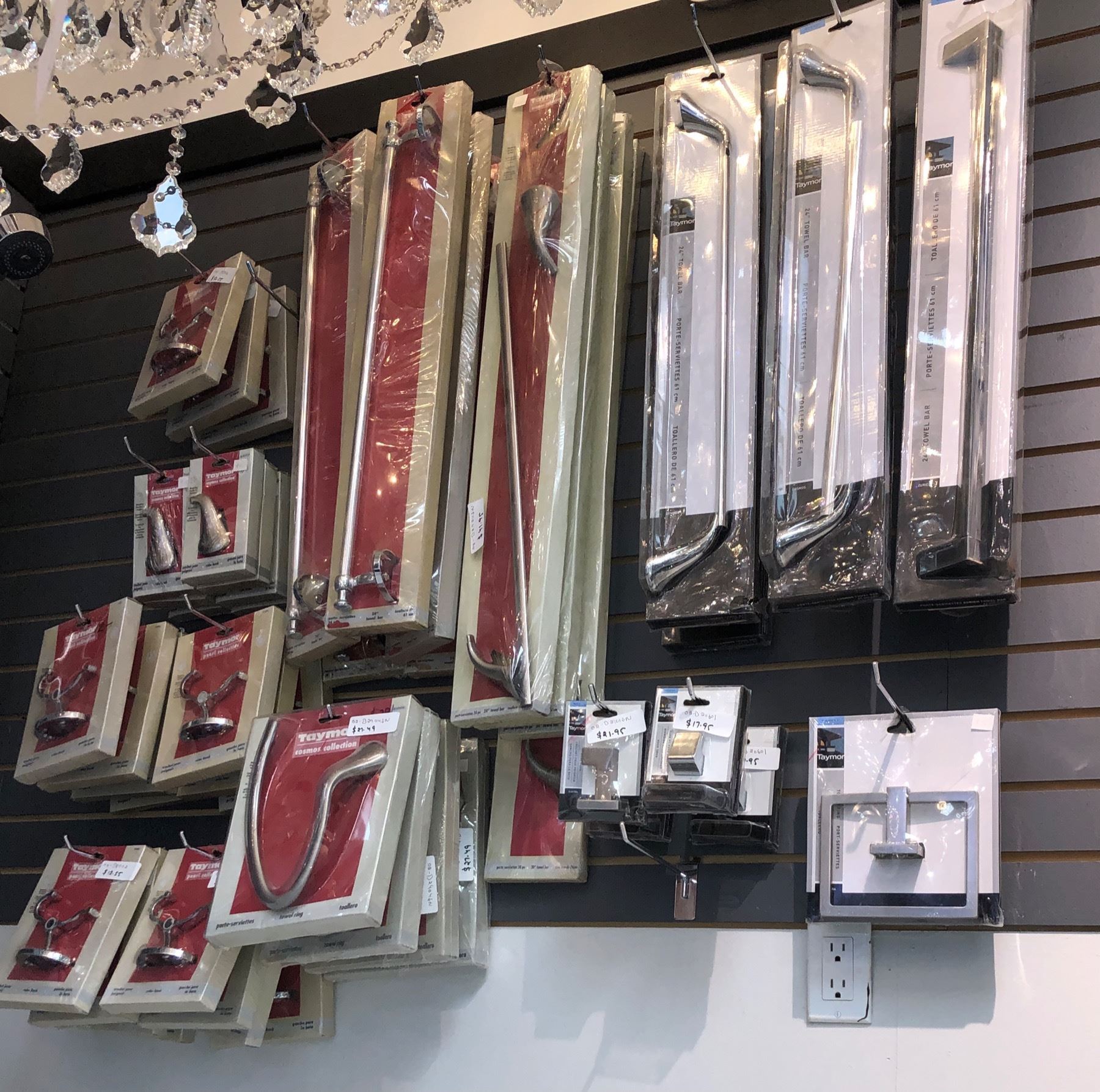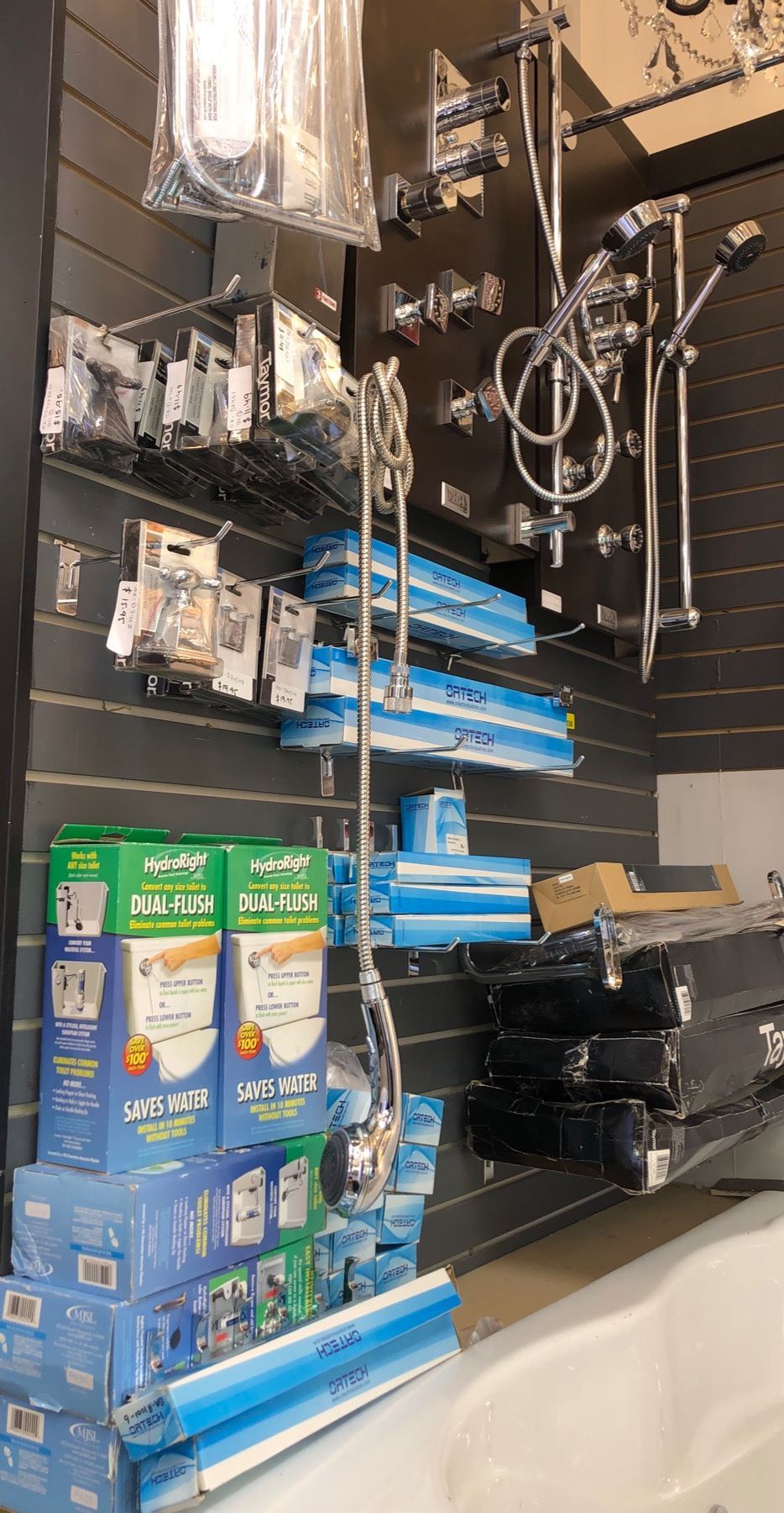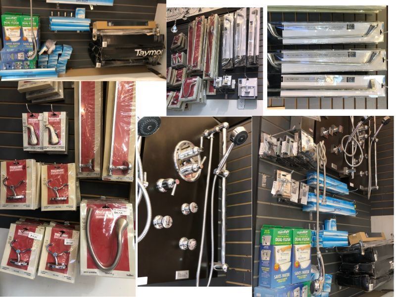 Large group of assorted bathroom items - includes shower heads w/plates, knobs, robe hooks, towel bars, dual flush toilet buttons, etc...