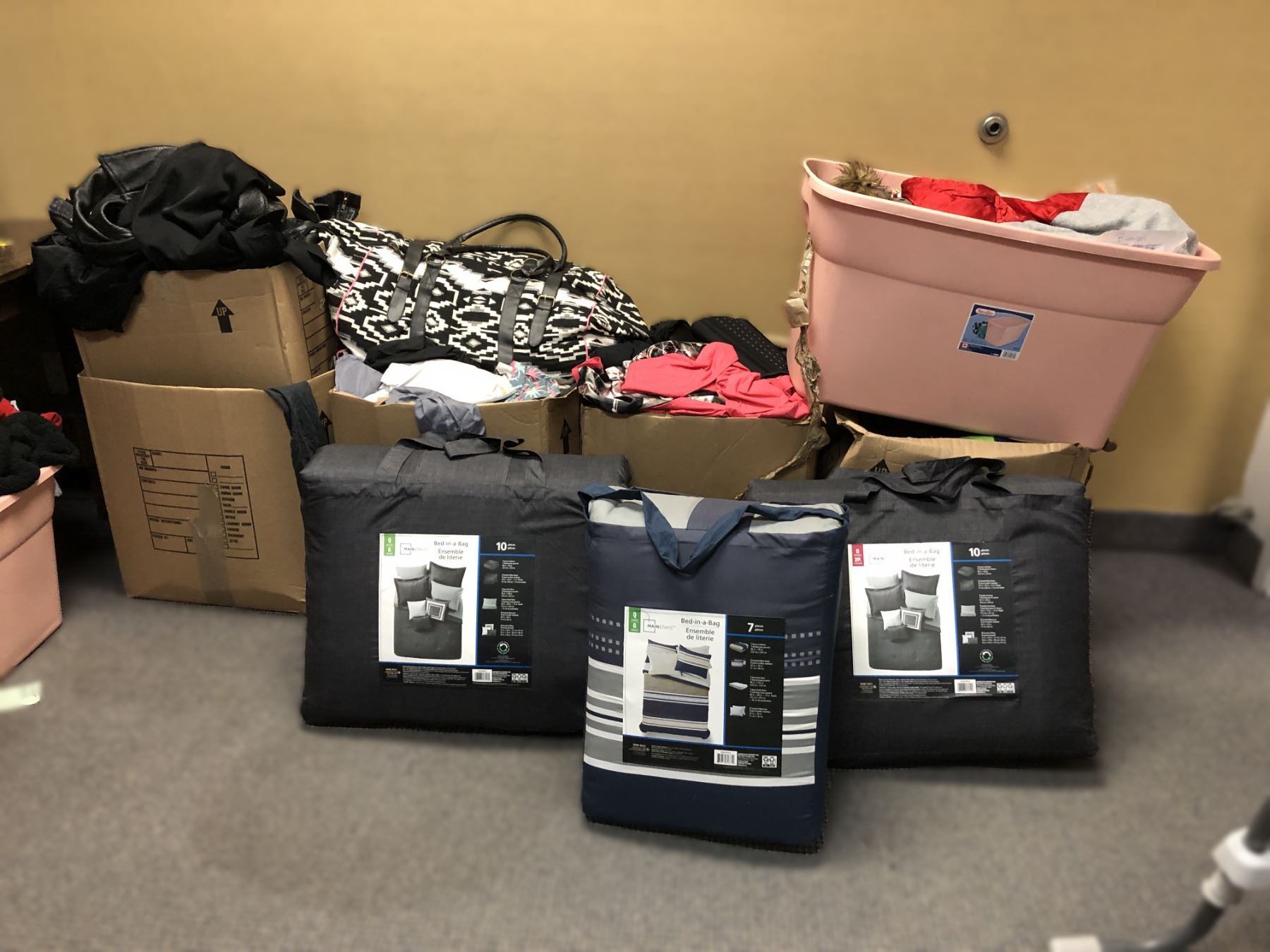 Large group of assorted clothing & bedding - includes bed in a bag / bed sheets / duffle bag / leather jackets etc