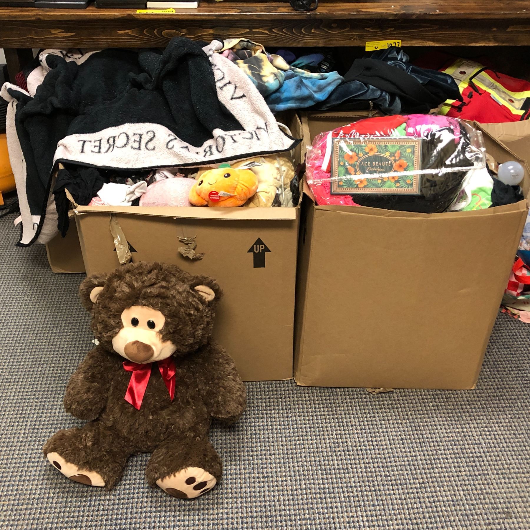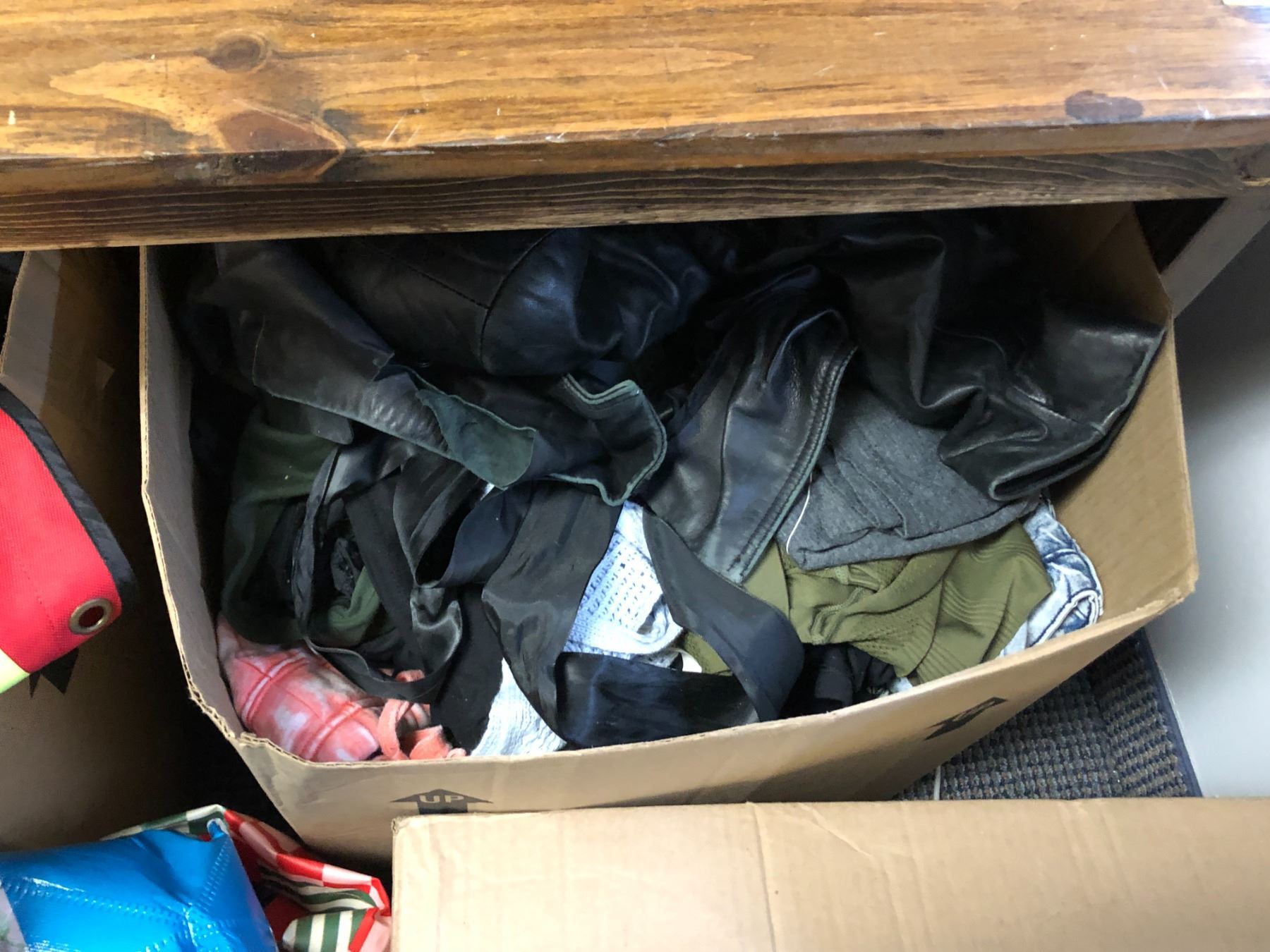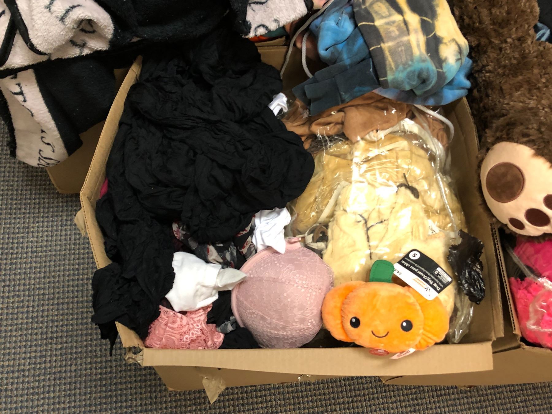 Large group of assorted clothing, bedding & misc - includes stuffed animals / bed sheets / leather jackets etc