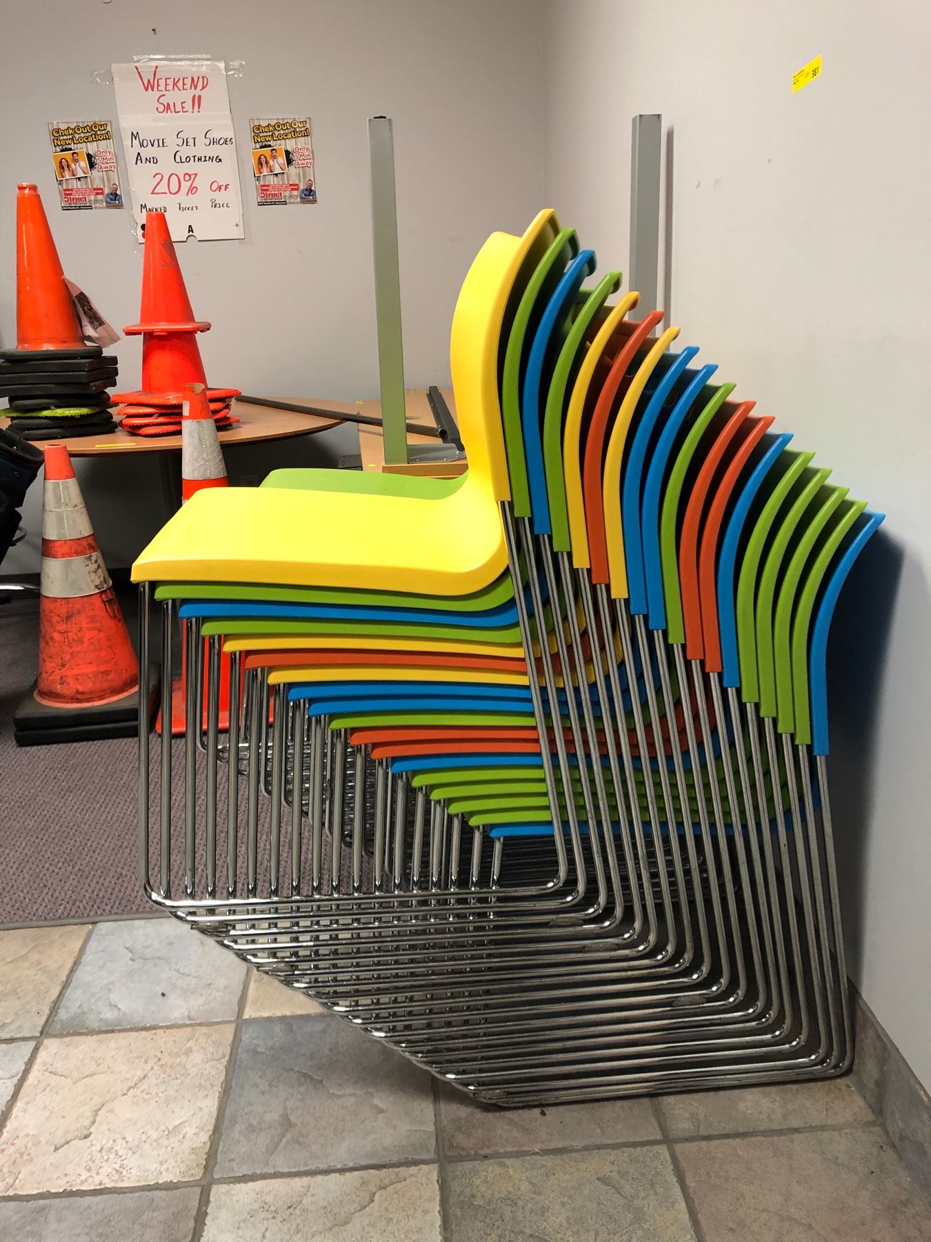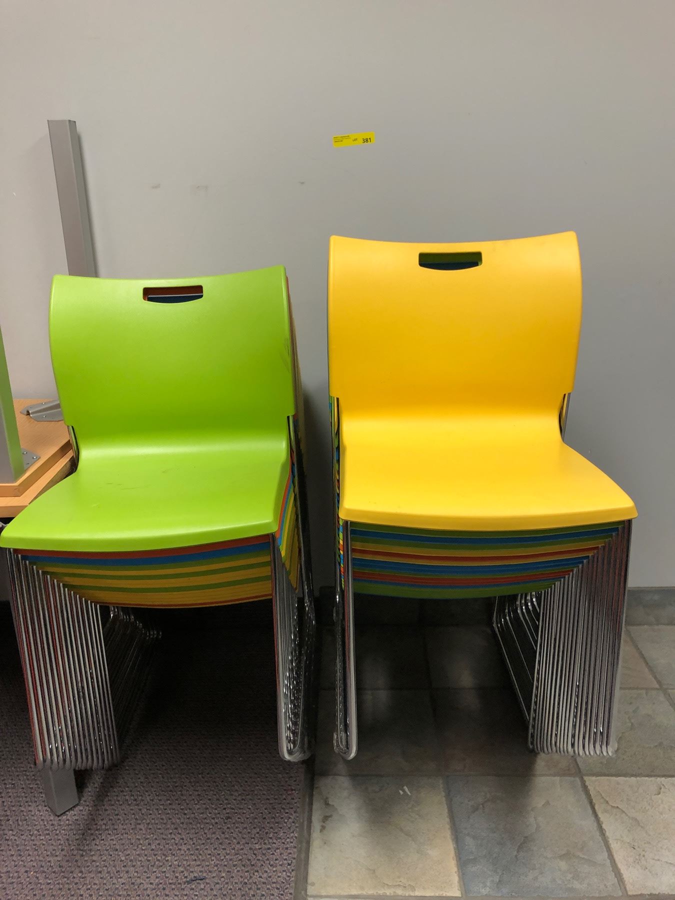 Large group of assorted colour plastic lunch room chairs - approx 32 pcs