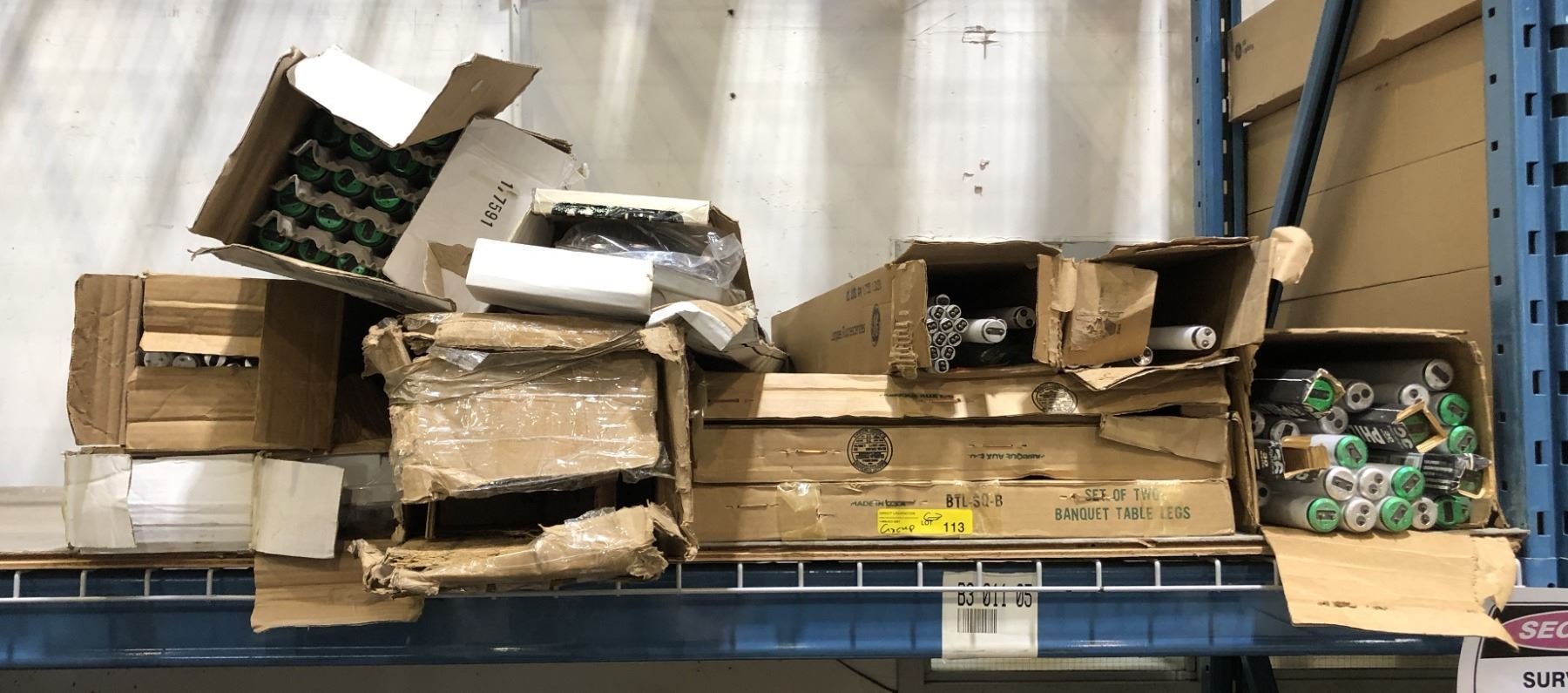Large group of assorted fluorescent & LED light bulbs/ banquet table legs & misc.
