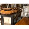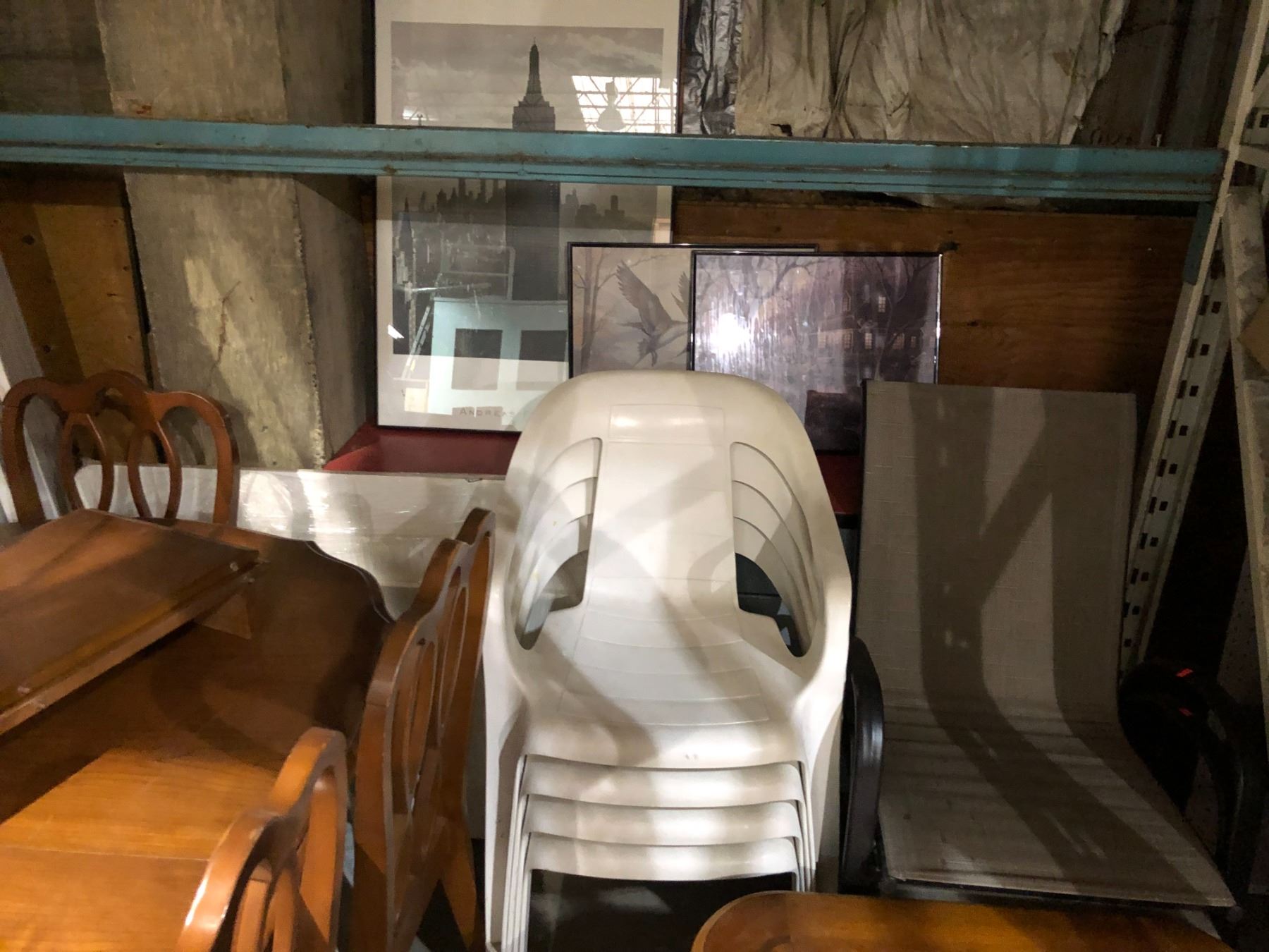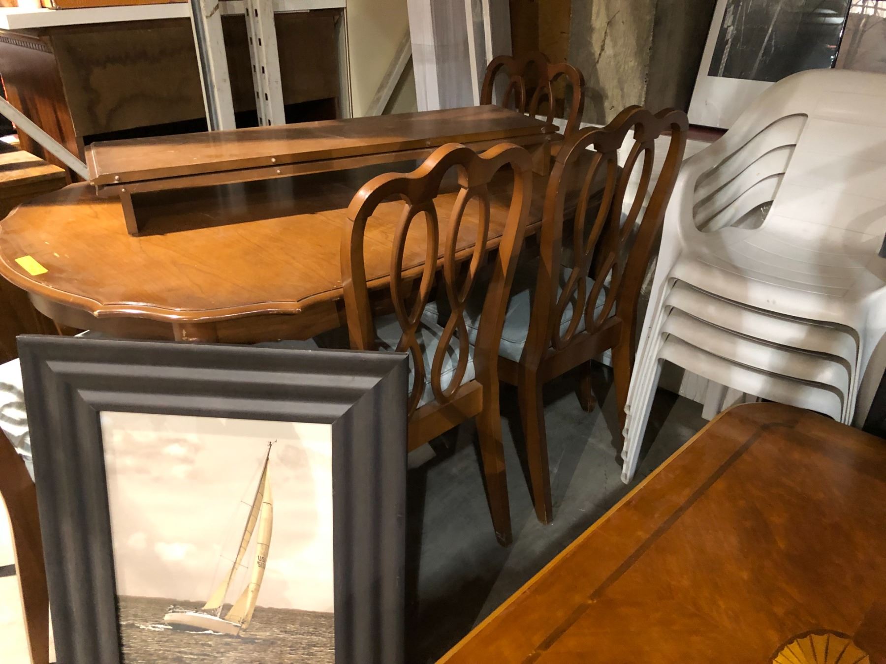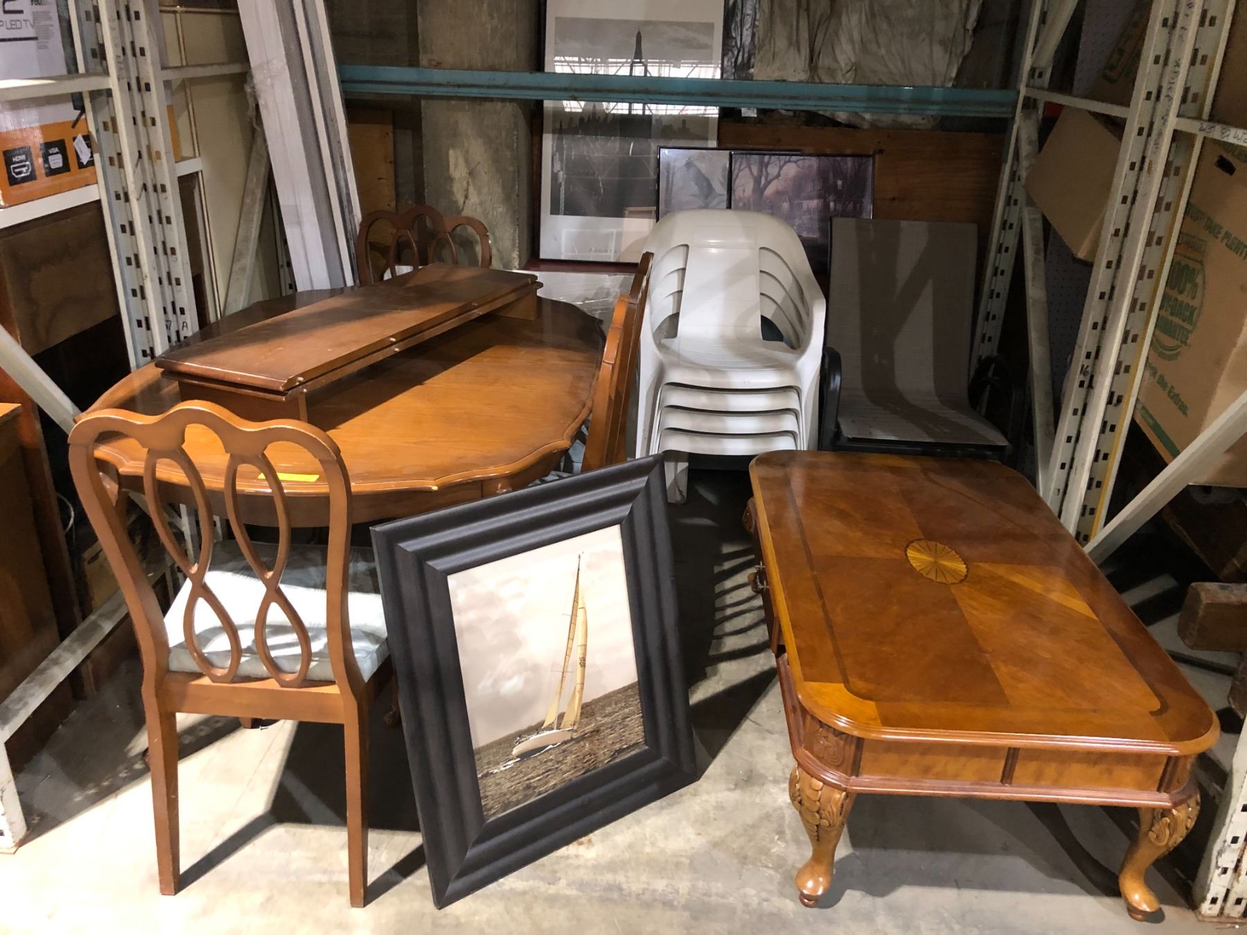 Large group of assorted furniture items - dining table w/ 4 chairs/ coffee table/ white patio chairs/ assorted framed picture/ white IKEA bed etc.