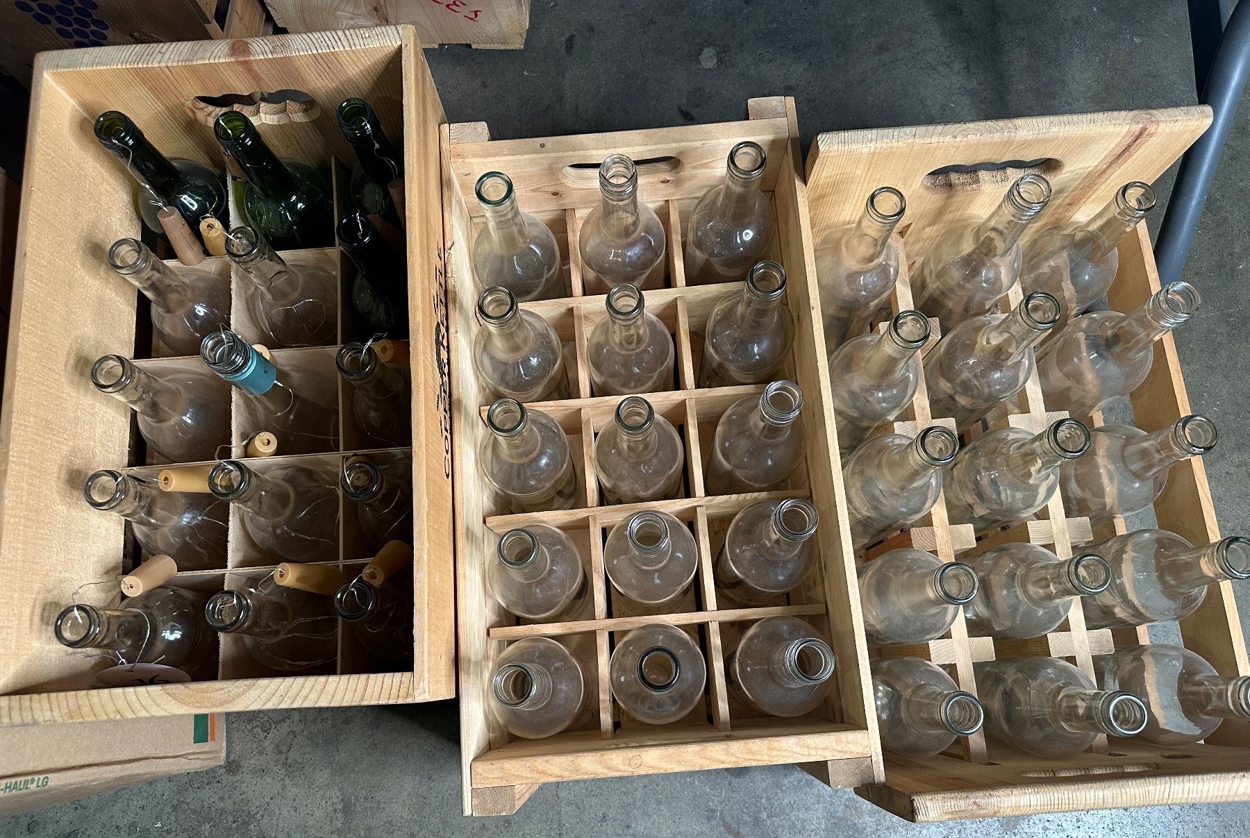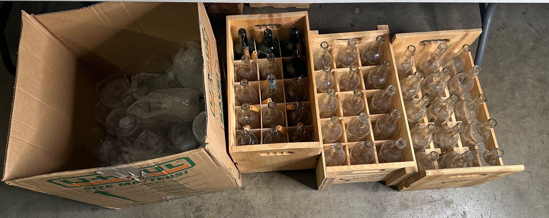 Large group of assorted glass bottles w/ wooden crates & glass candle holders