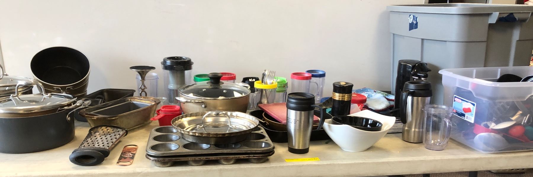 Large group of assorted kitchen items - includes cooking pots/ baking trays/ cutlery/ cooking pans/ cooking spoons/ knives etc.