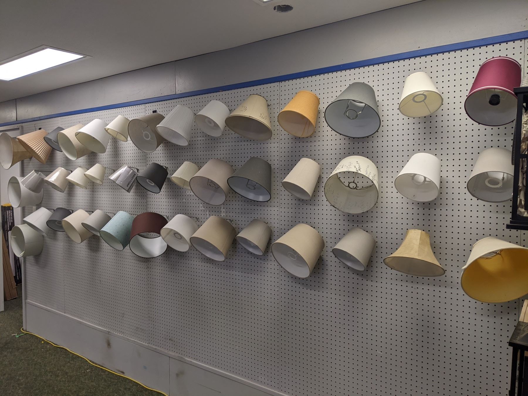 Large group of assorted light fixtures - includes mostly lamp shades/table lamps & wall scones