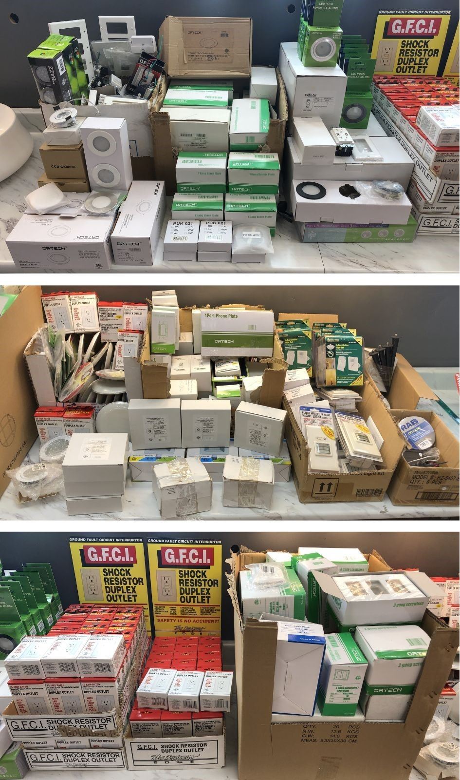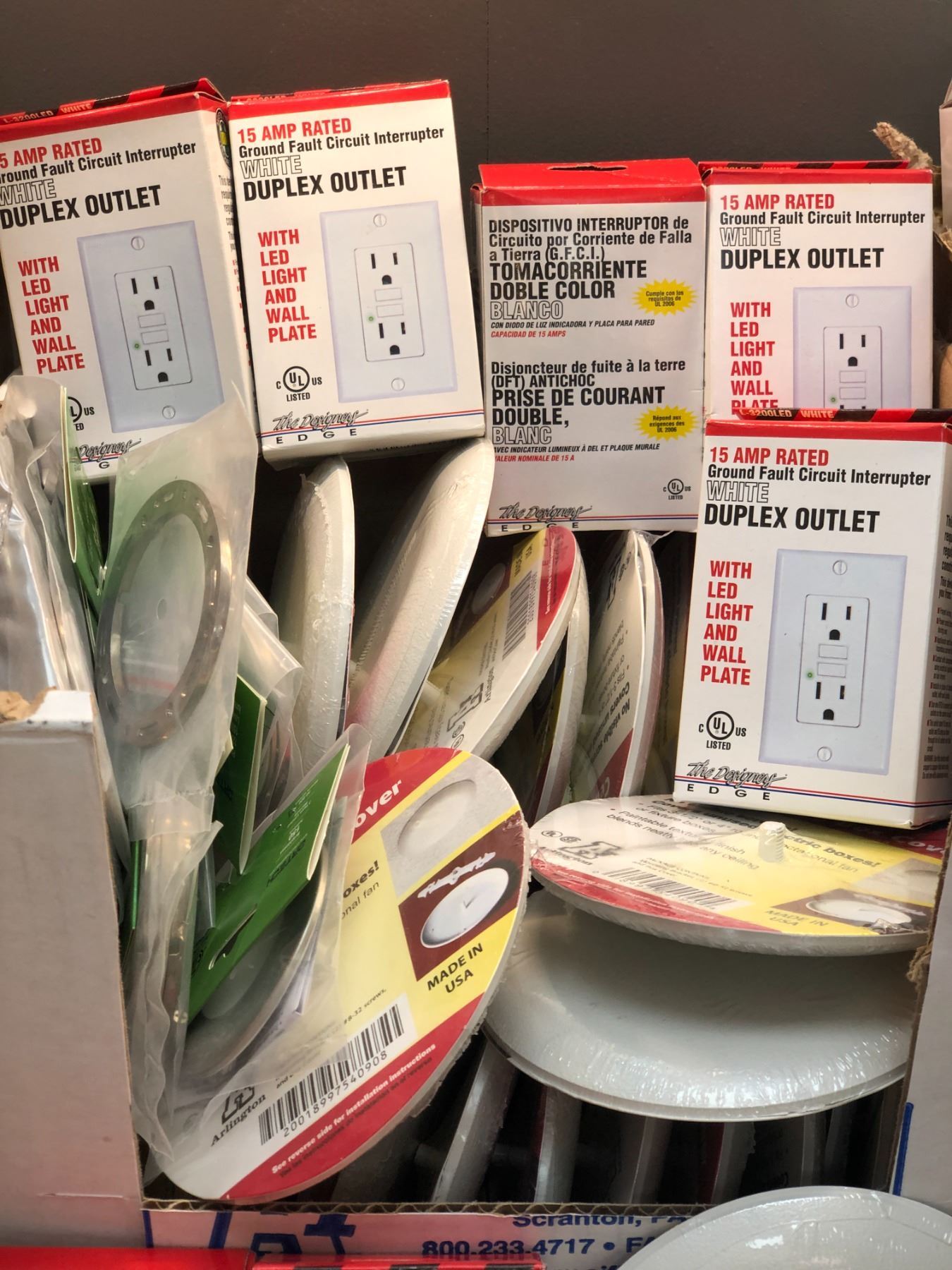 Large group of assorted lighting & electrical items includes 15 amp duplex outlets, ortech LED pucks, LED lights, single pole decorative switches, 3 way slide dimmer, indoor motion light sets, flush mount in wall nightlights, etc...