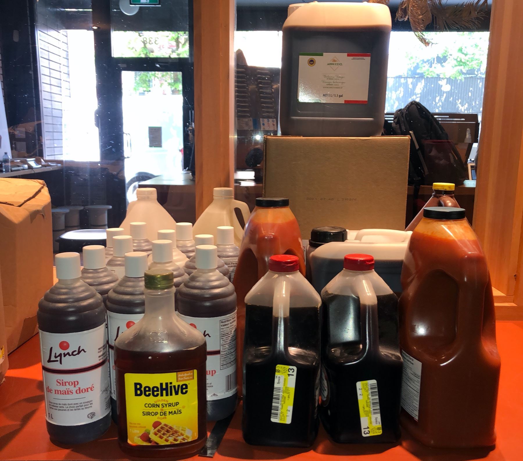 Large group of assorted restaurant syrups - includes lynch sirop/Frank's Red-hot sauce etc.