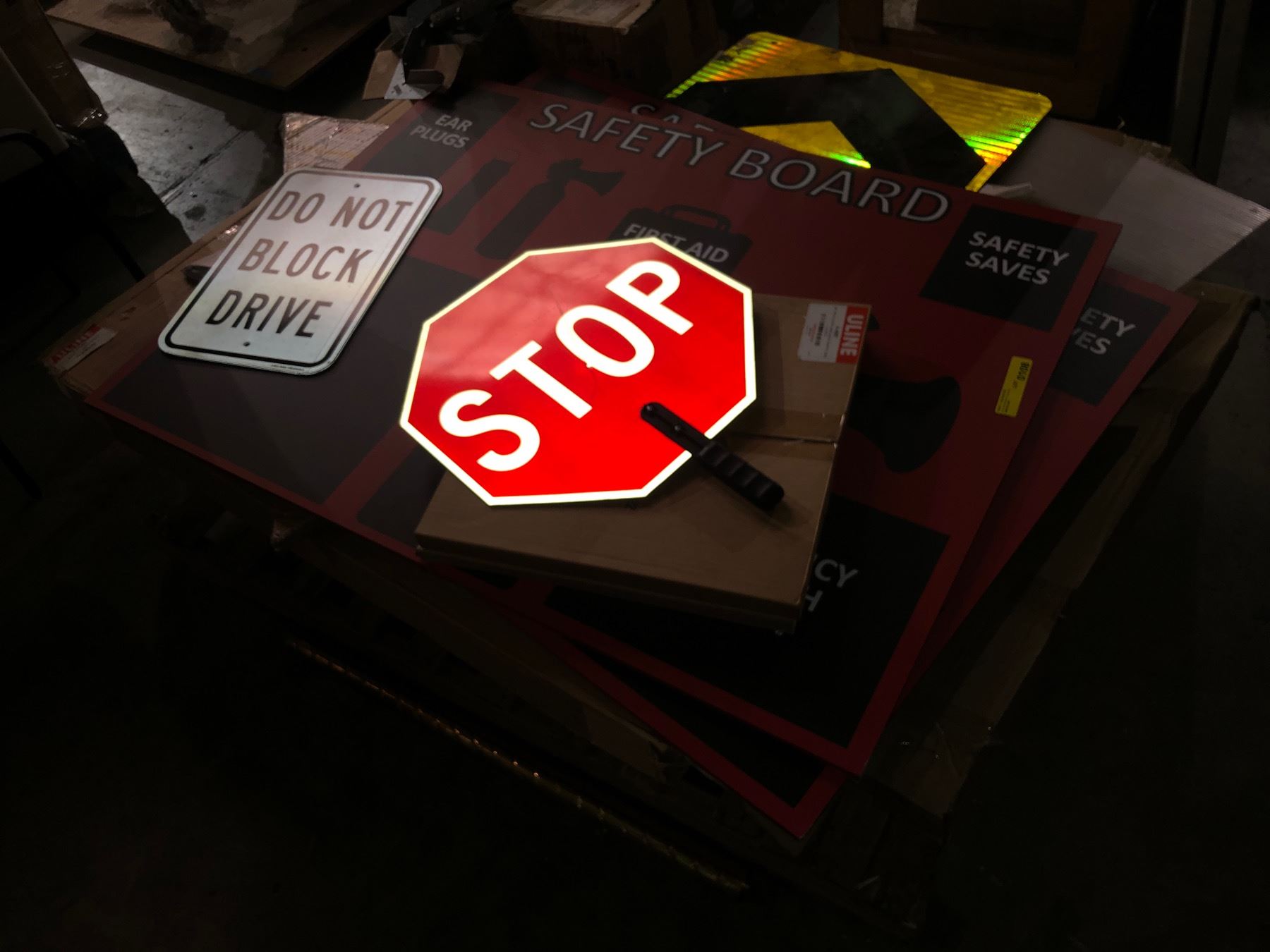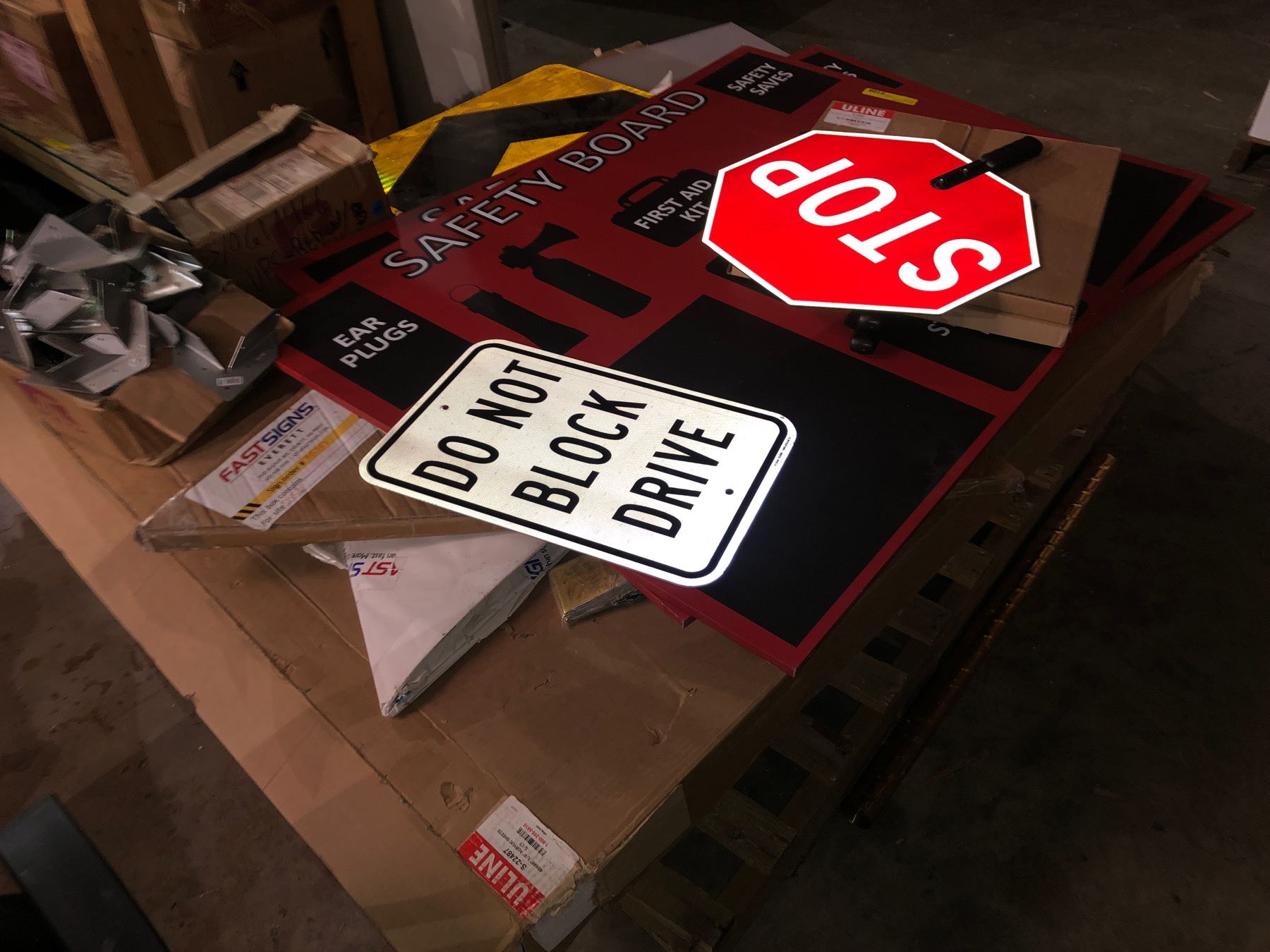 A large group of assorted signage and miscellaneous- Including road signs/ Safety board signs/Acrylic sheets etc.