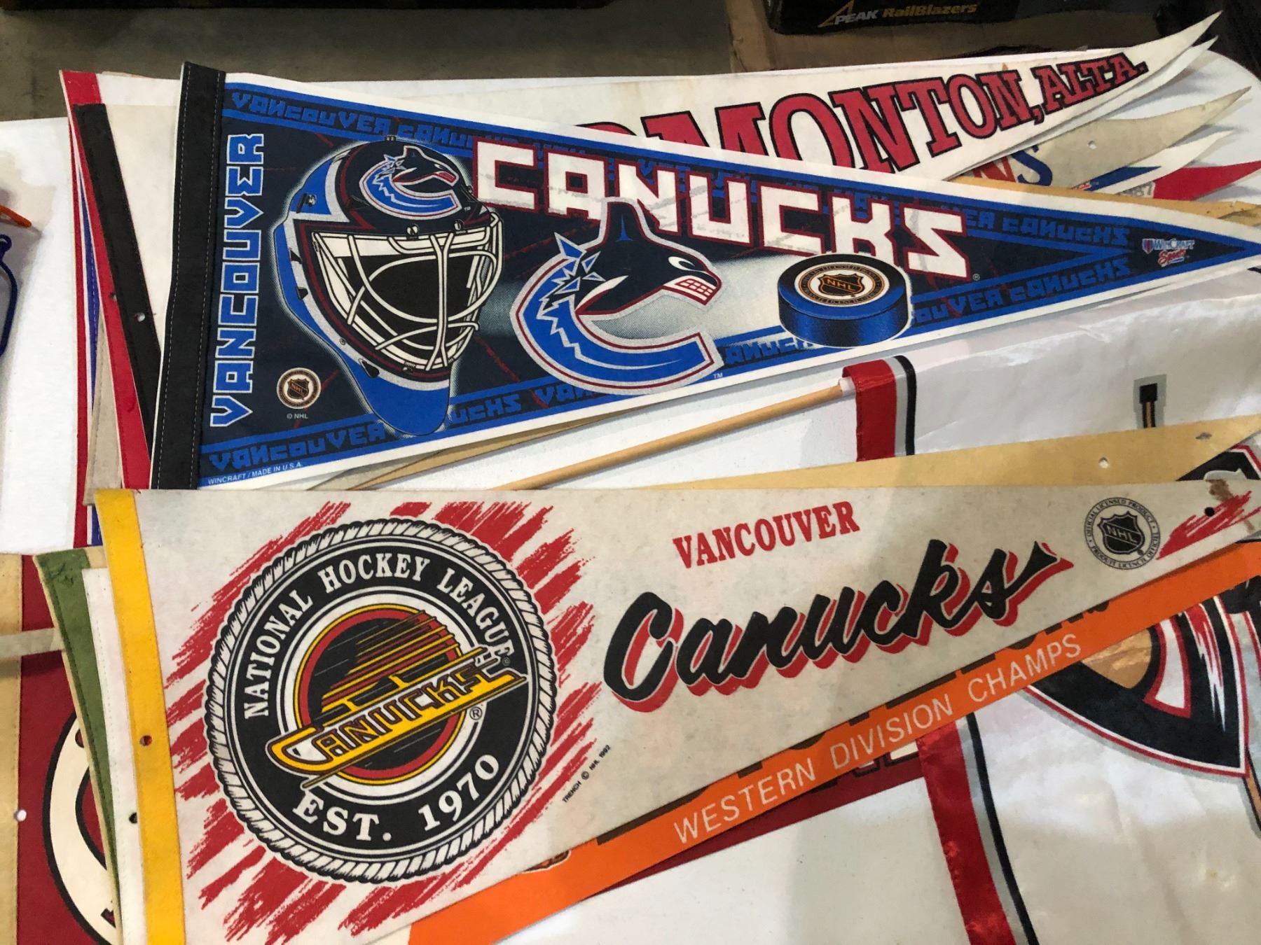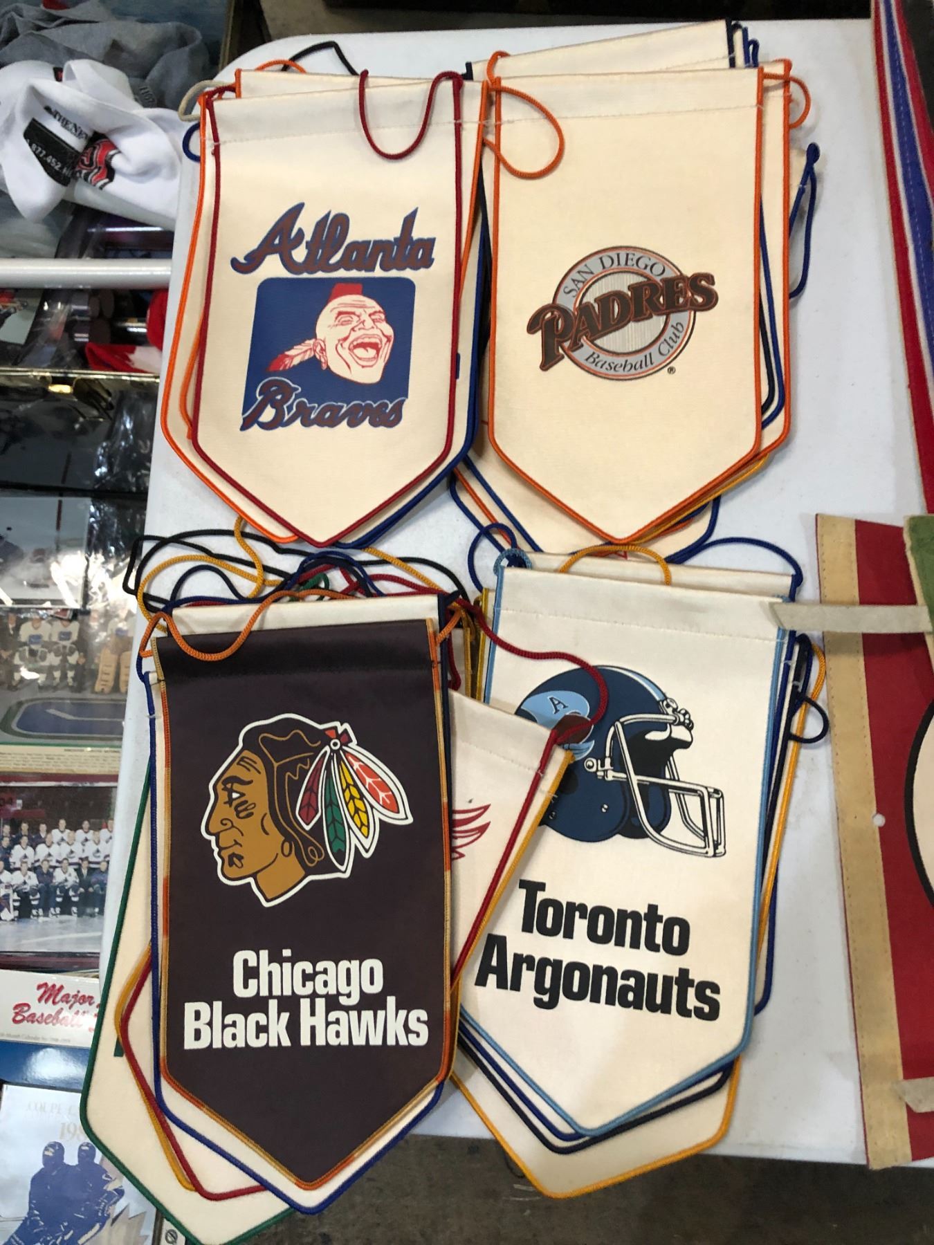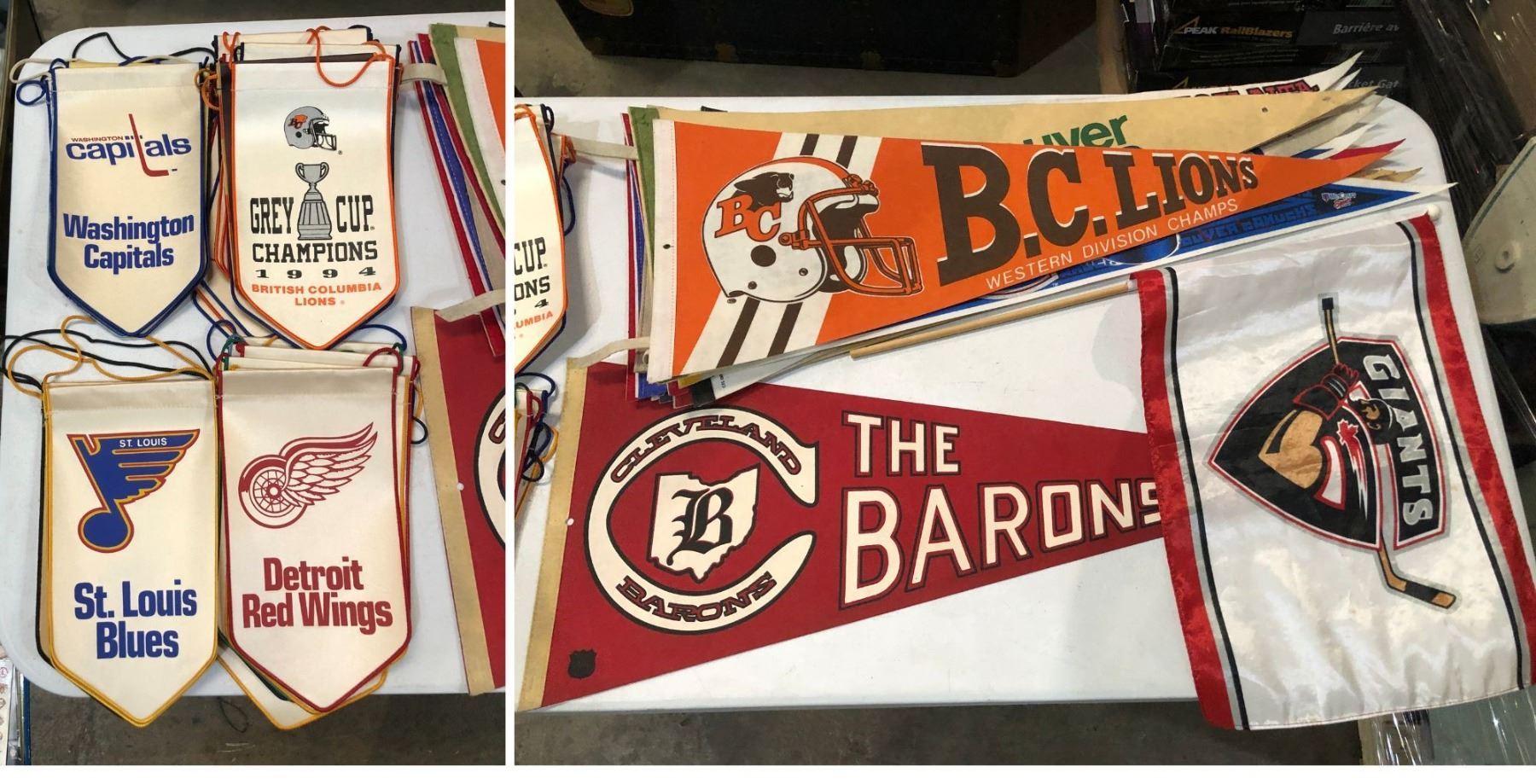 Large group of assorted sports flags - NFL, Major League Baseball, NHL misc. pendants from the 80's & 90's (approx. 12 pendants/ 33 flags)