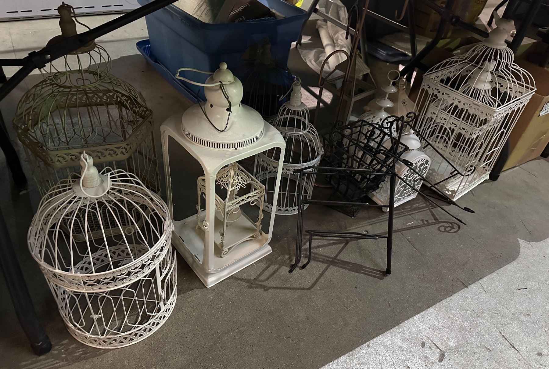 Large group of assorted wedding decor - bird cages/ candle holders/ candle lanterns (mostly metal)