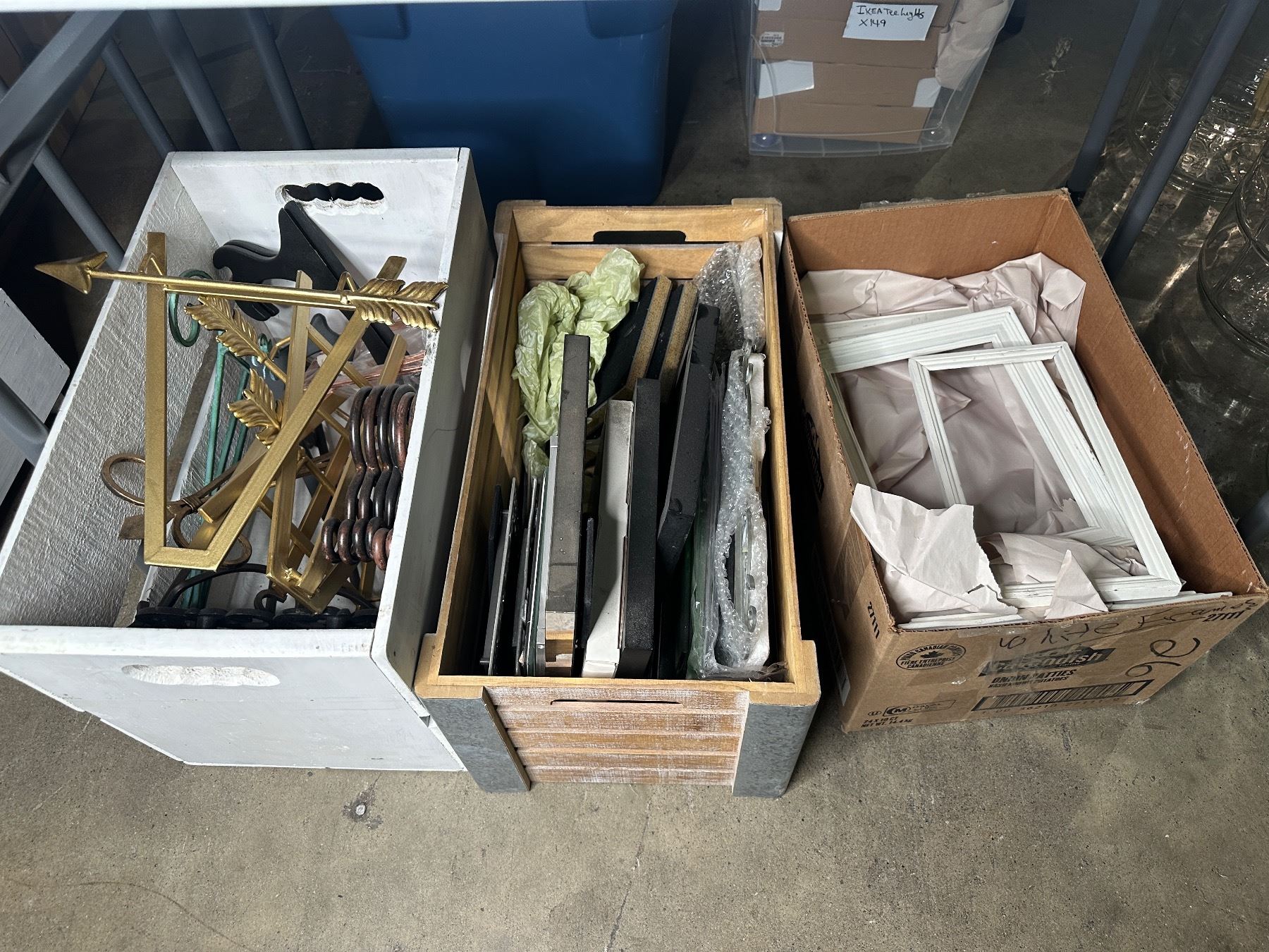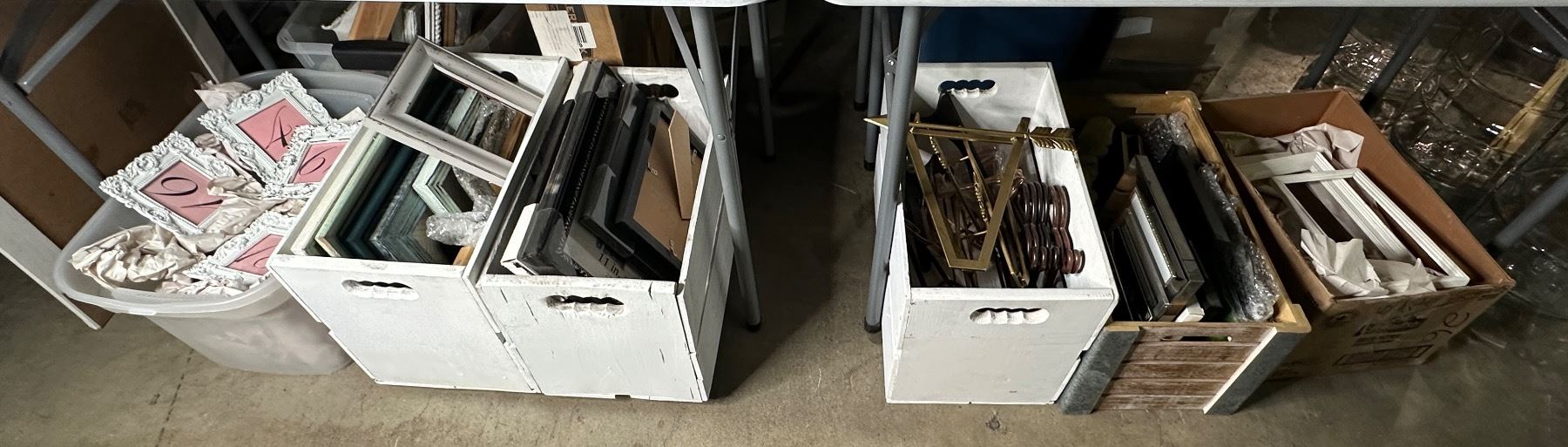 Large group of assorted wooden crates w/ decorative framed wall hangings & misc. wedding decor.