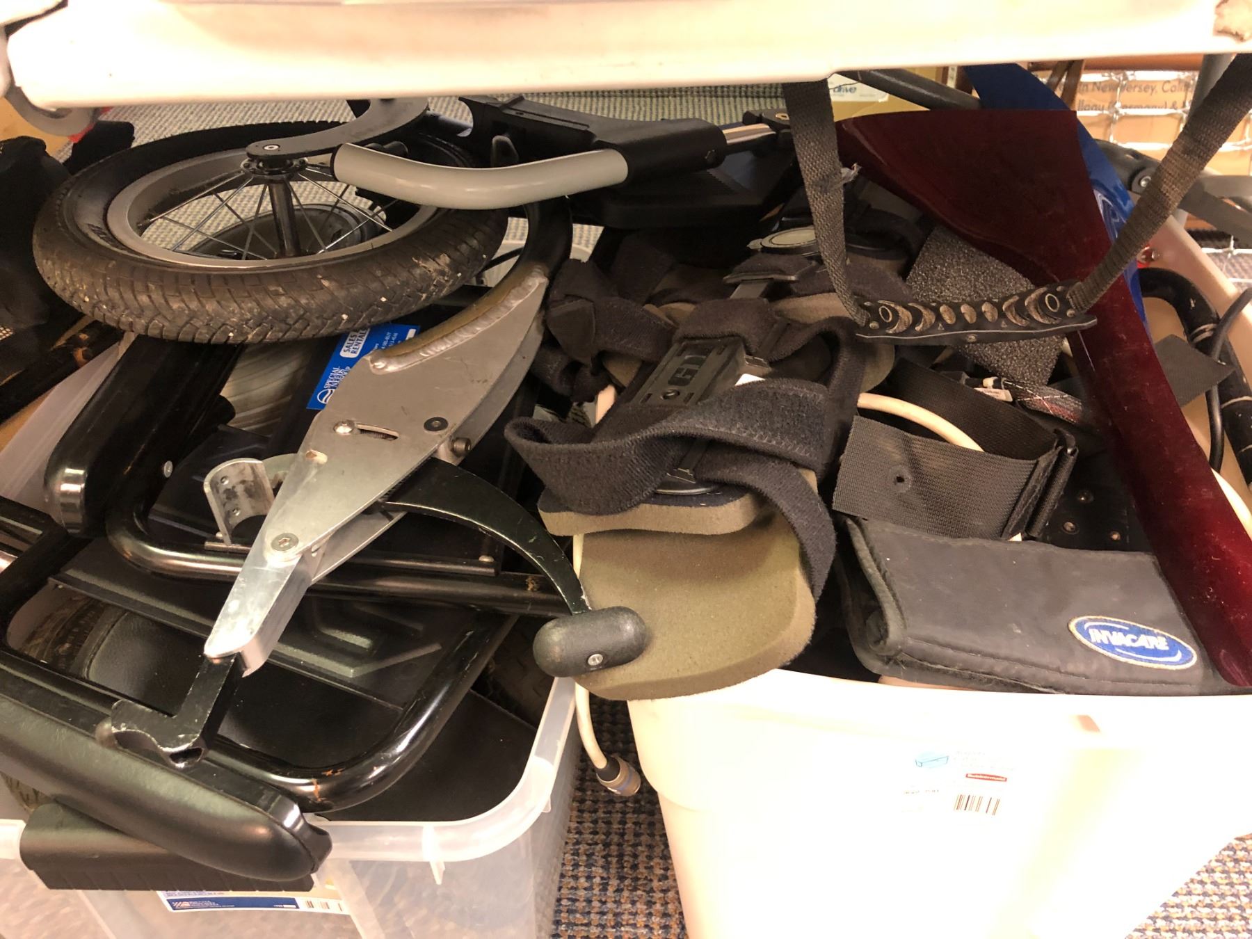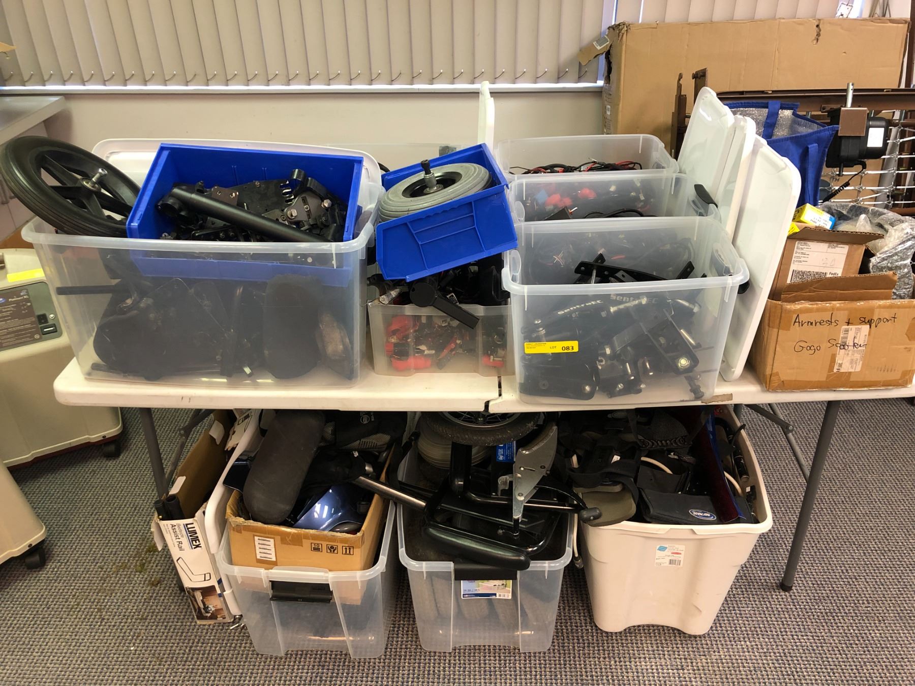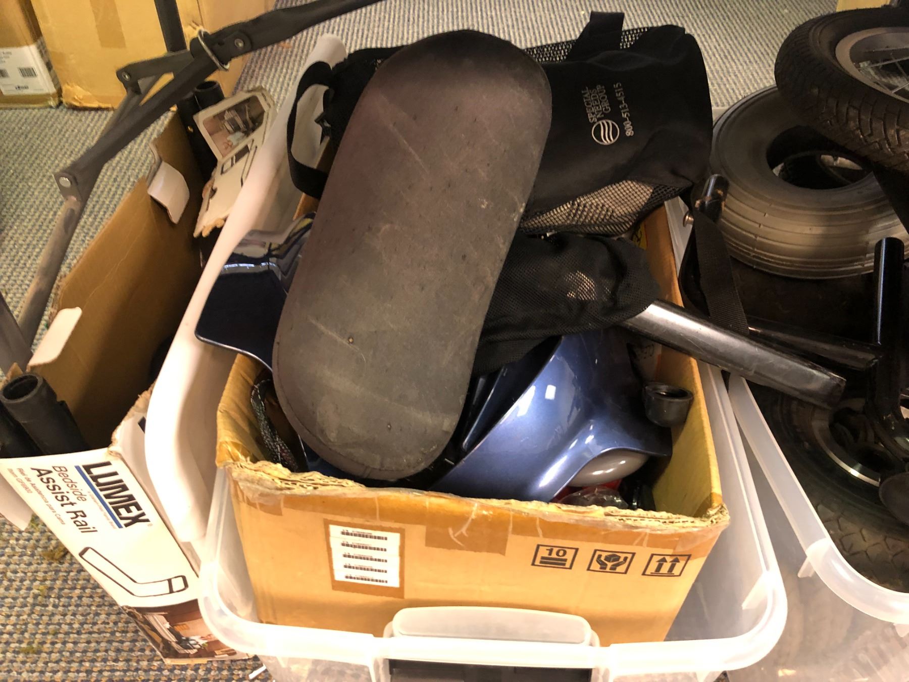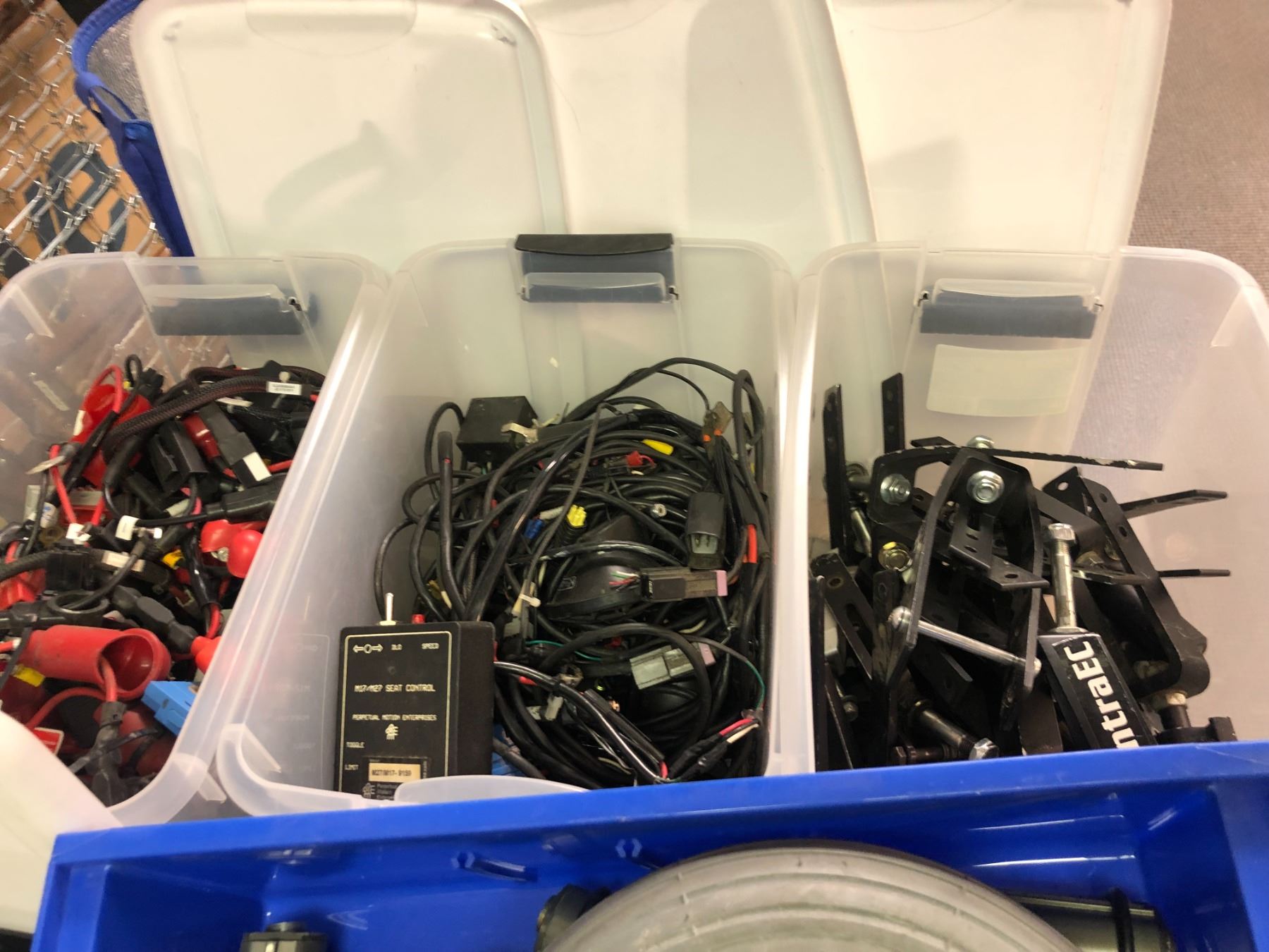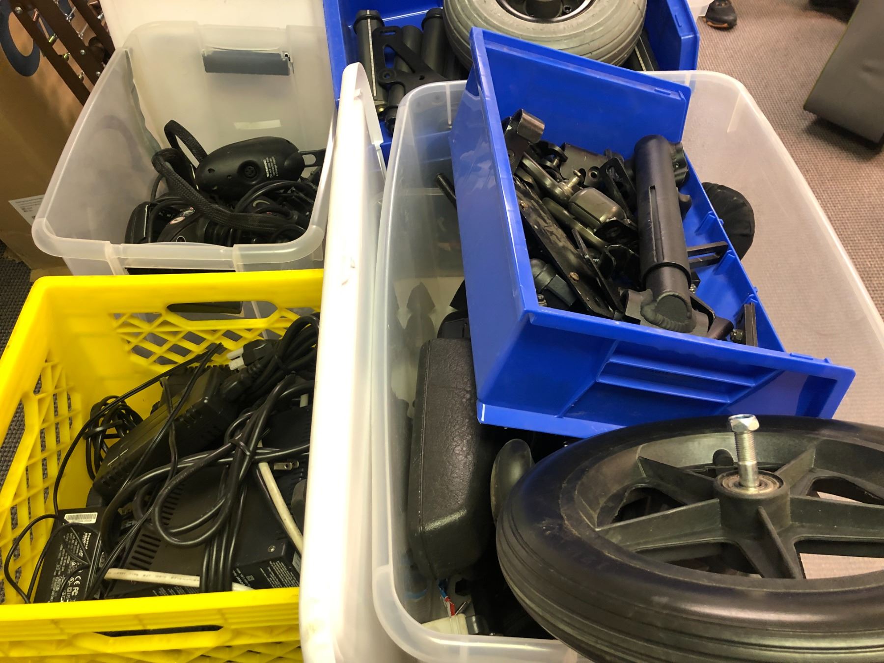 Large group of boxes filled w/ assorted medical assist scooter & wheelchair parts & accessories
