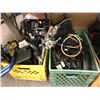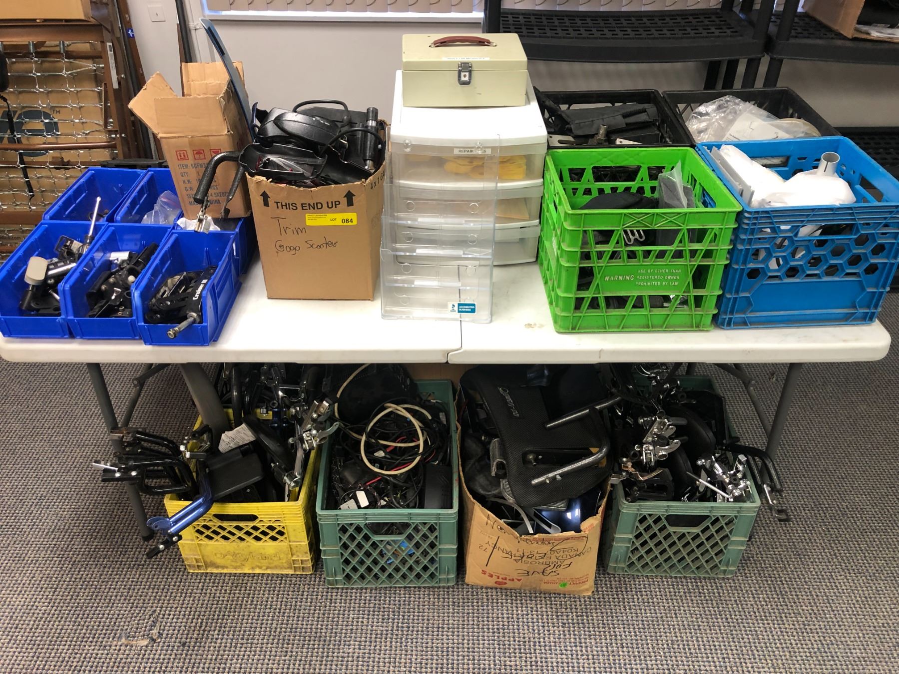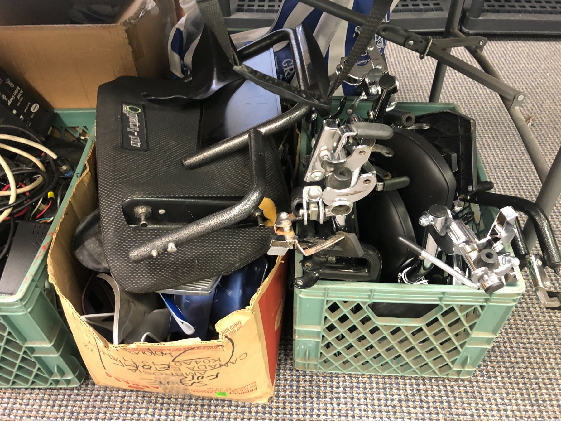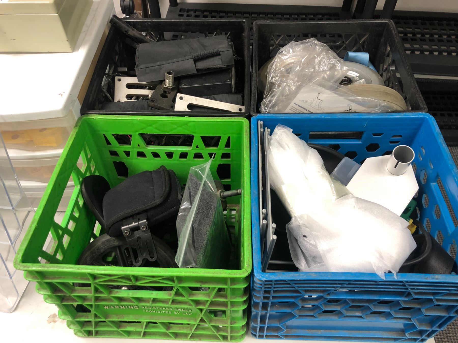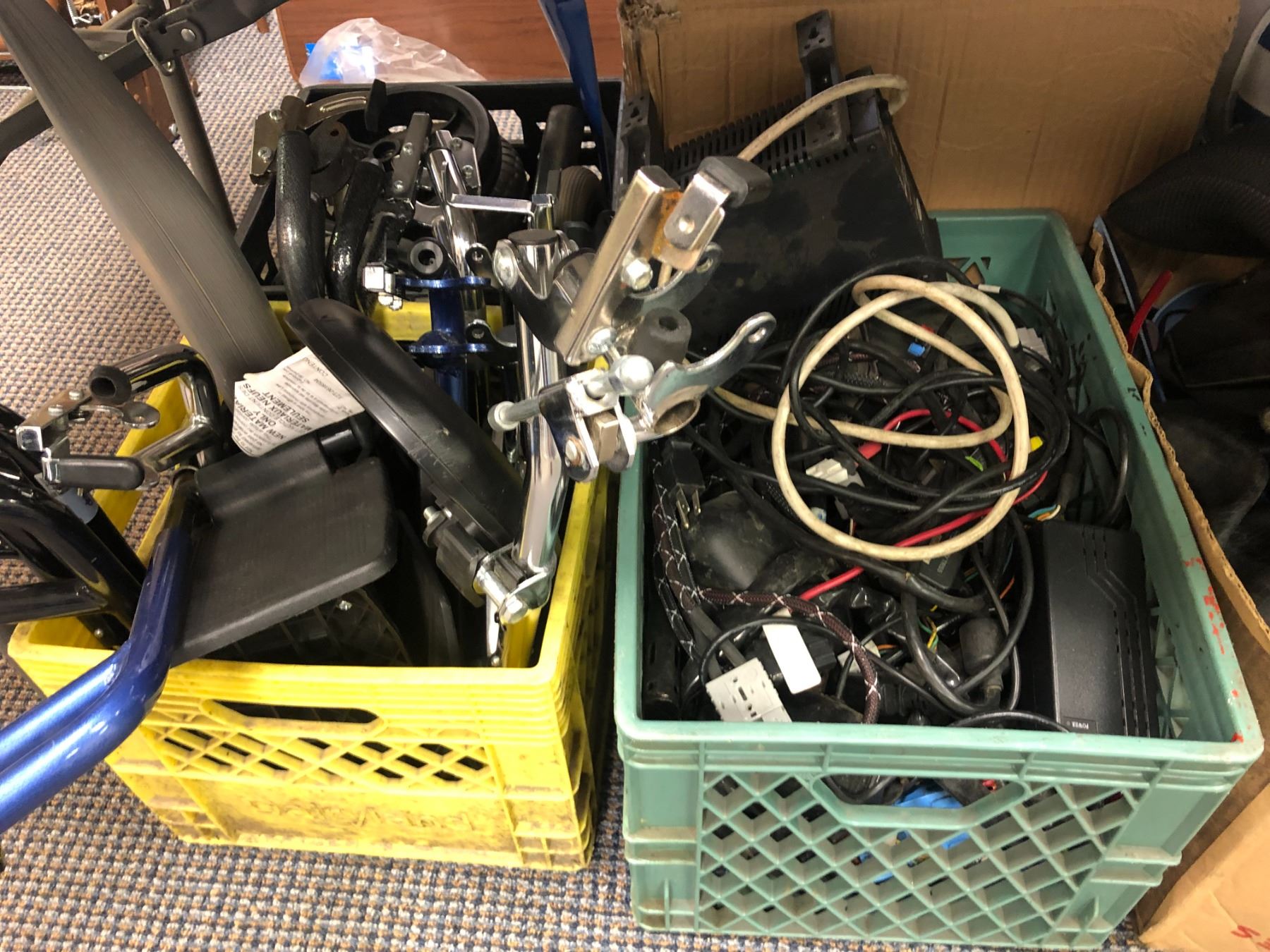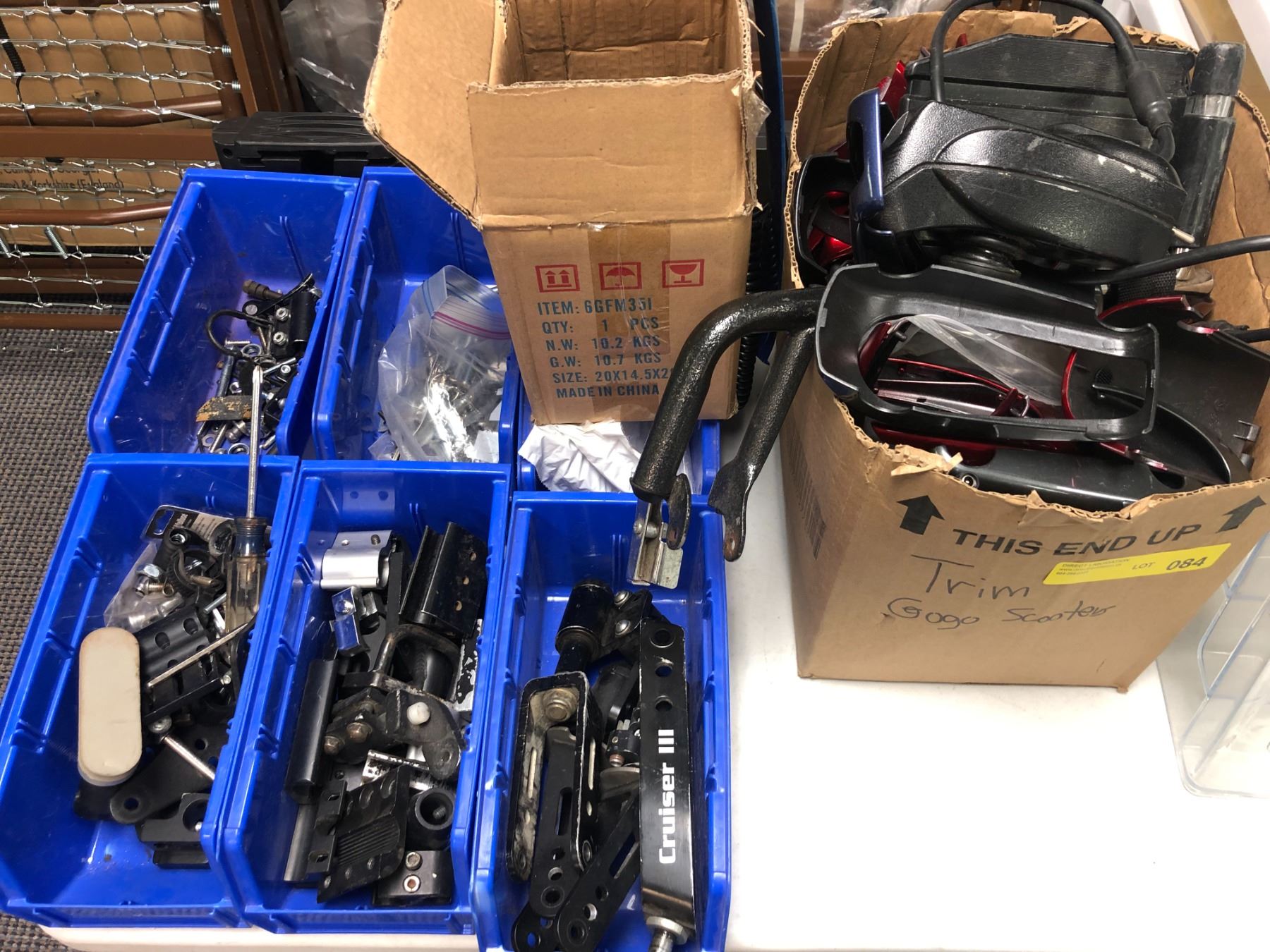 Large group of boxes filled w/ assorted medical assist scooter & wheelchair parts & accessories
