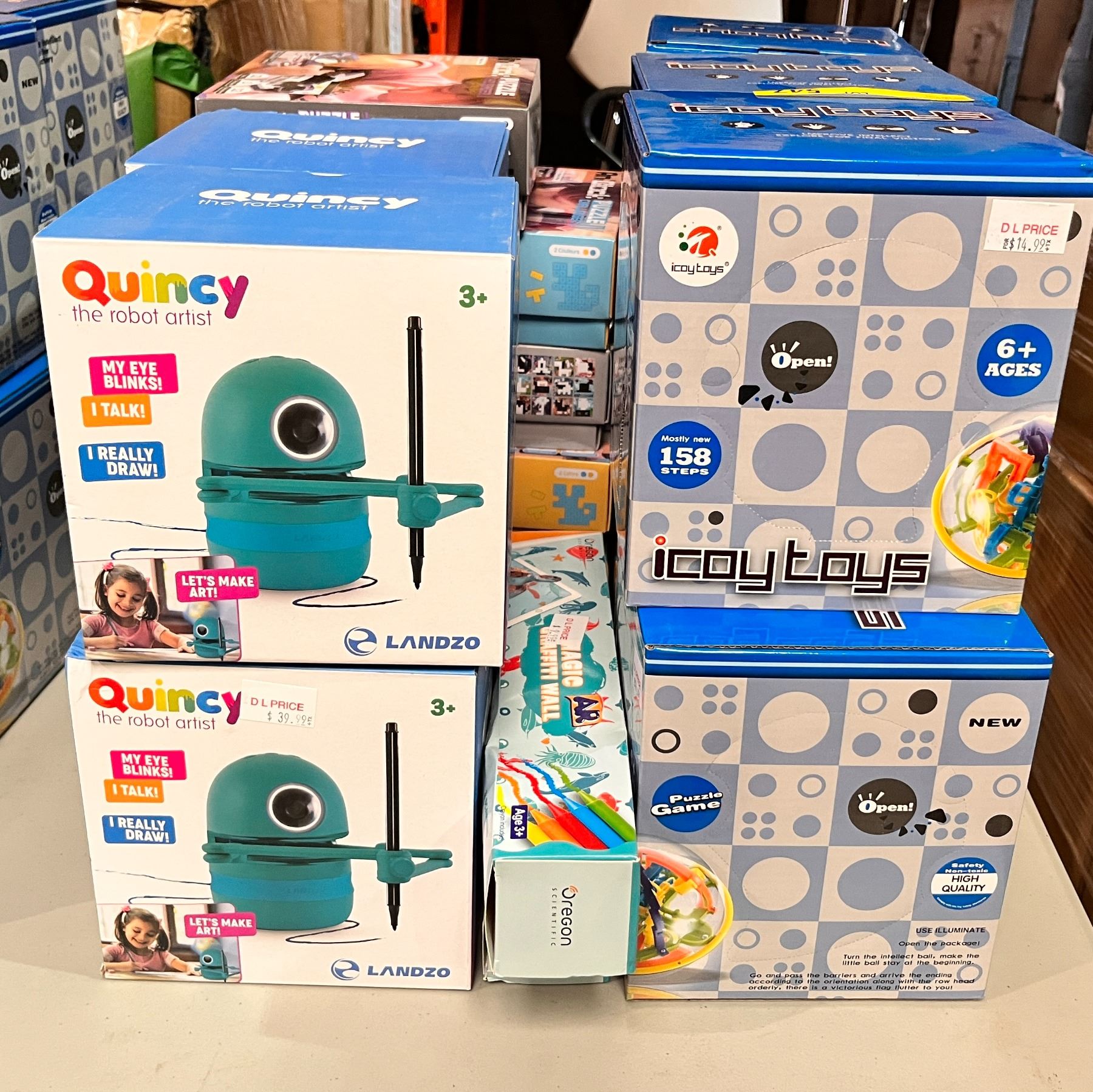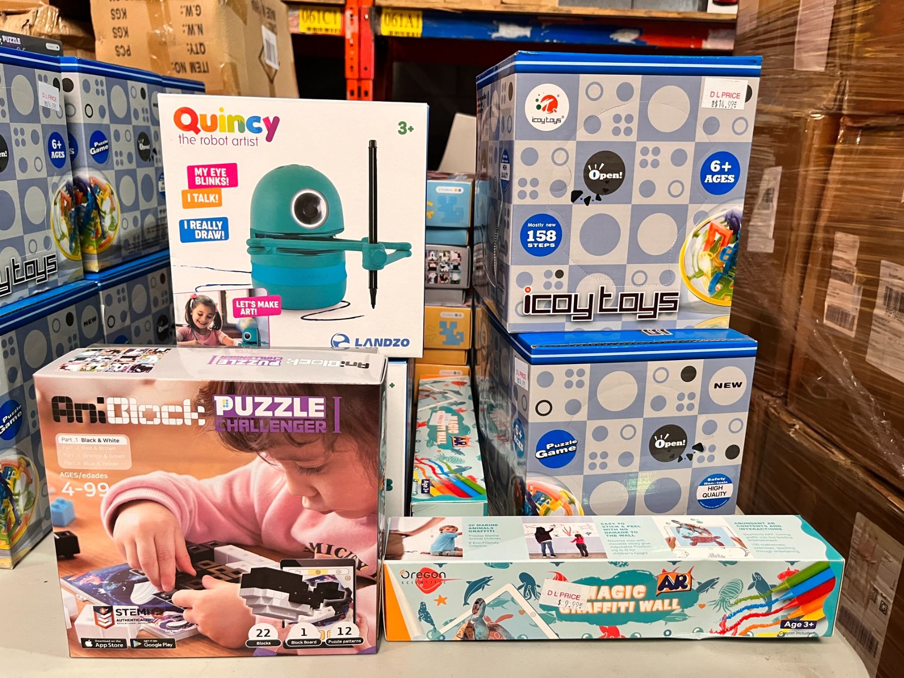 Large group of kids toys including - Quincy robot artist, icoy toys smart toy, magic graffiti wall toy, ani block puzzle, etc...