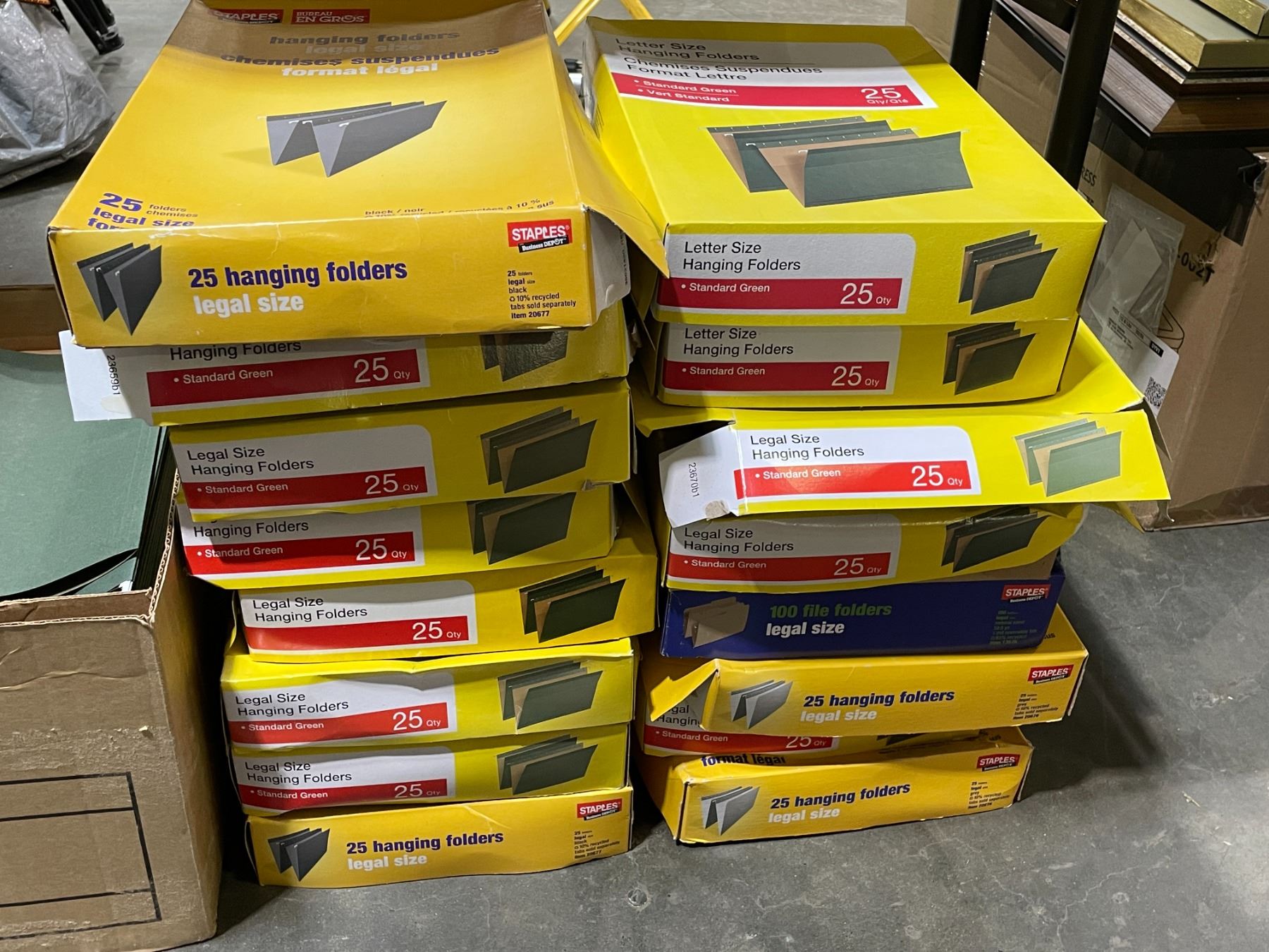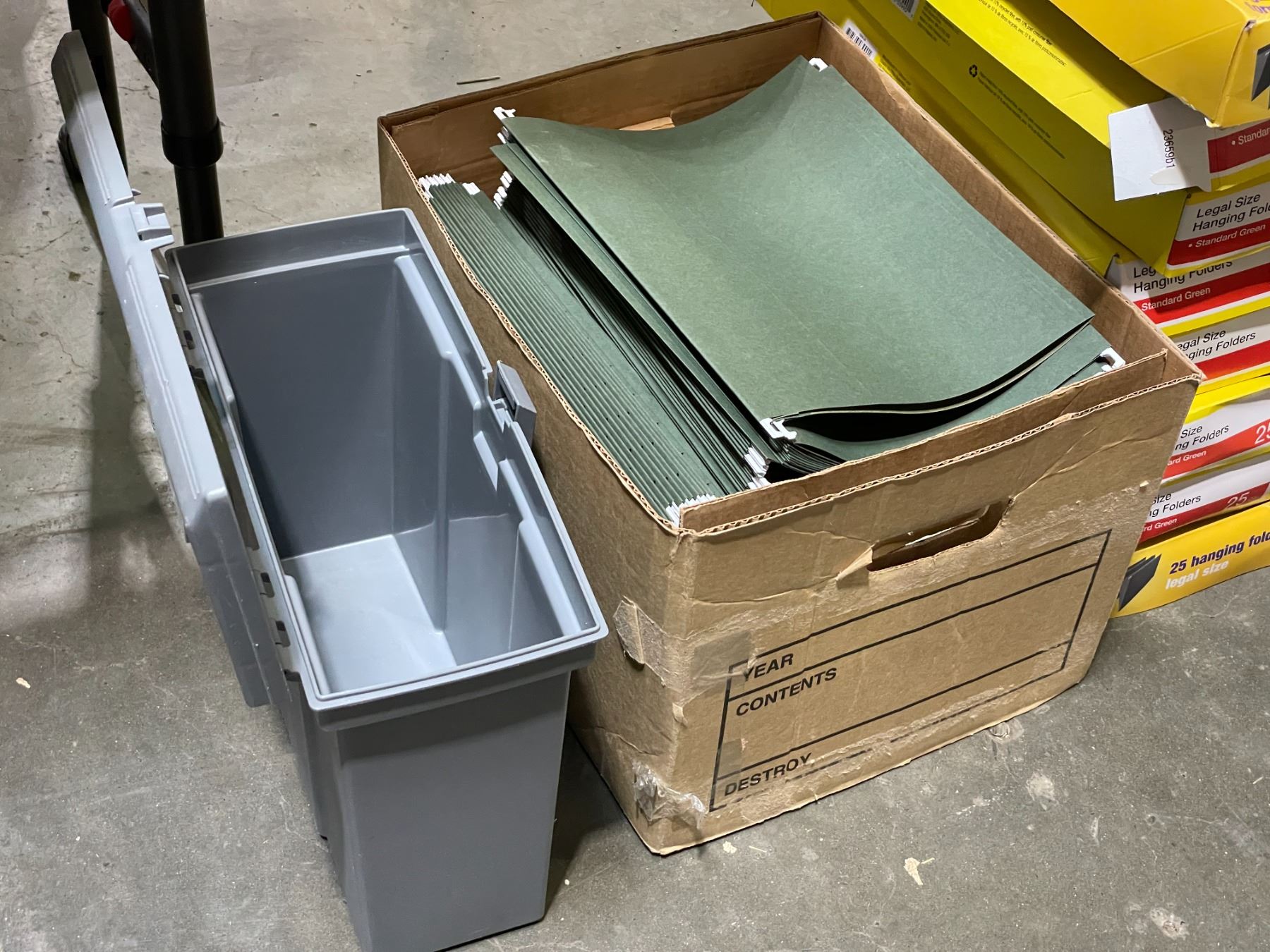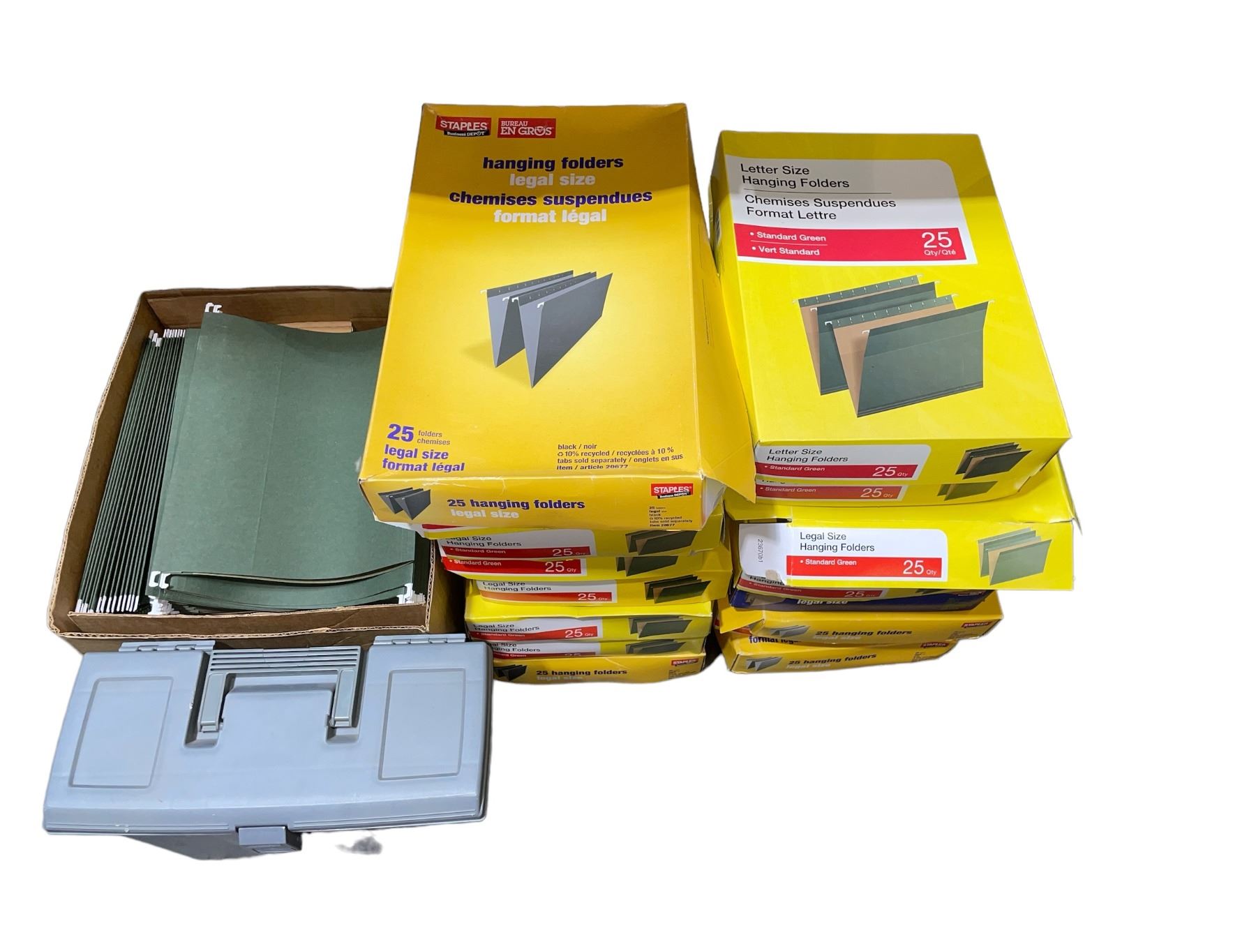 Large group of letter size hanging folders - approx 500 pcs & grey plastic storage tote