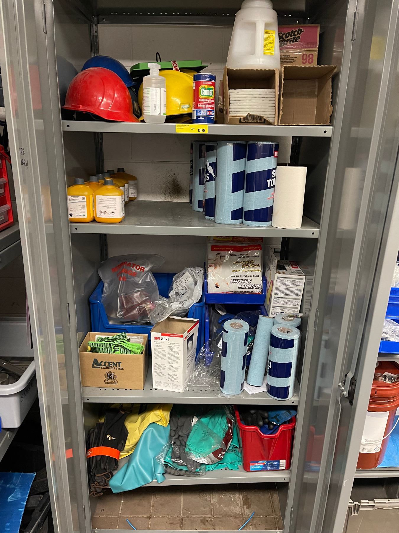 Large group of misc. & cleaning supplies - includes shop towels/ hard hats/ ink cartridges/ protective coveralls/ earplugs/ gloves etc. (CABINET NOT INCLUDED)