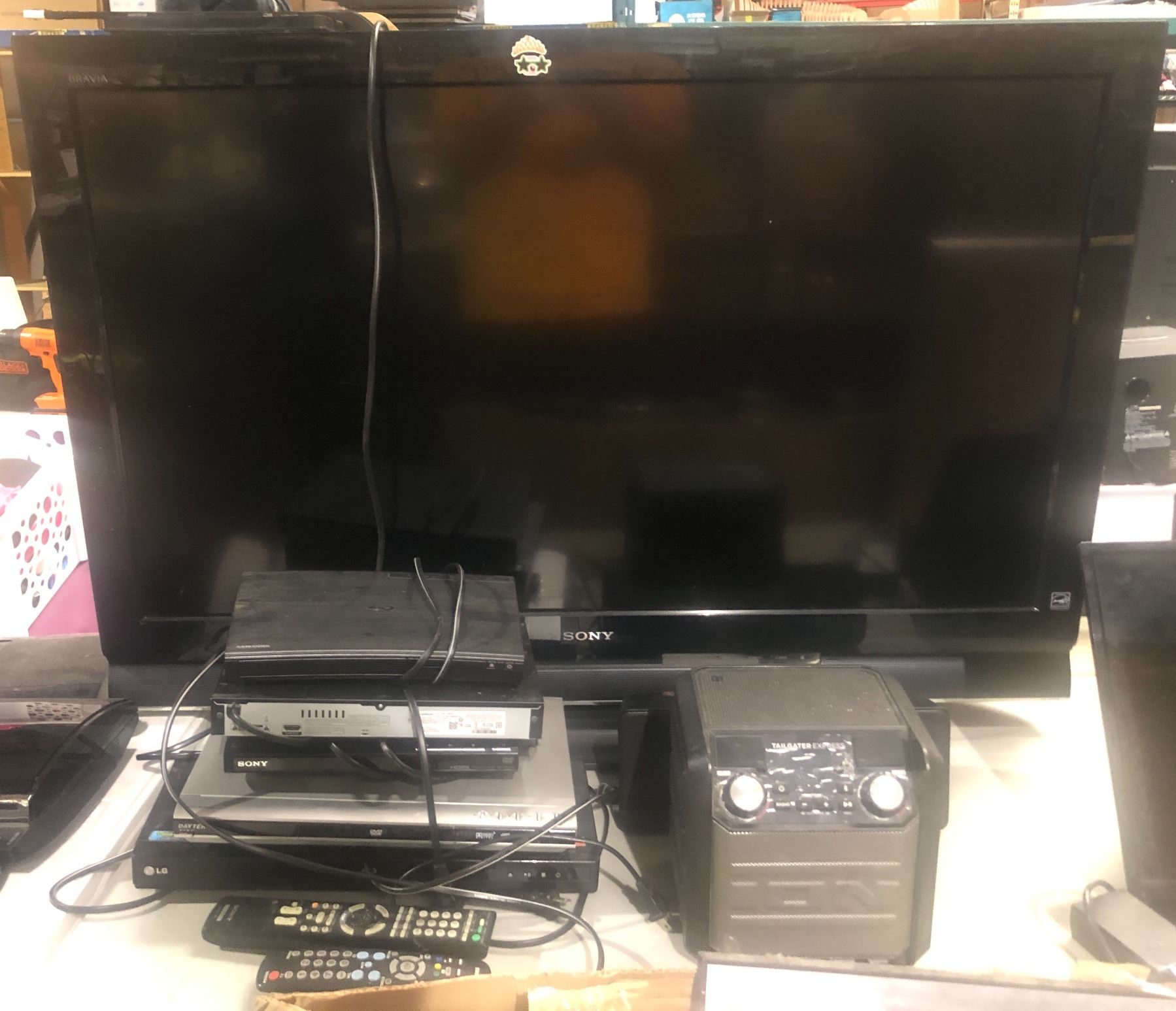 Large group of misc electronics includes - Sony Bravia 46in TV, assorted DVD players, tailgater express rodeo speaker, TV remotes, etc...