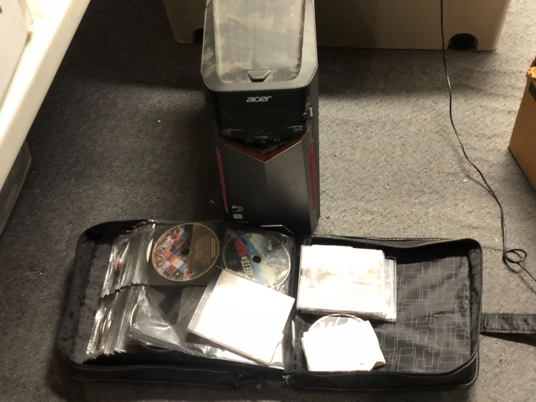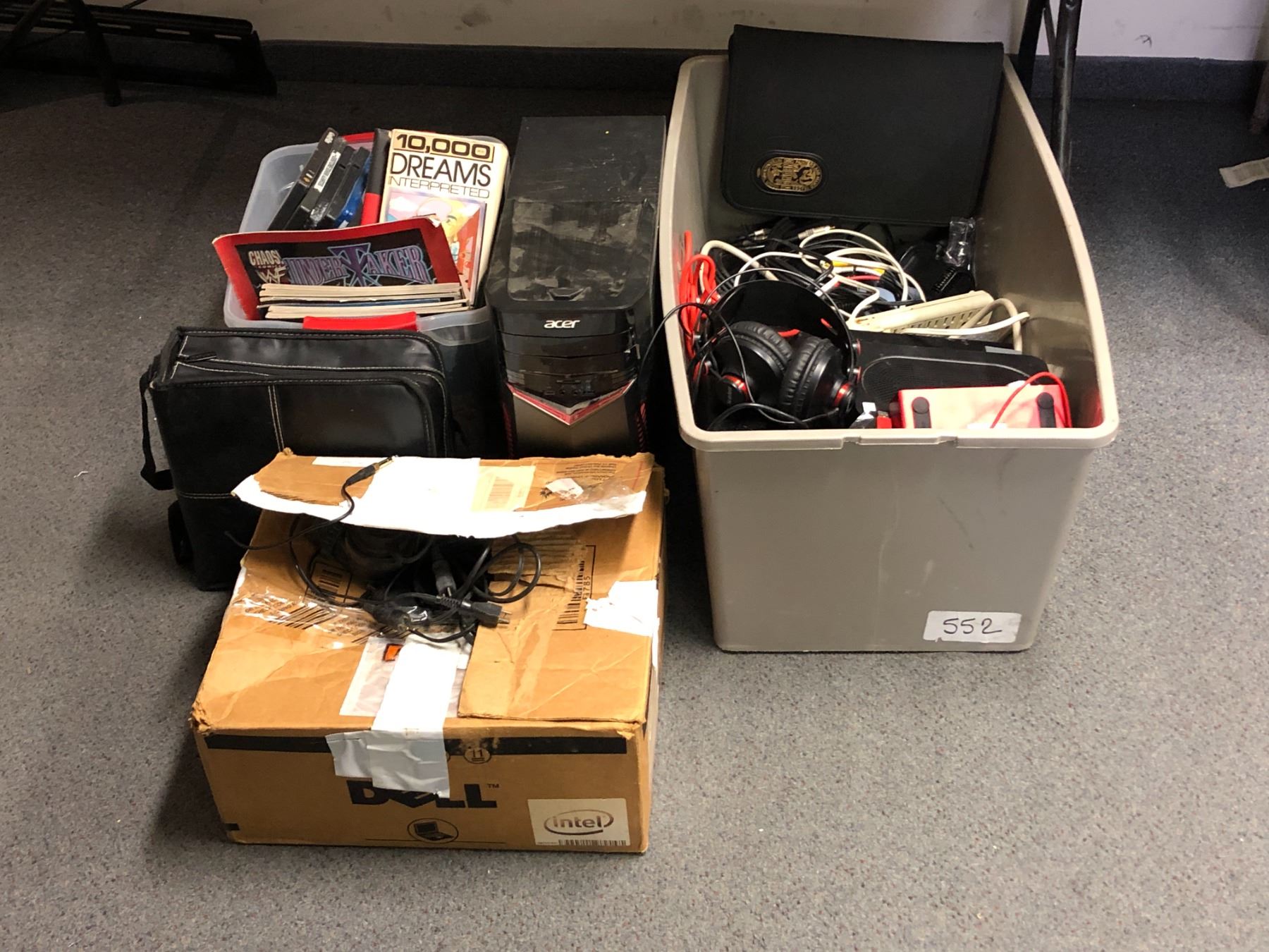 Large group of misc items including - acer computer, focusrite, misc cords, headphones, keyboard, mouse, books, dvds, etc...