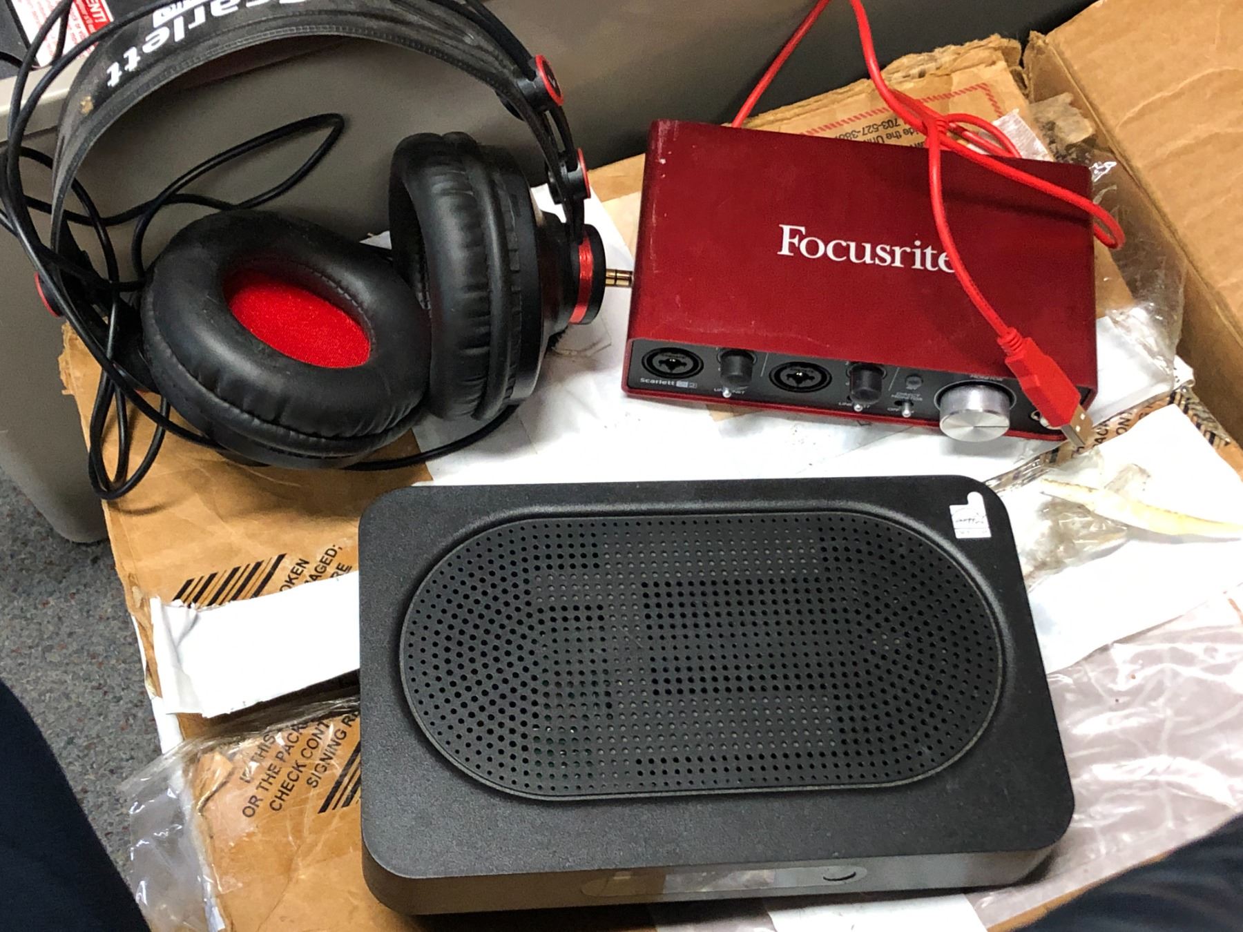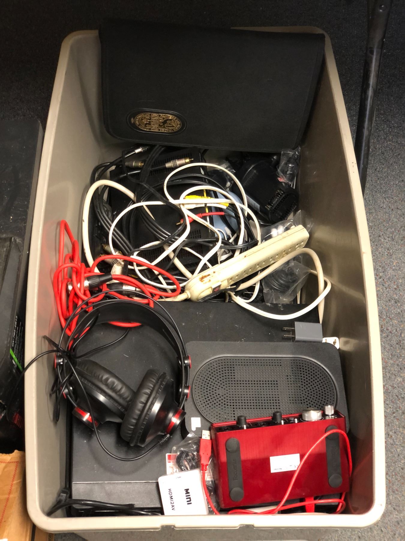 Large group of misc items including - acer computer, focusrite, misc cords, headphones, keyboard, mo