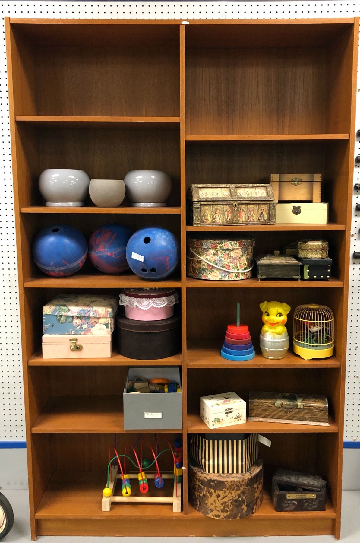 Large group of misc. set dec items - includes prop rubber bowling bowls/ ceramic vases/ jewelry boxes etc. (shelf not included)