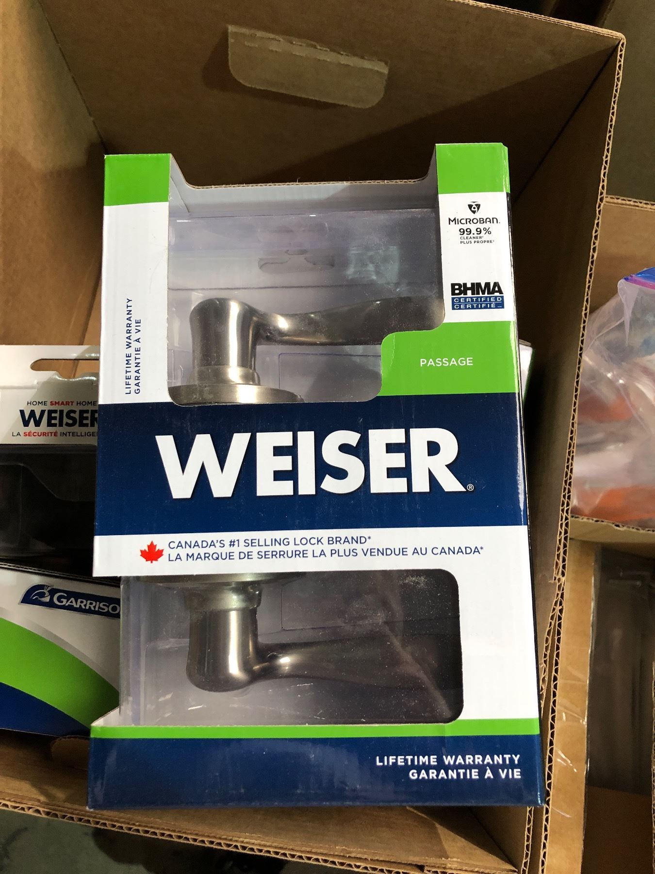 Large group of misc. set dec items including - door knobs + handles, vent gates, storage table (43in L x 31in H 21.5 D), door hardware, address numbers, curtain hardware, etc...