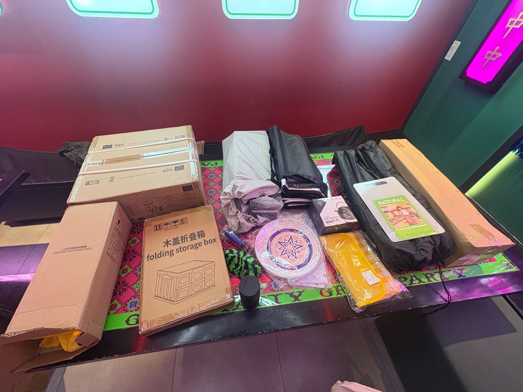 Large group of new camping gear - includes folding storage box, 2 person backpacking tent, BBQ grill