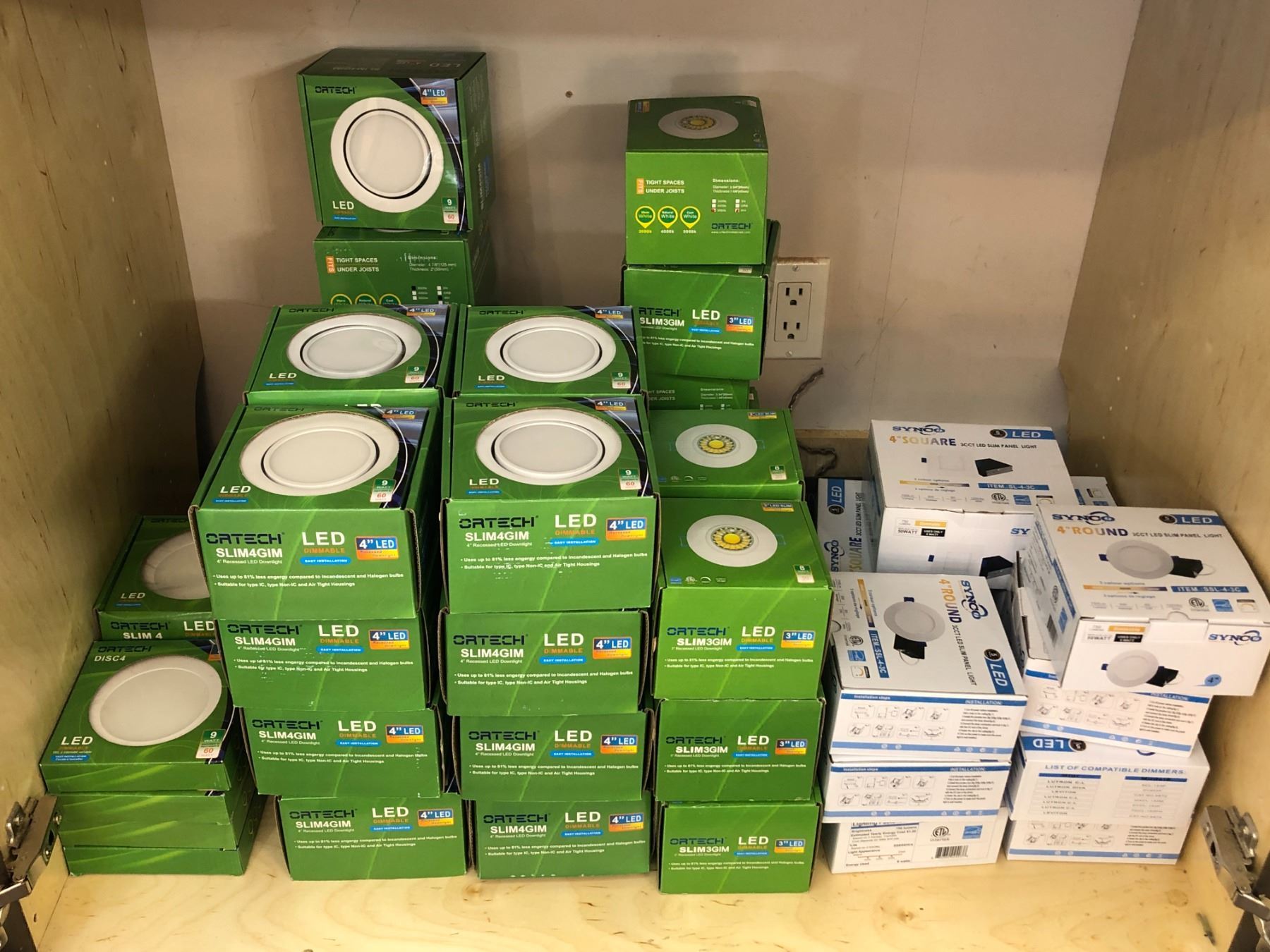 Large group of ortech 4in recessed LED downlights in boxes & single 4in round 3CCT LED slim panel in boxes (approx. 50 boxes)