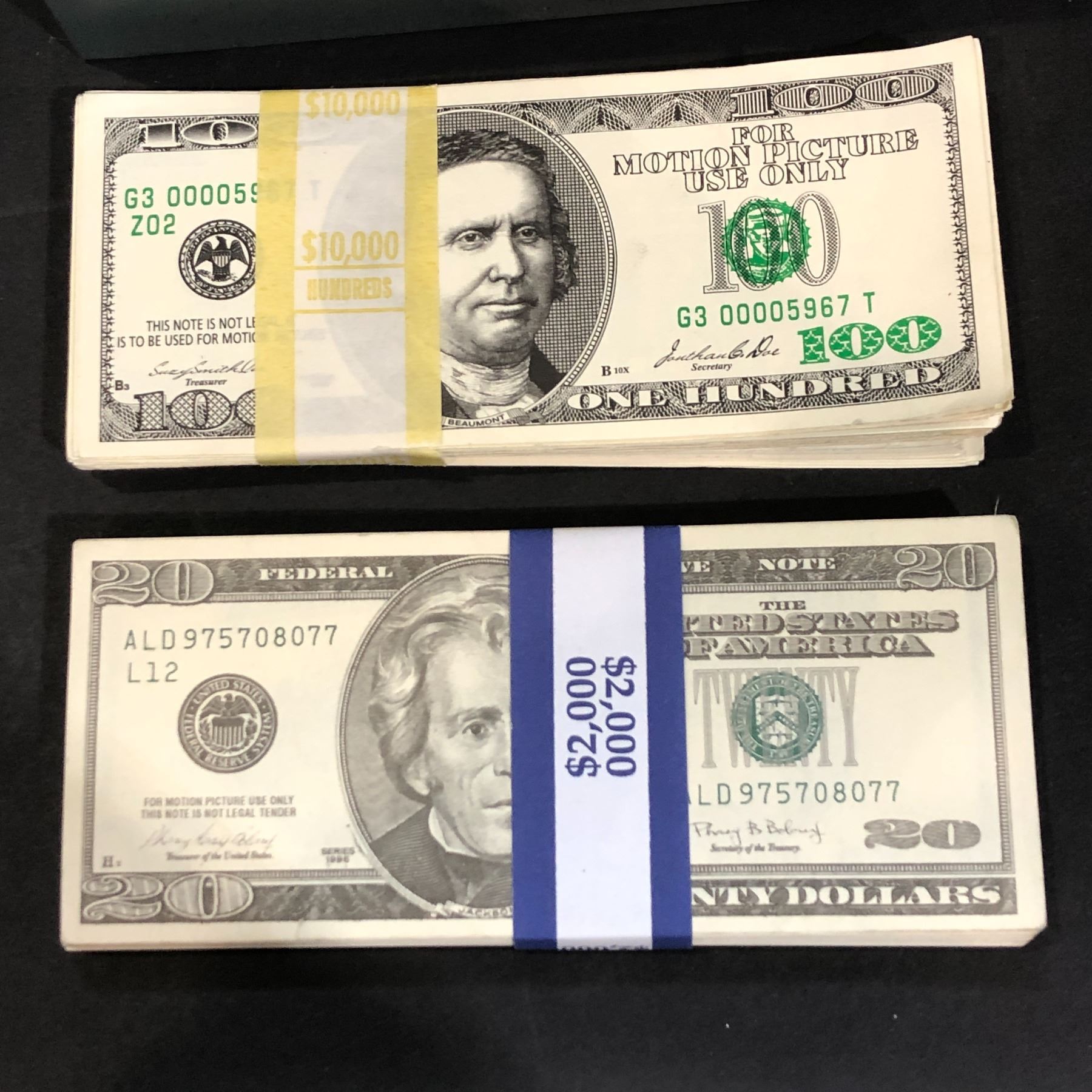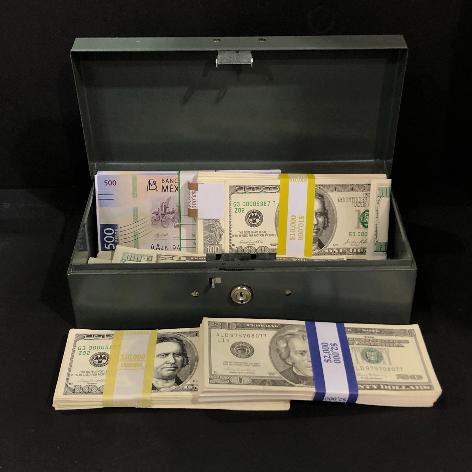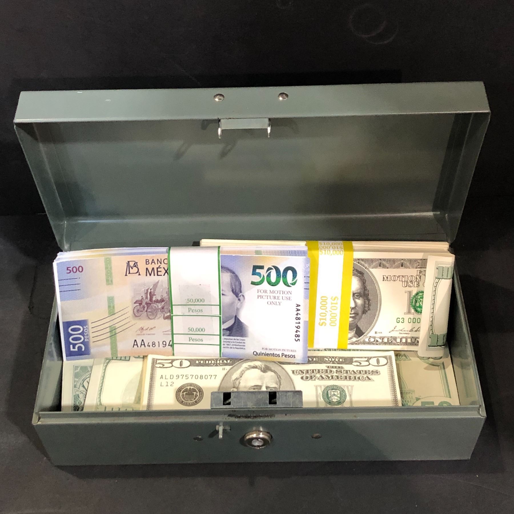 Large group of prop money & small storage tin