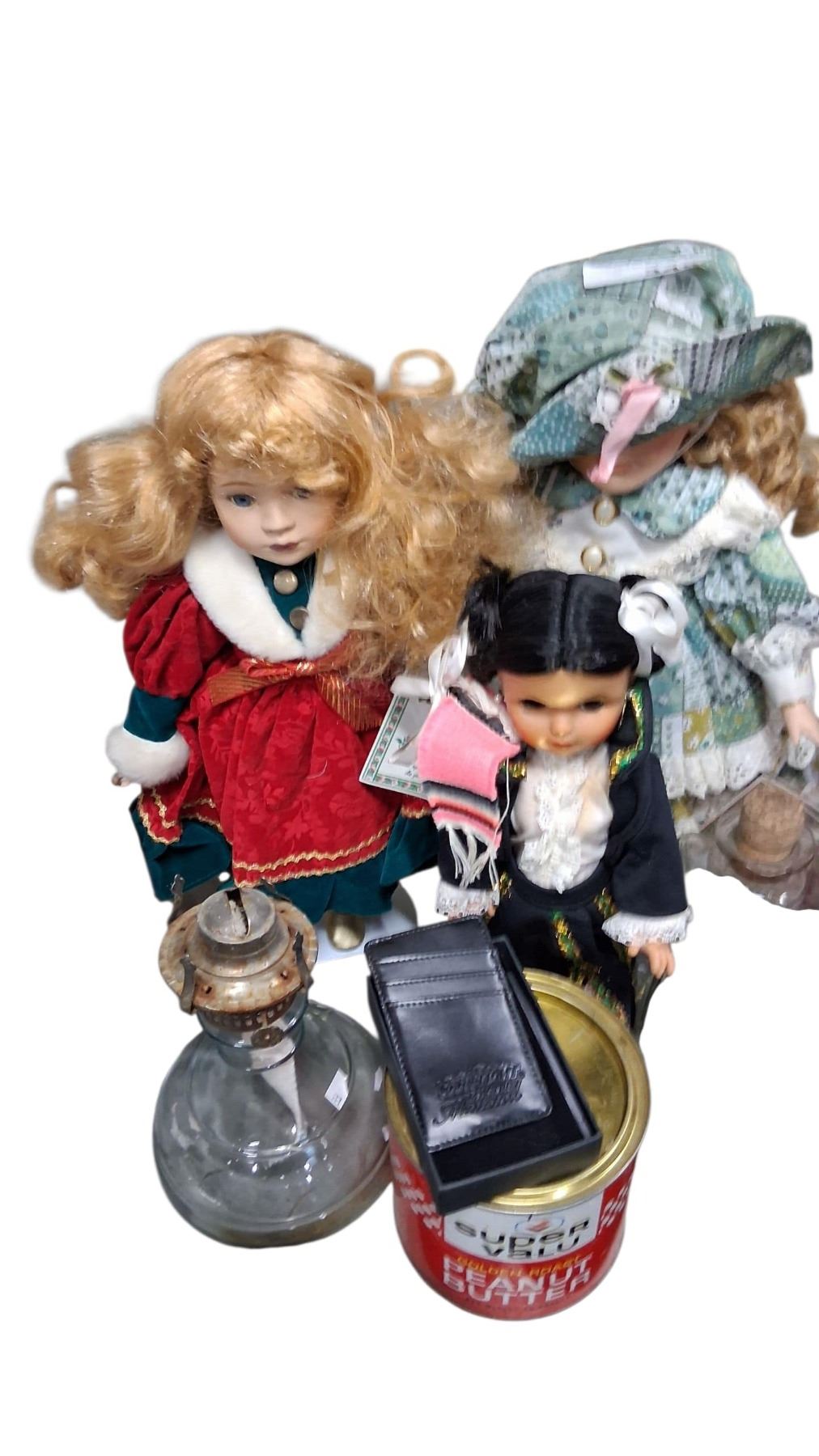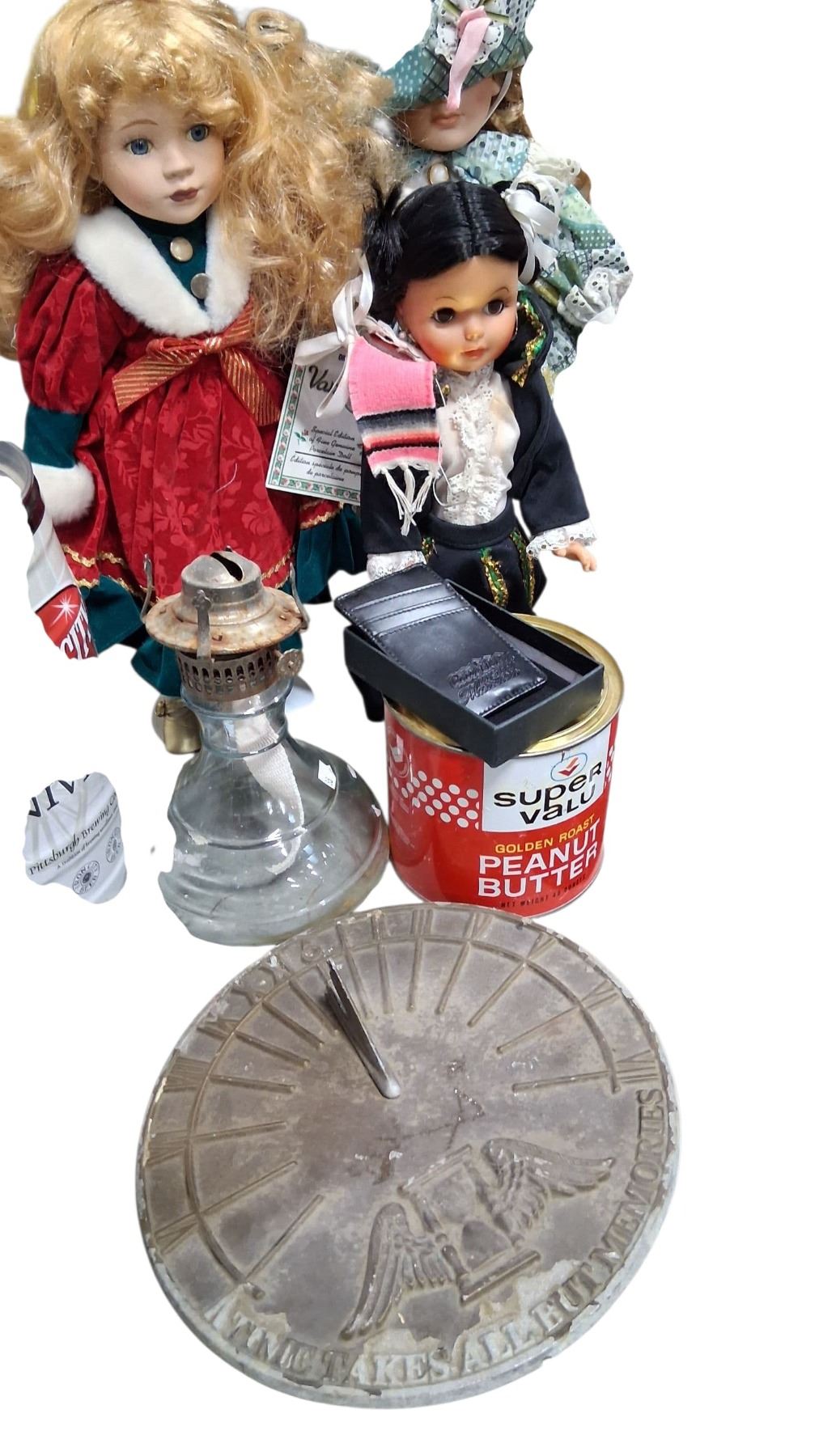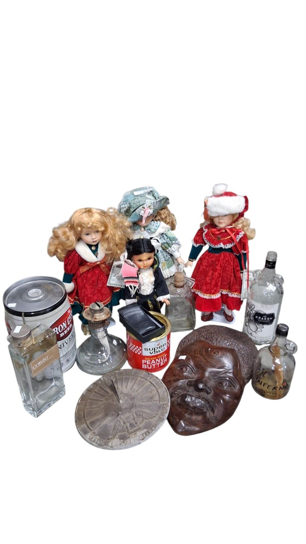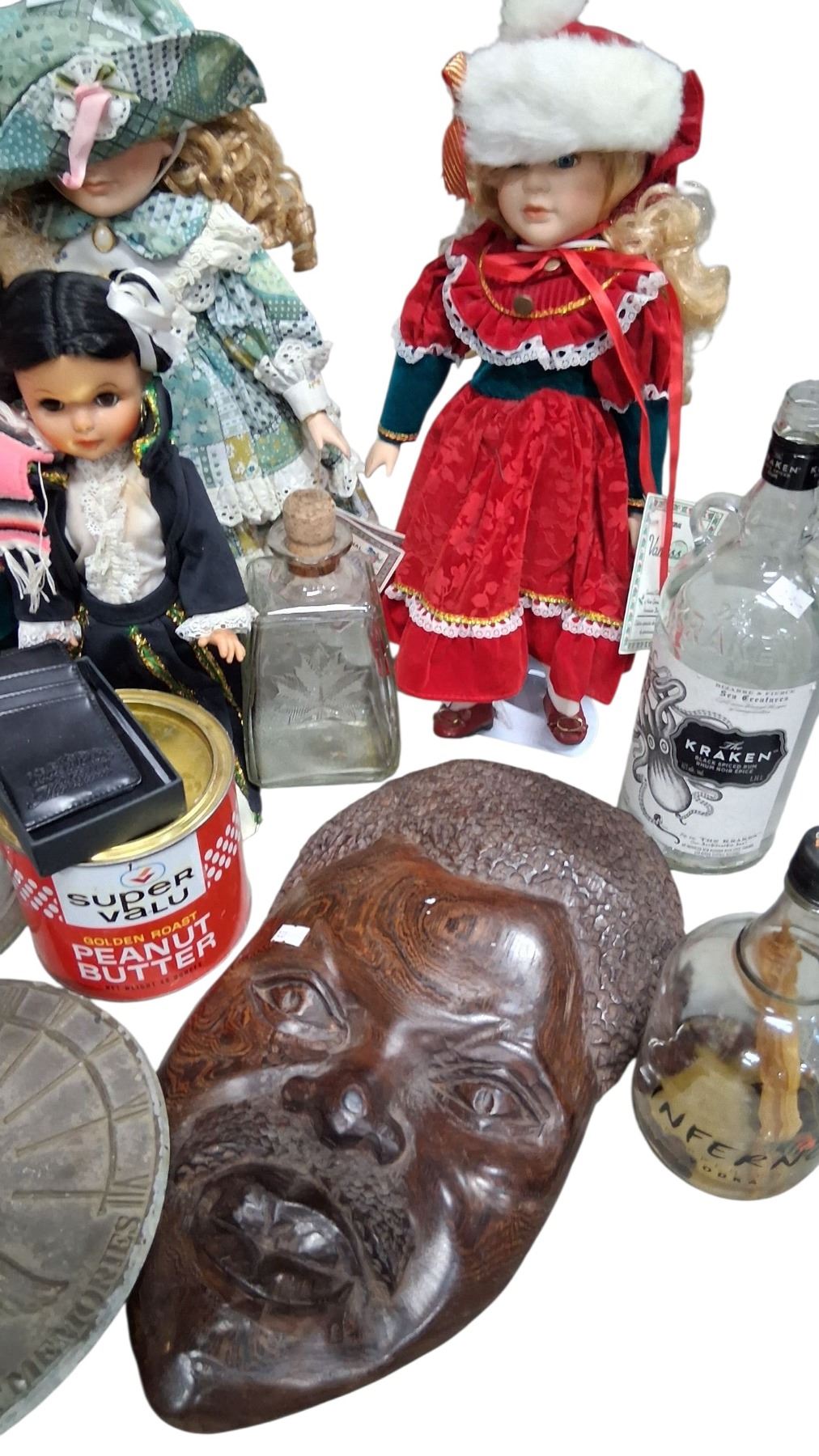 Large lot including vintage dolls, tins, oil lamp, wooden mask, Coors Light wallet