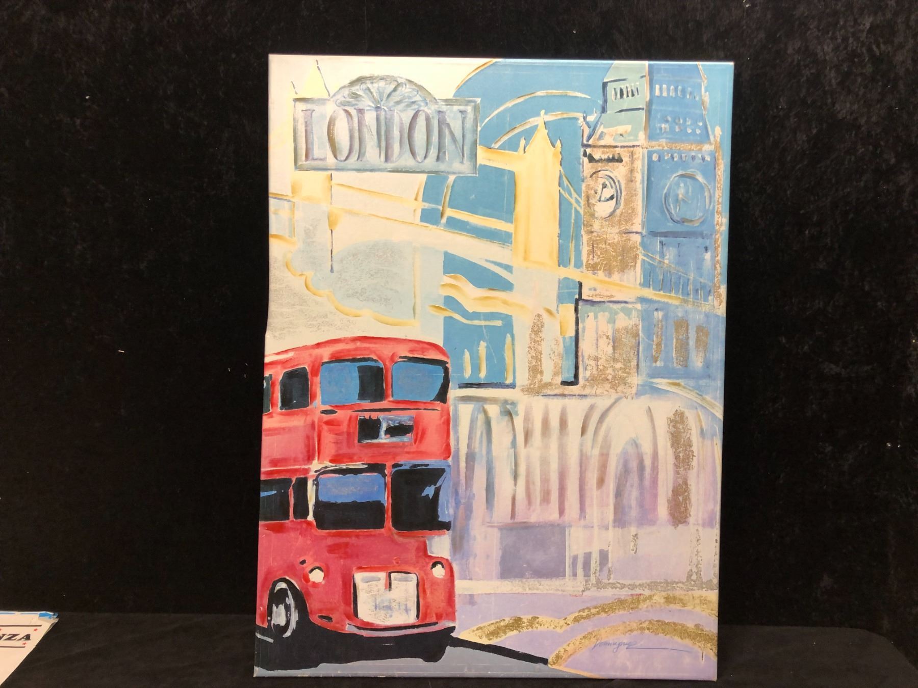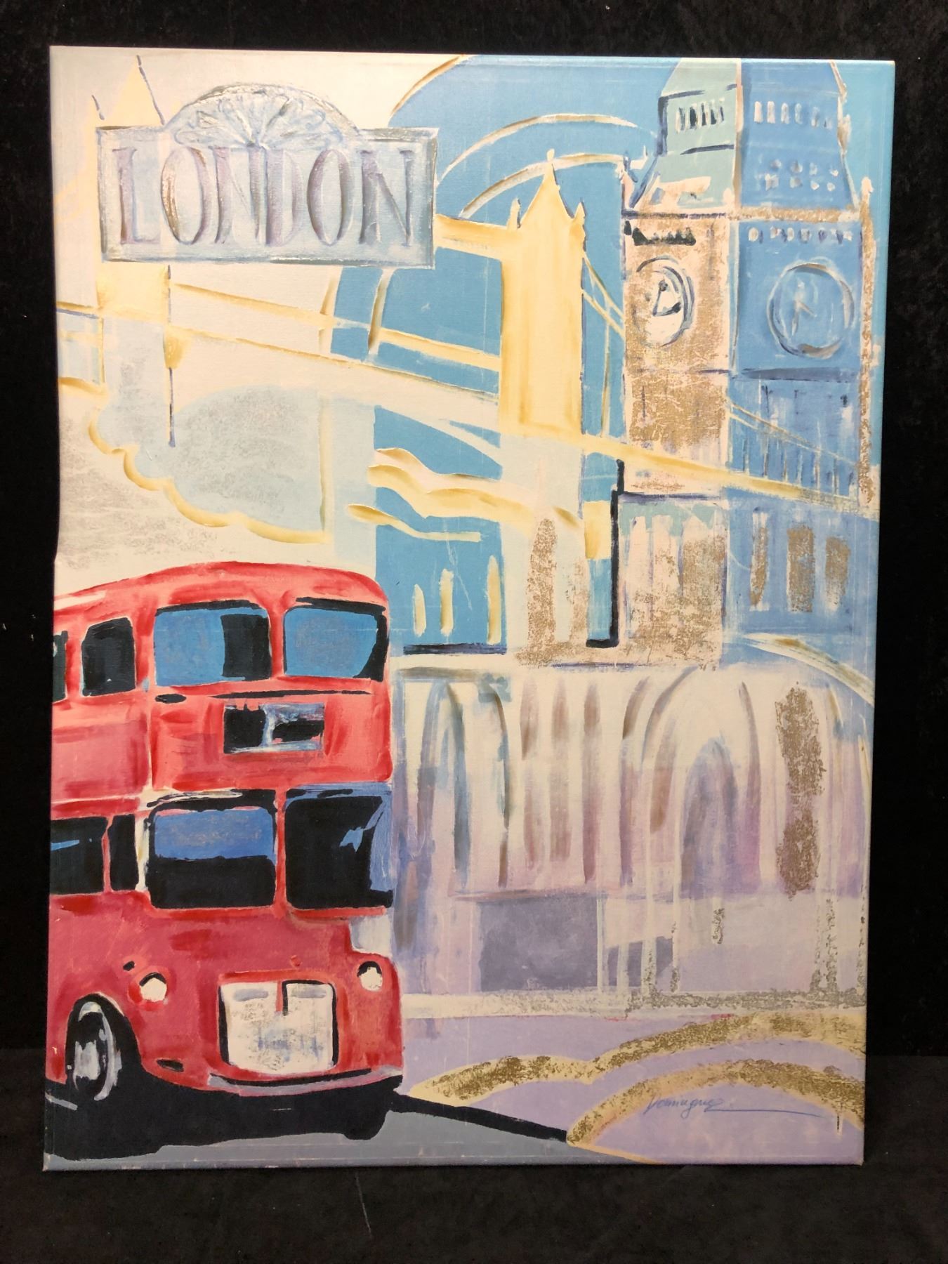 Large oil on canvas transfer print London Big Ben & Double Decker Bus