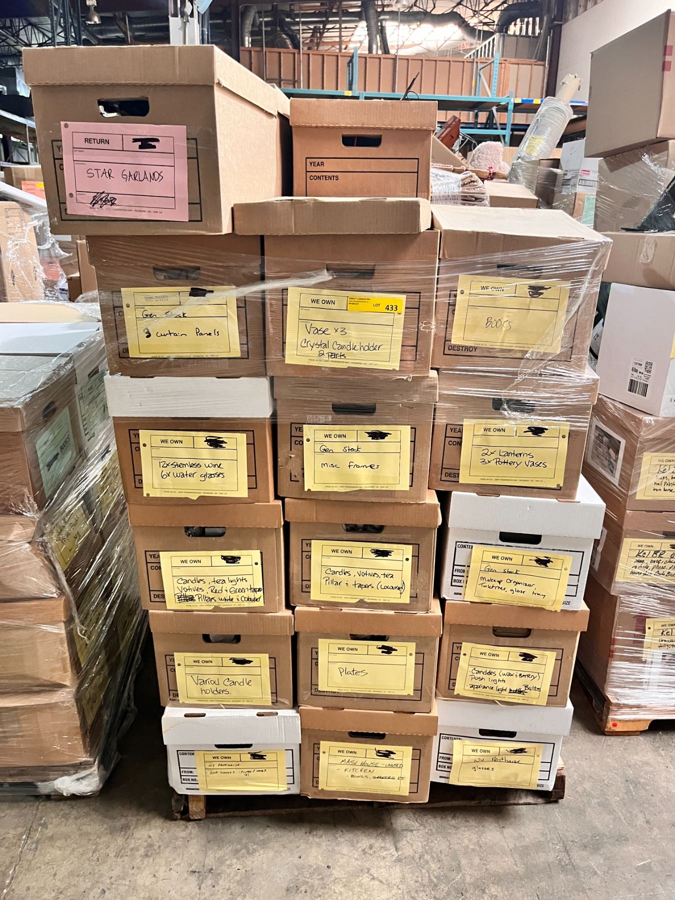 Large pallet of misc items including - pottery vases, trophies, photo frames, books, lanterns, stemless glasses, water glasses, crystal candle holder, etc...(items may vary)