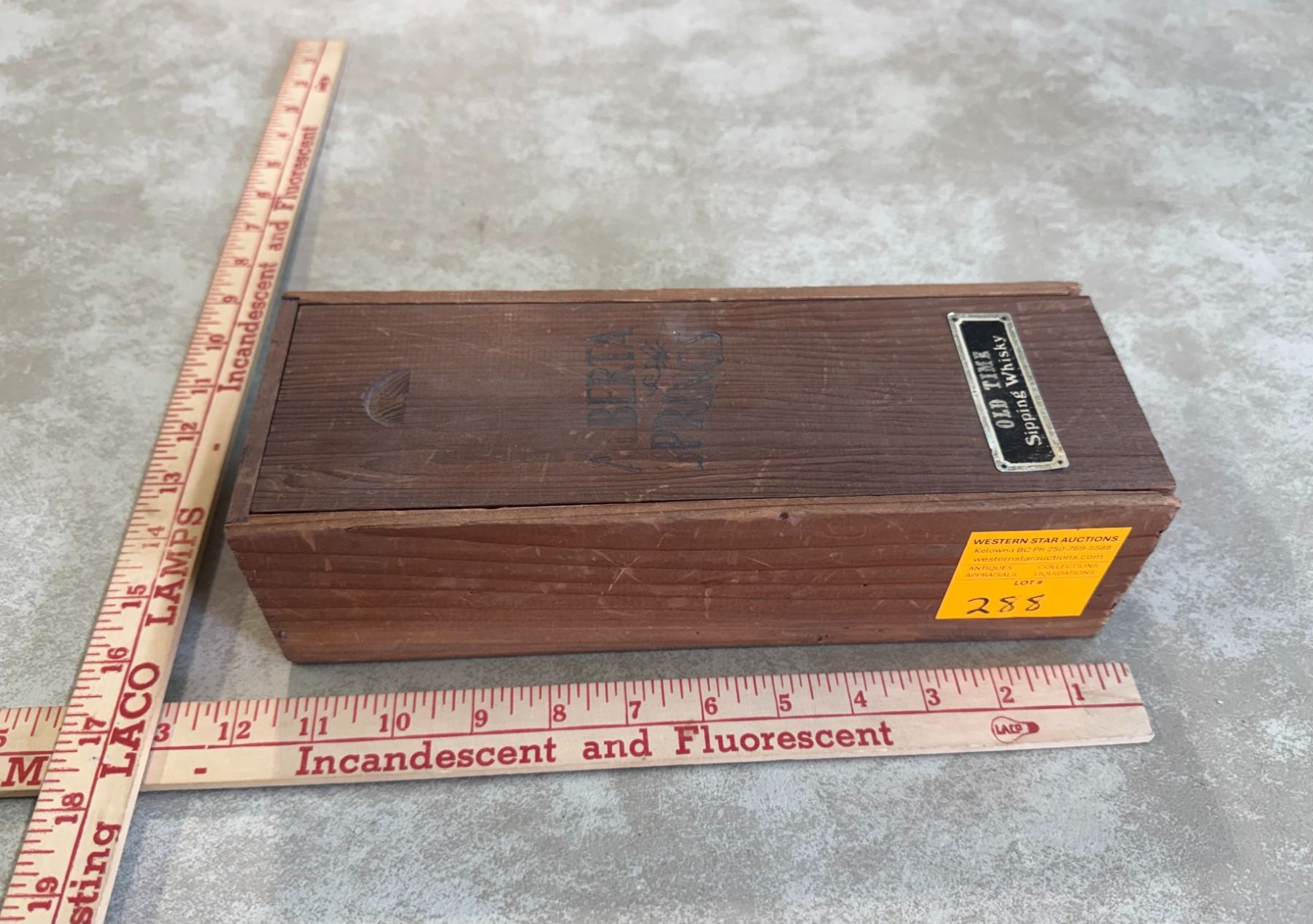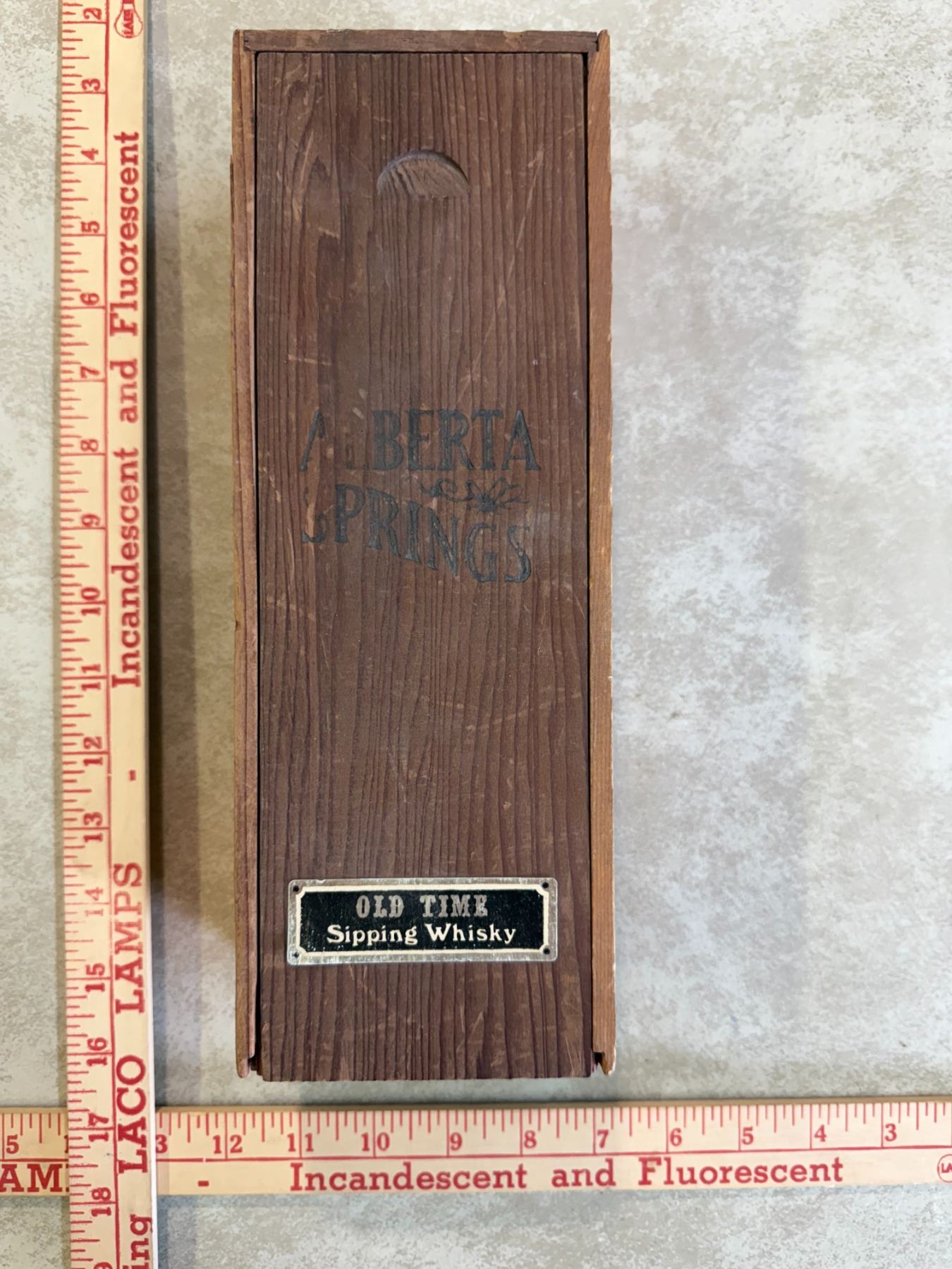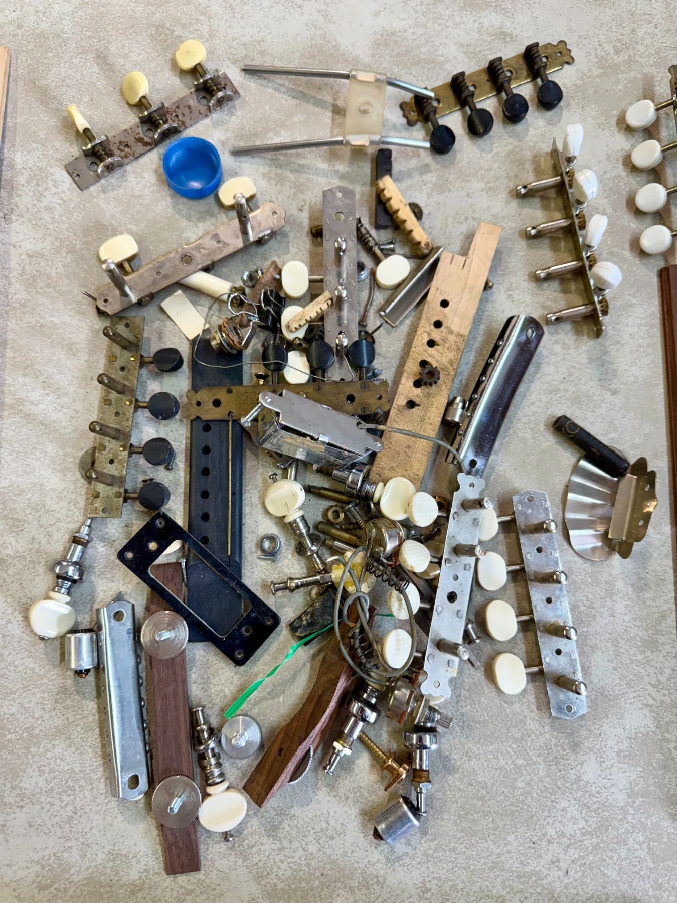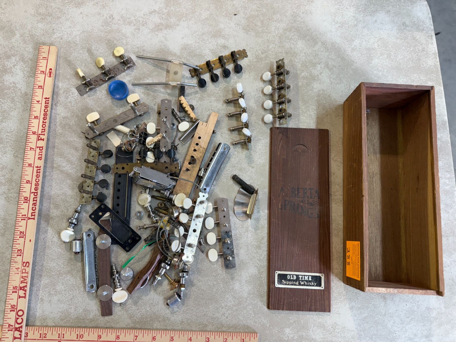 Large quantity of various guitar parts in vintage Alberta Springs whiskey box