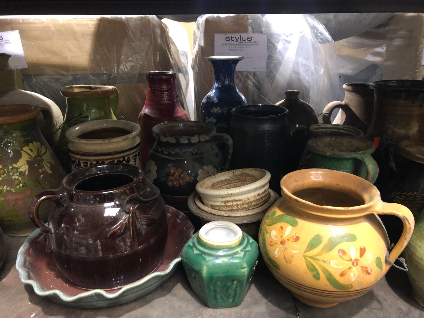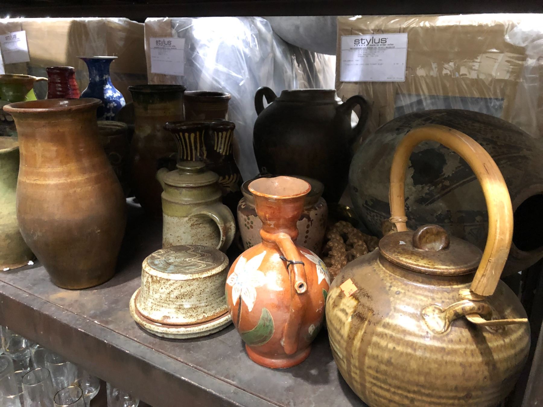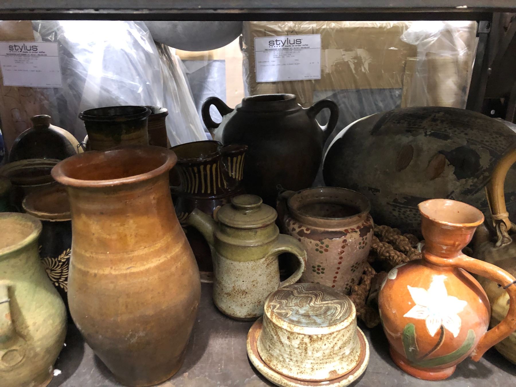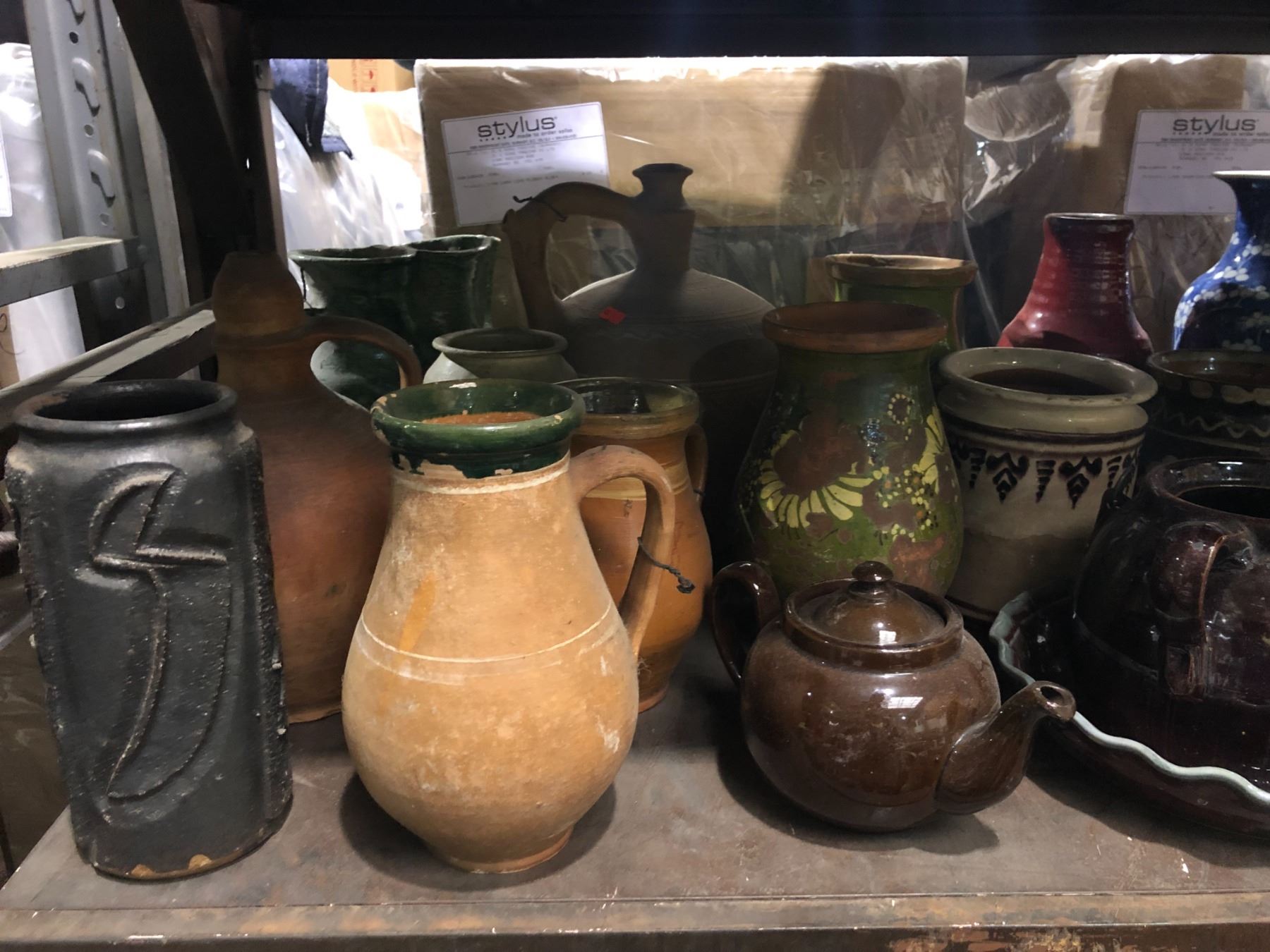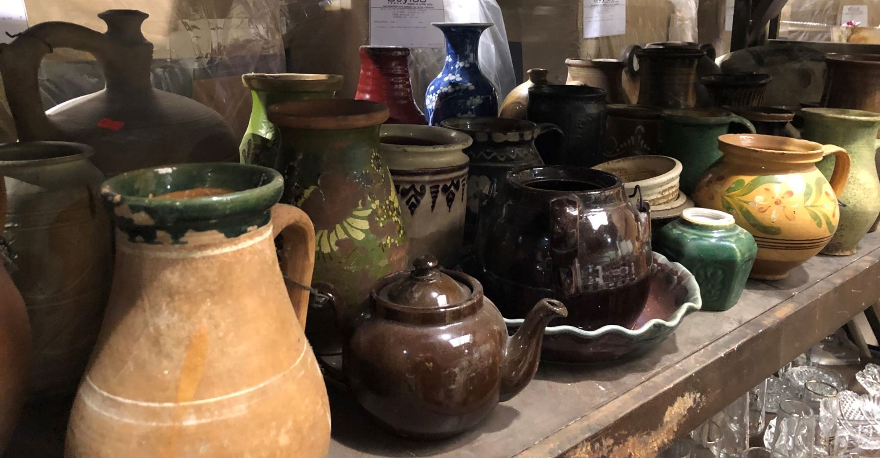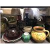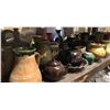Large shelf full of assorted ceramic pottery pcs.