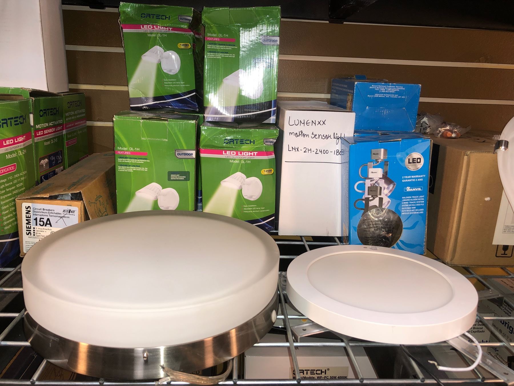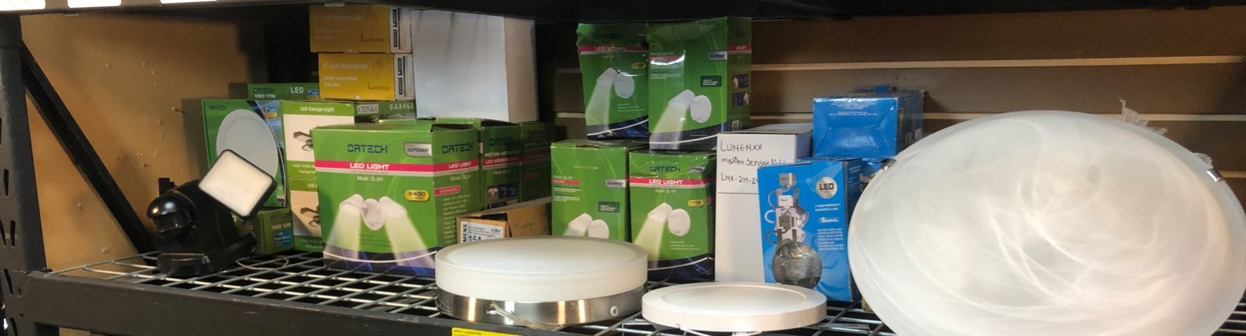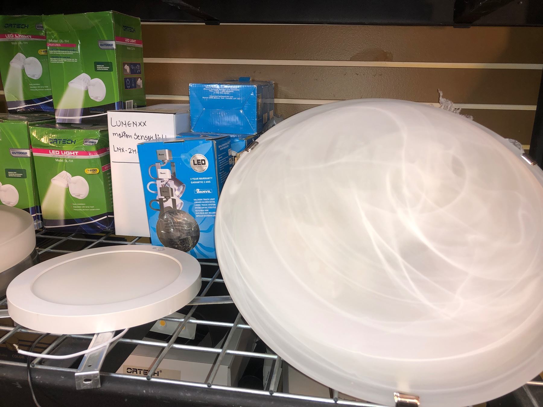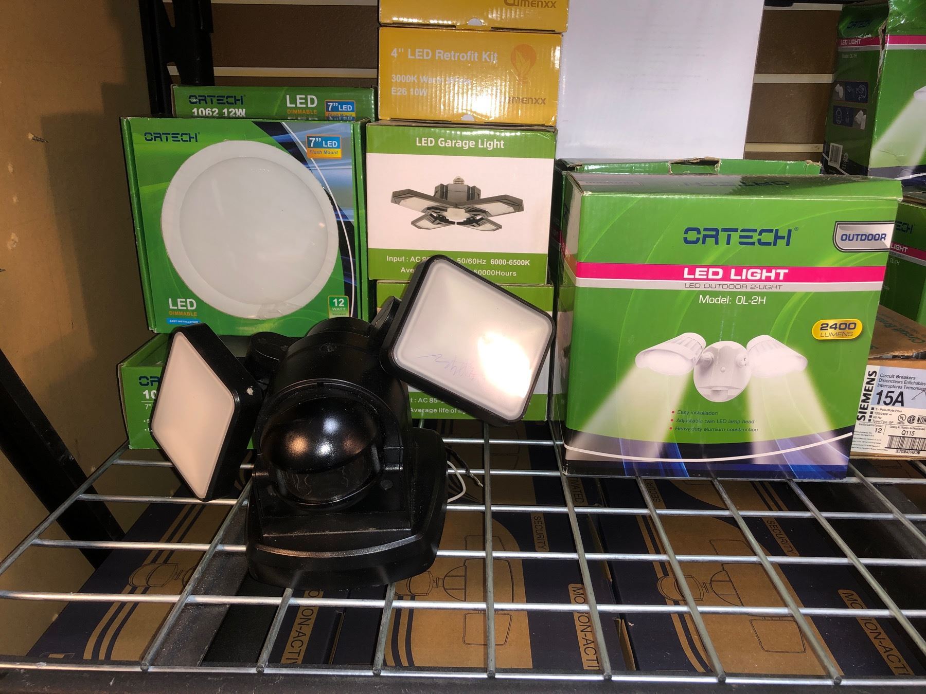 Large shelf lot full of assorted new lighting includes - Ortech 7in flush mounts, LED garage lights, outdoor LED 2-lights, Halogen track lights