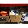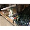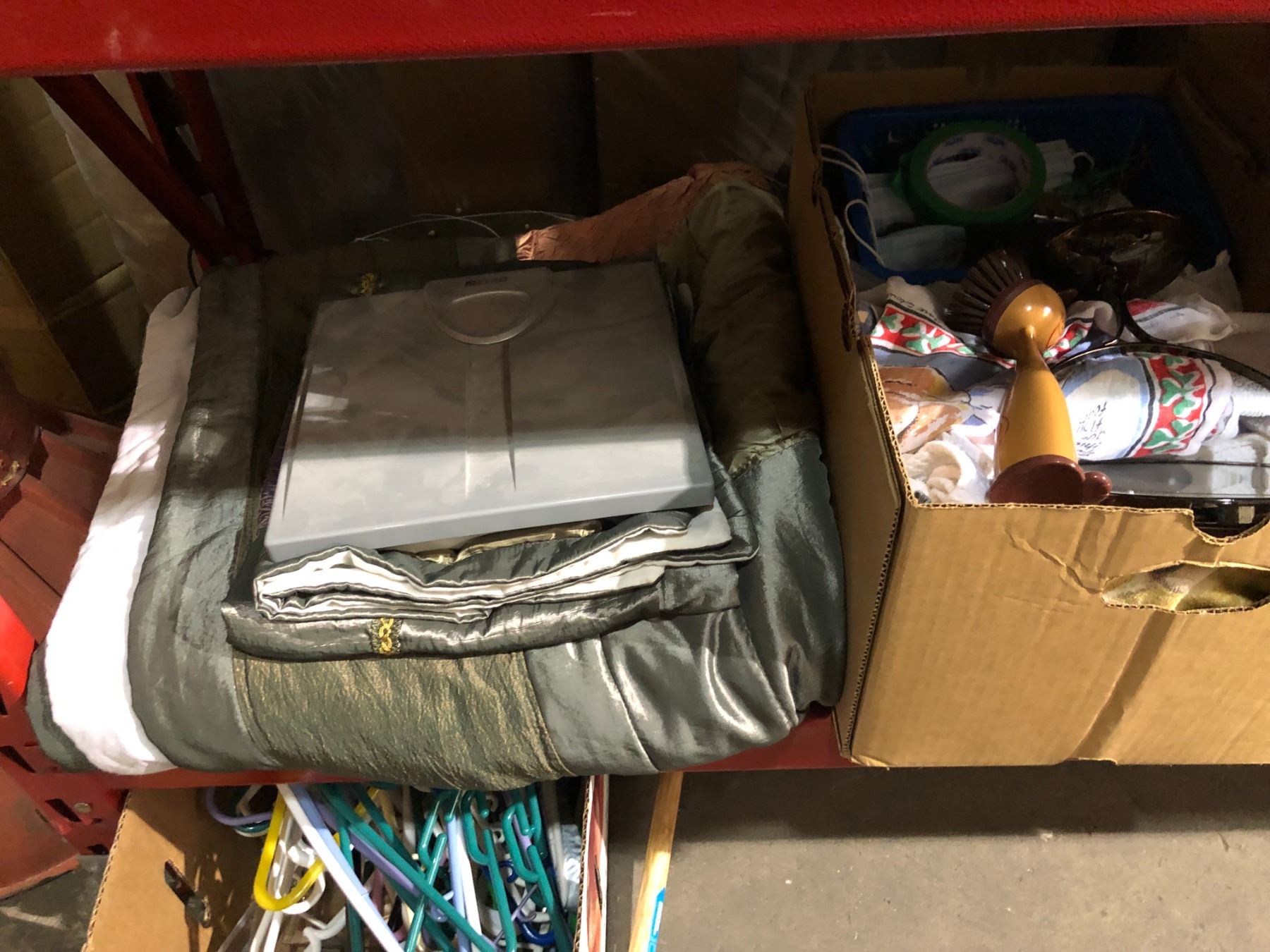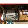 Large shelf lot of assorted general household items - blankets & towel/ Tupperware container/ room fan/ coat hangers etc.