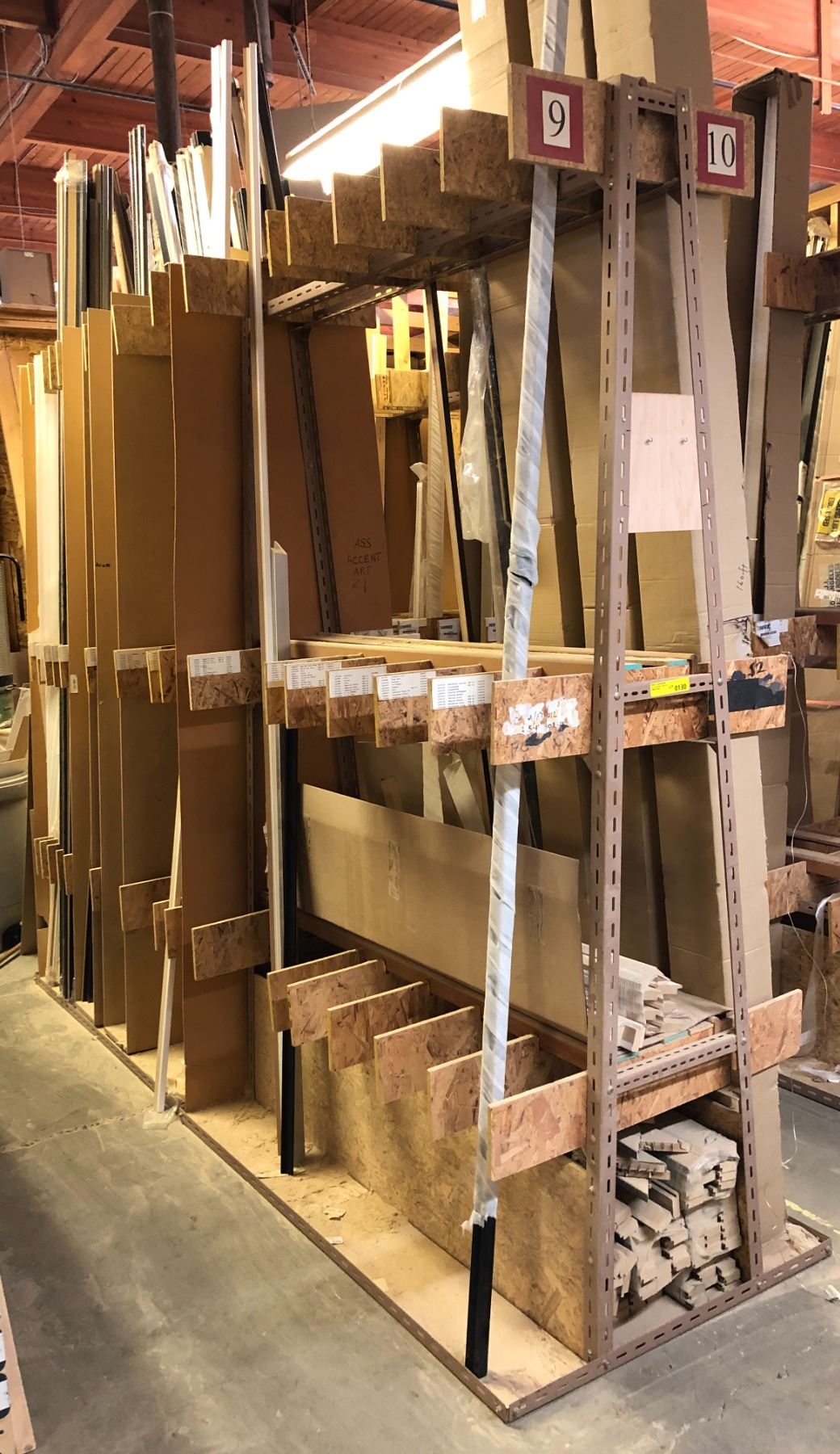 Large shelf lot of wood mouldings for picture frames w/ custom made shelving (approx. 10ft long)