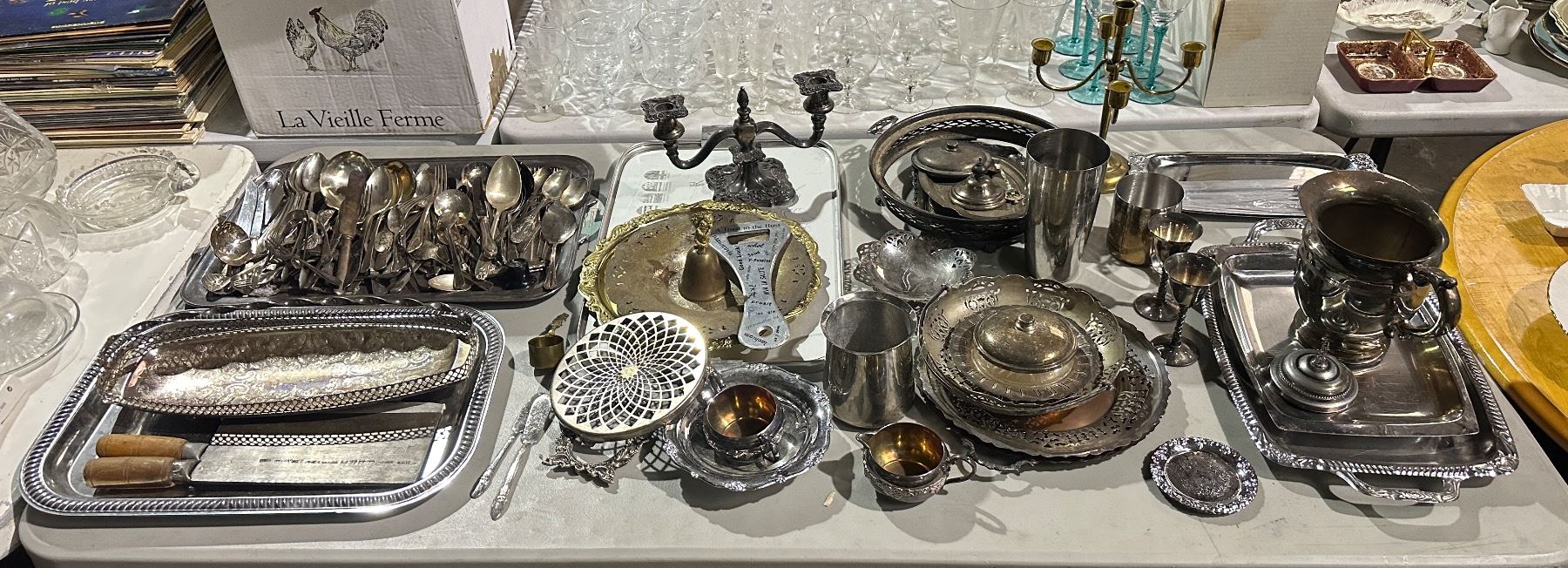 Large table top of silverware including - utensils, butcher knife, serving trays, candle holders, jug, etc...