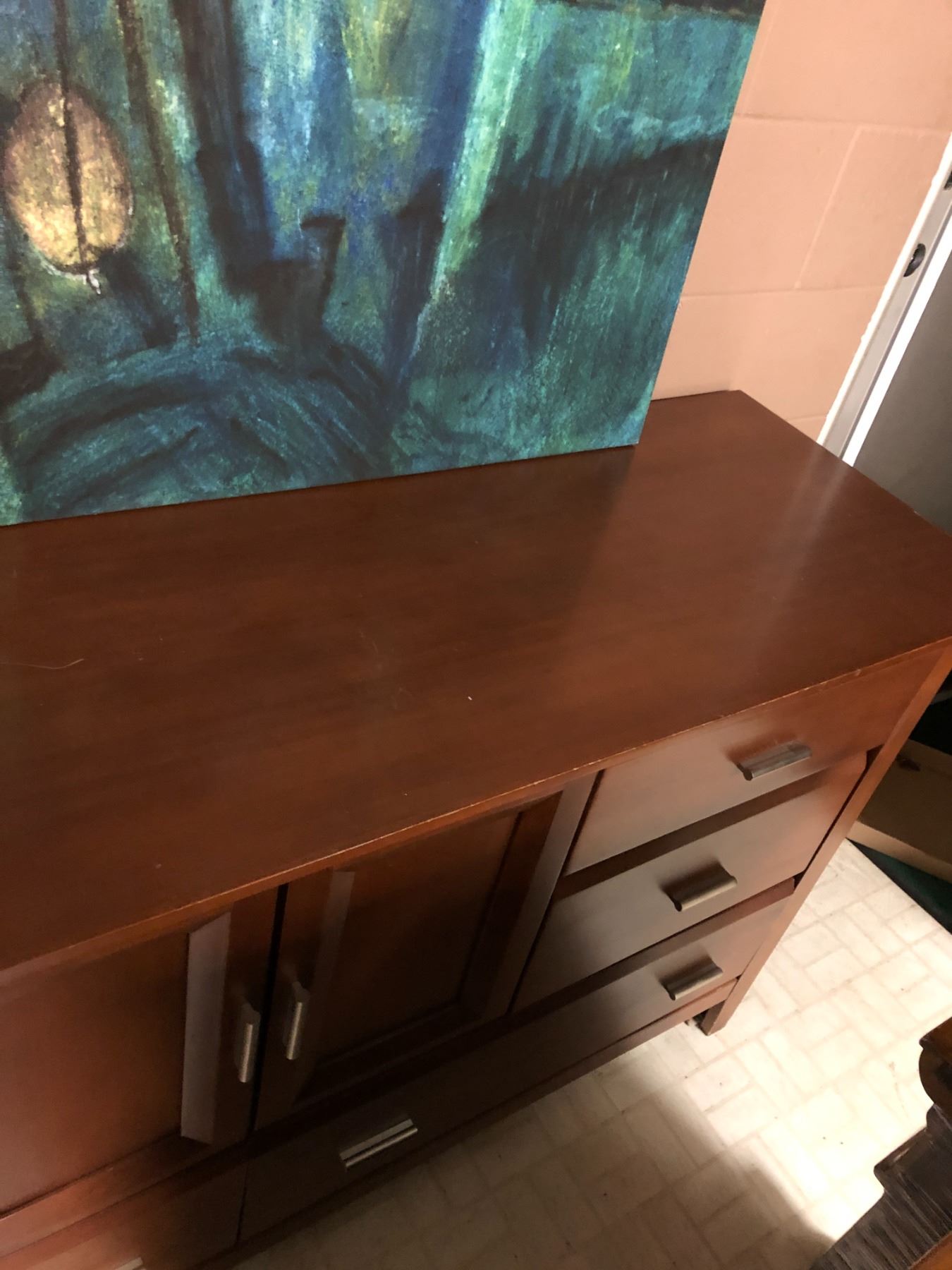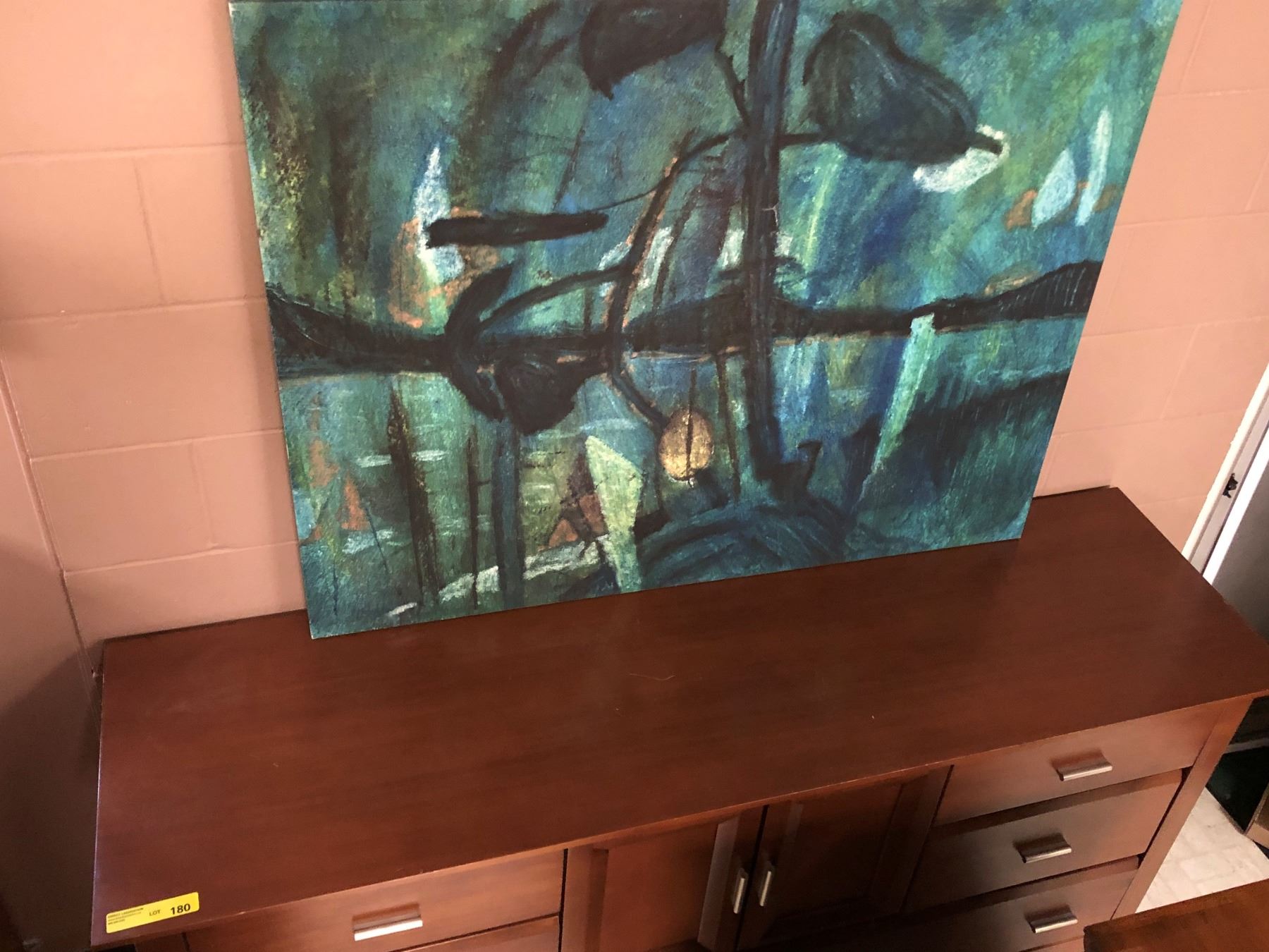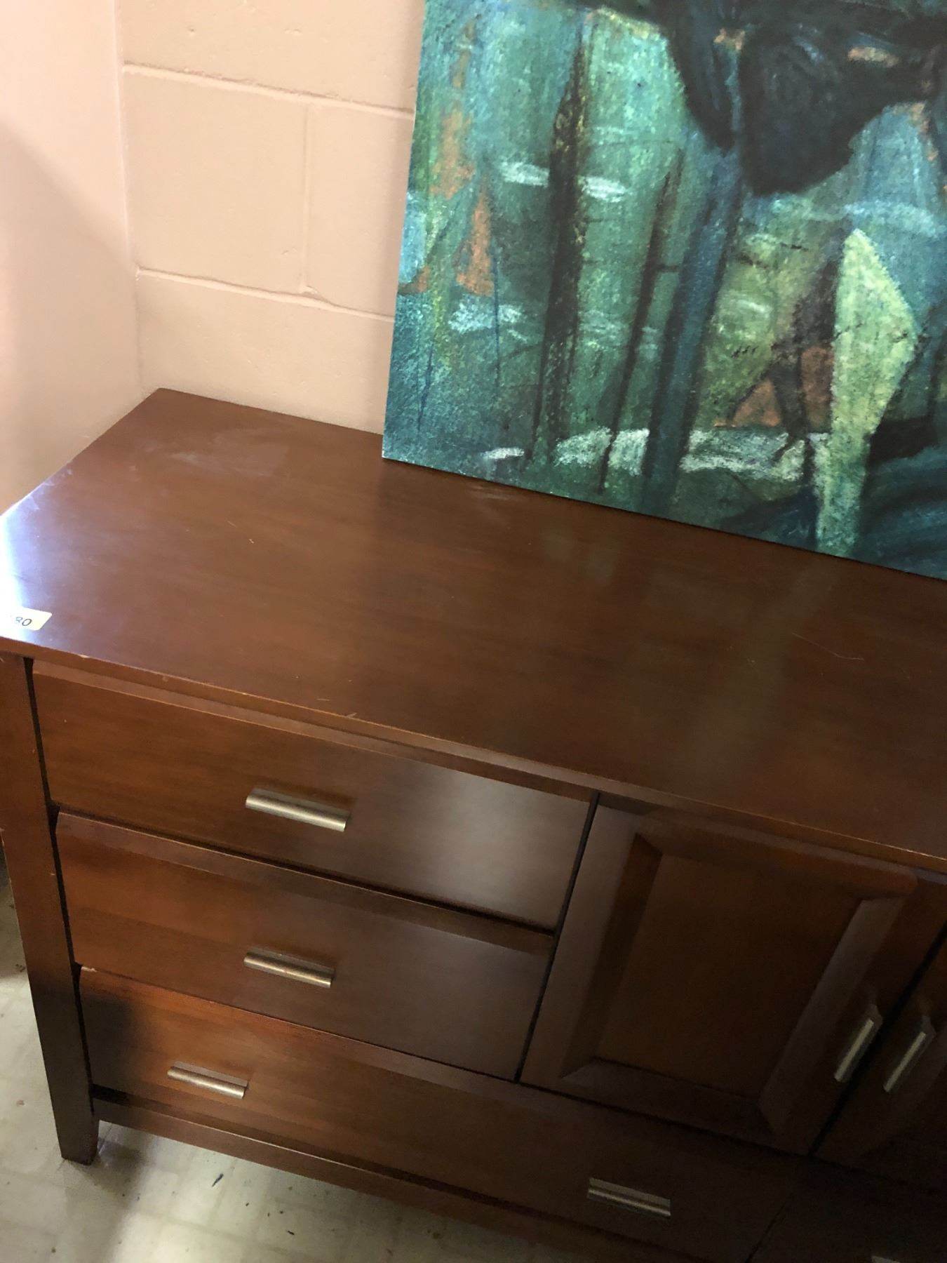 Large wood bedroom dresser with drawers and cupboards plus abstract art.