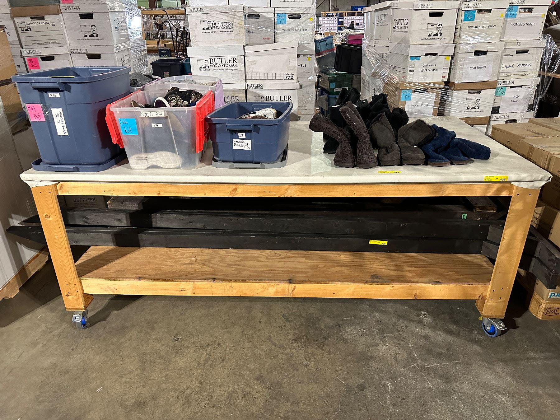 Large wooden framed table on wheels (approx. 96in L 48in D 37in H)