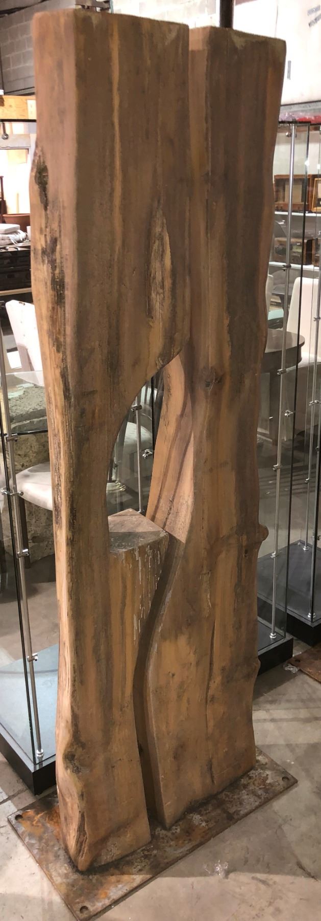 Large wooden sculpture on solid steel plate - approx. 6 1/2ft tall x 2ft wide from the show