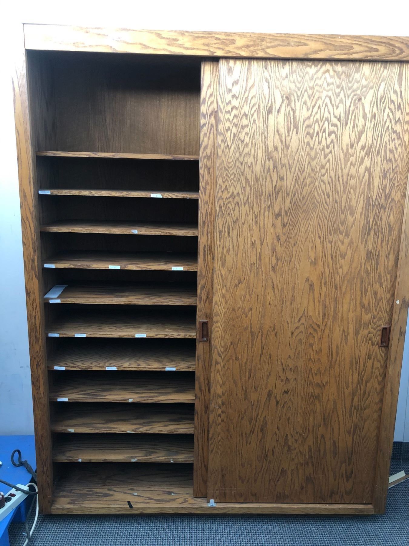 Large wooden storage cabinet w/ sliding doors from the sci-fi show (approx. 6 1/2' tall x 5' across x 1 1/2' wide)