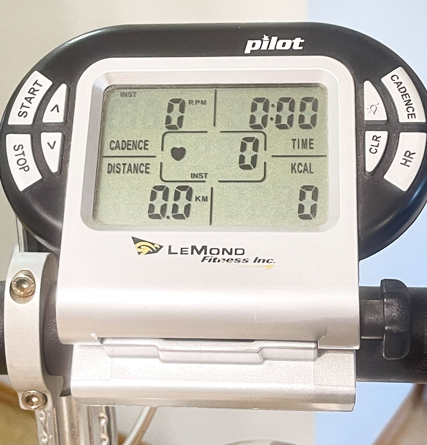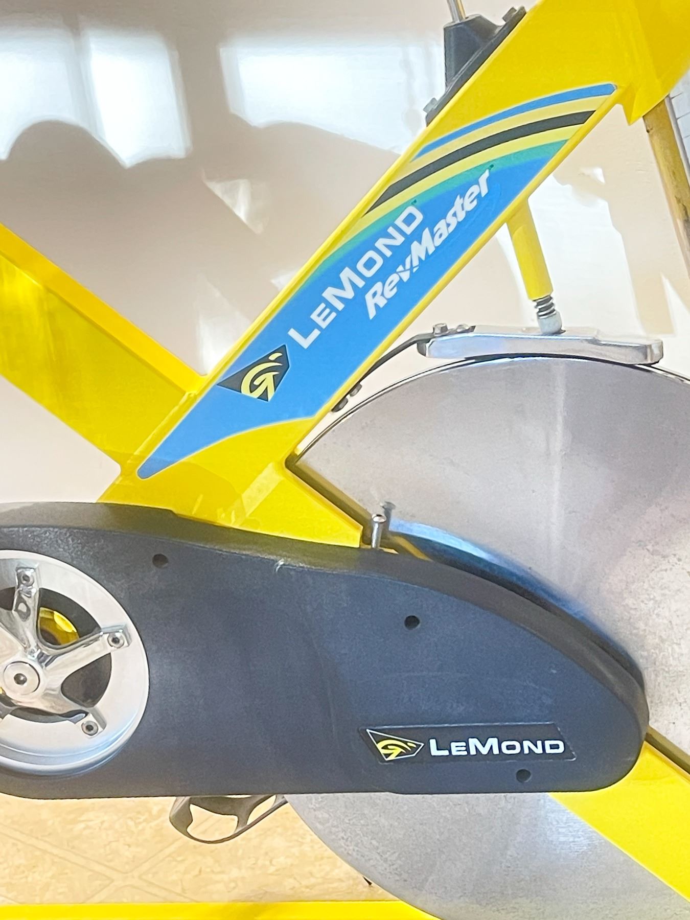 Heavy-duty spin bike with adjustable seat and handlebars. Includes LeMond Pilot display for cadence, distance, calories, and heart rate. Commercial-quality, good working condition. Buyer responsible for moving/loading.